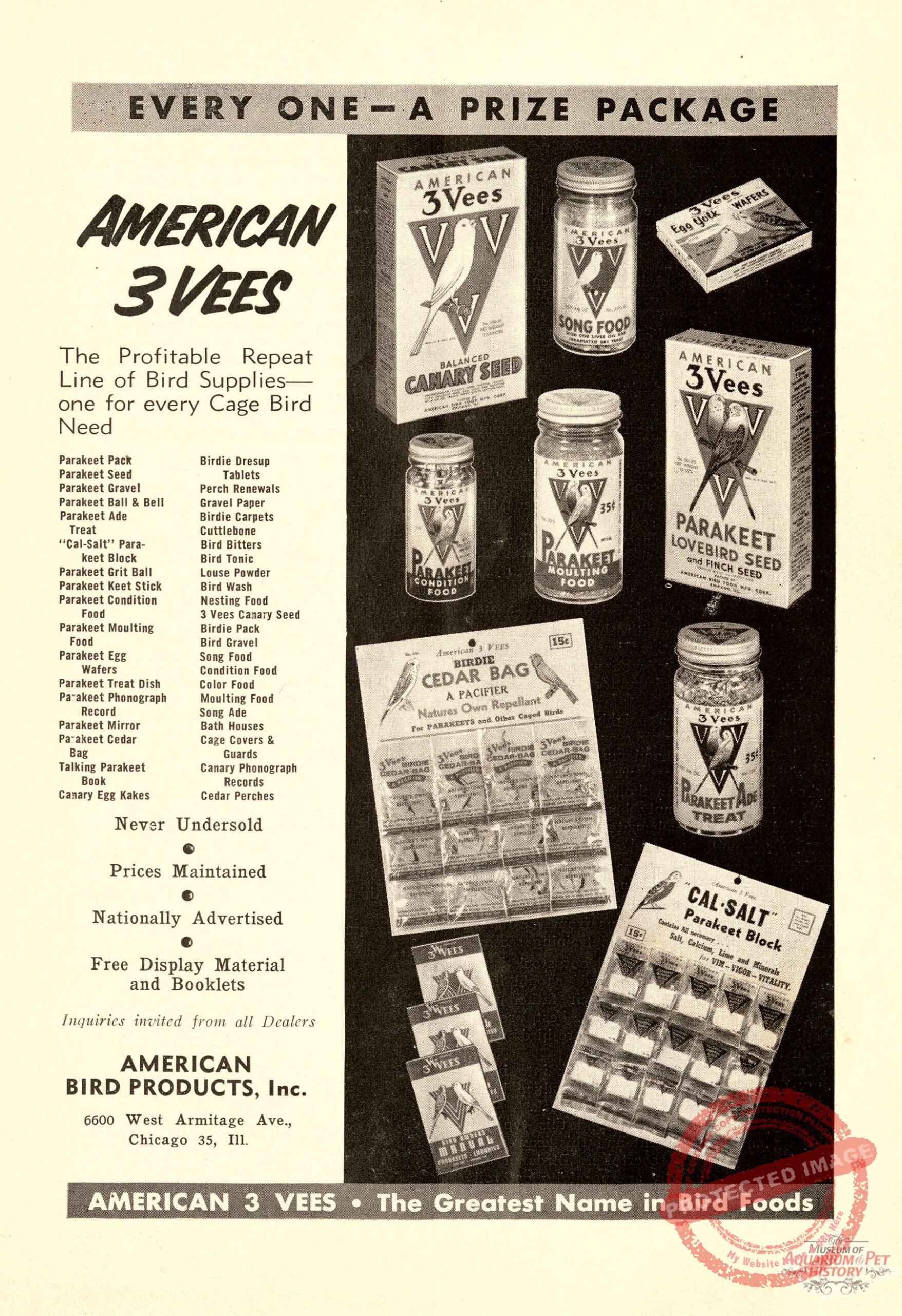 Back to Gallery 1955 American 3 Vees AdNov 6, 2025 A full-page ad listing the 37 bird products American 3 Vees Co. made in 1955. From the July 1955 edition of American Cage Bird Magazine.