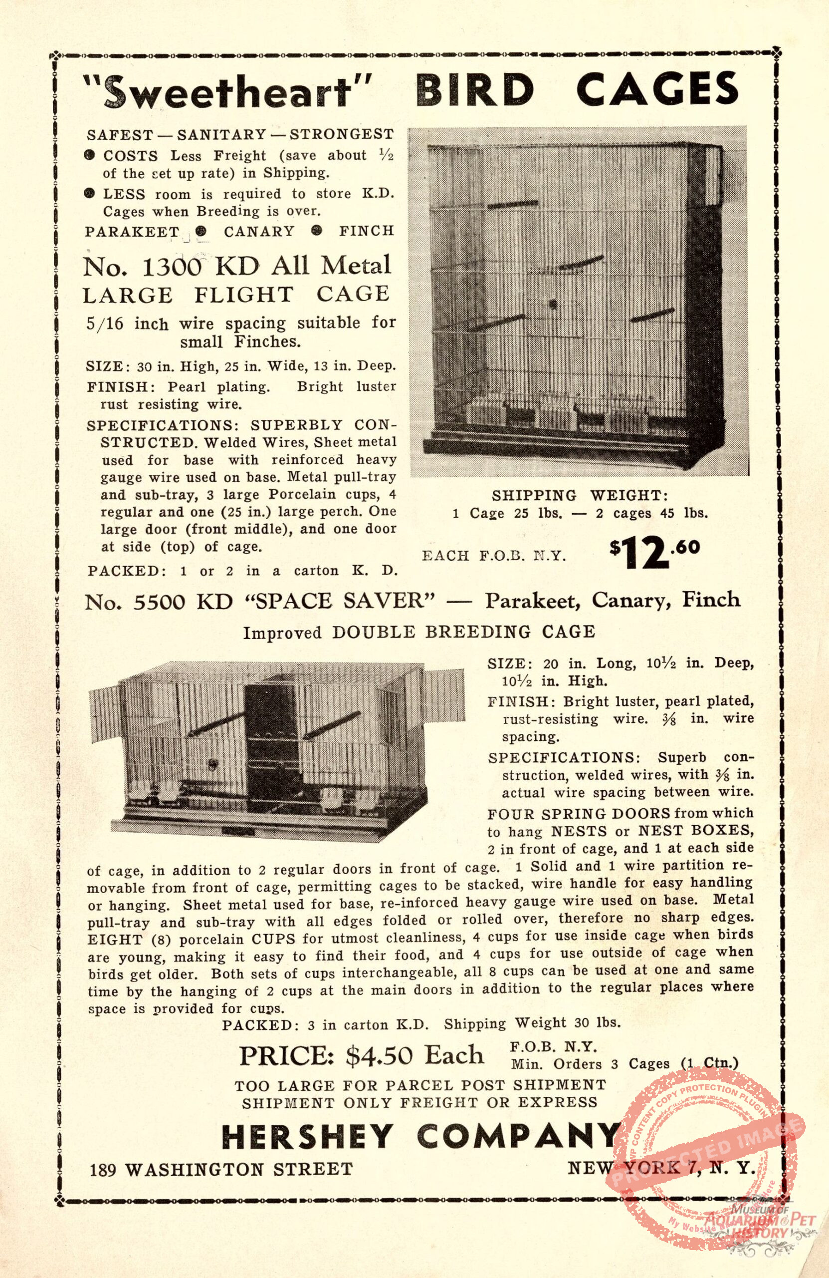 Back to Gallery 1955 Hershey Sweetheart Birdcage AdJan 9, 2026 An ad for an unusual birdcage manufacturer (Hershey Company) that specialized in cages to breed or show birds. From the July 1955 edition of American Cage-Bird Magazine.