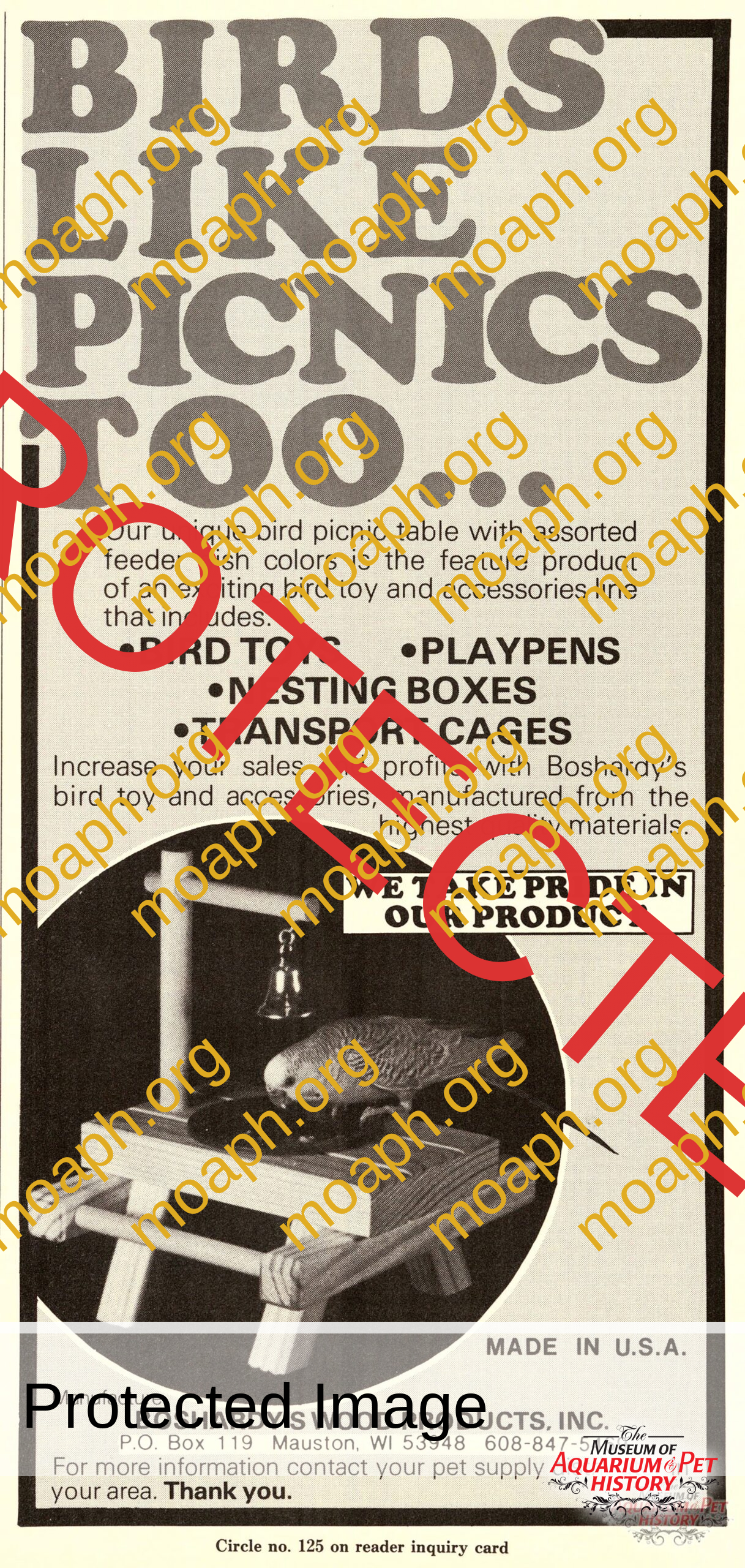 Back to Gallery 1984 Boshardy’s Bird Picnic Table AdJul 11, 2025 A cute “picnic bench” made for your pet parakeet. Made by Boshardy’s Wood Products in the USA. From the June 1984 edition of Pet Dealer Magazine.