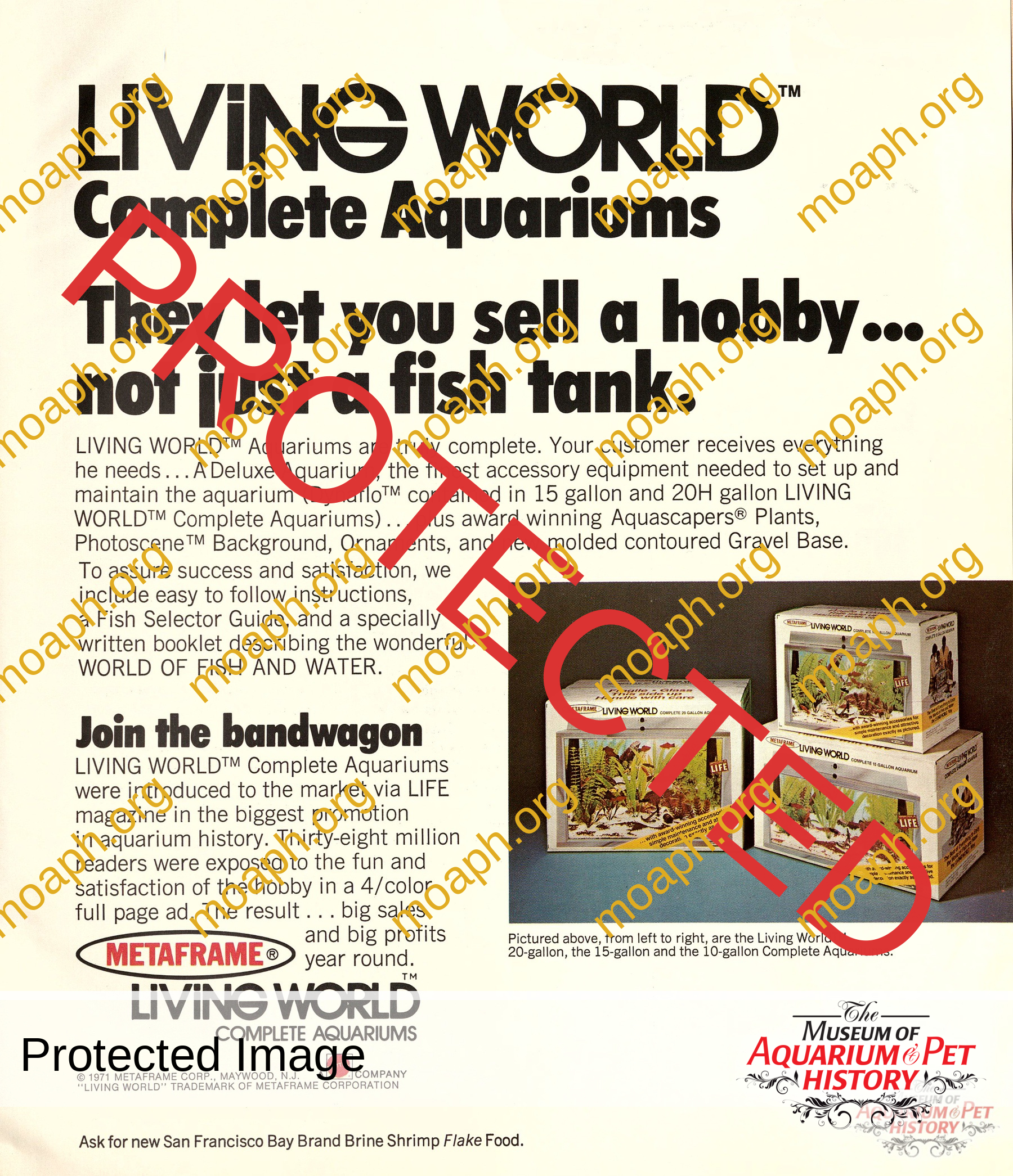 Back to Gallery Living World Complete Aquarium Kit 1972 AdMay 9, 2025 Ad for “Living World” Complete Aquarium Kits by Metaframe (owned by Mattel Toys at the time). From the February 1972 edition of Pets/Supplies/Marketing.