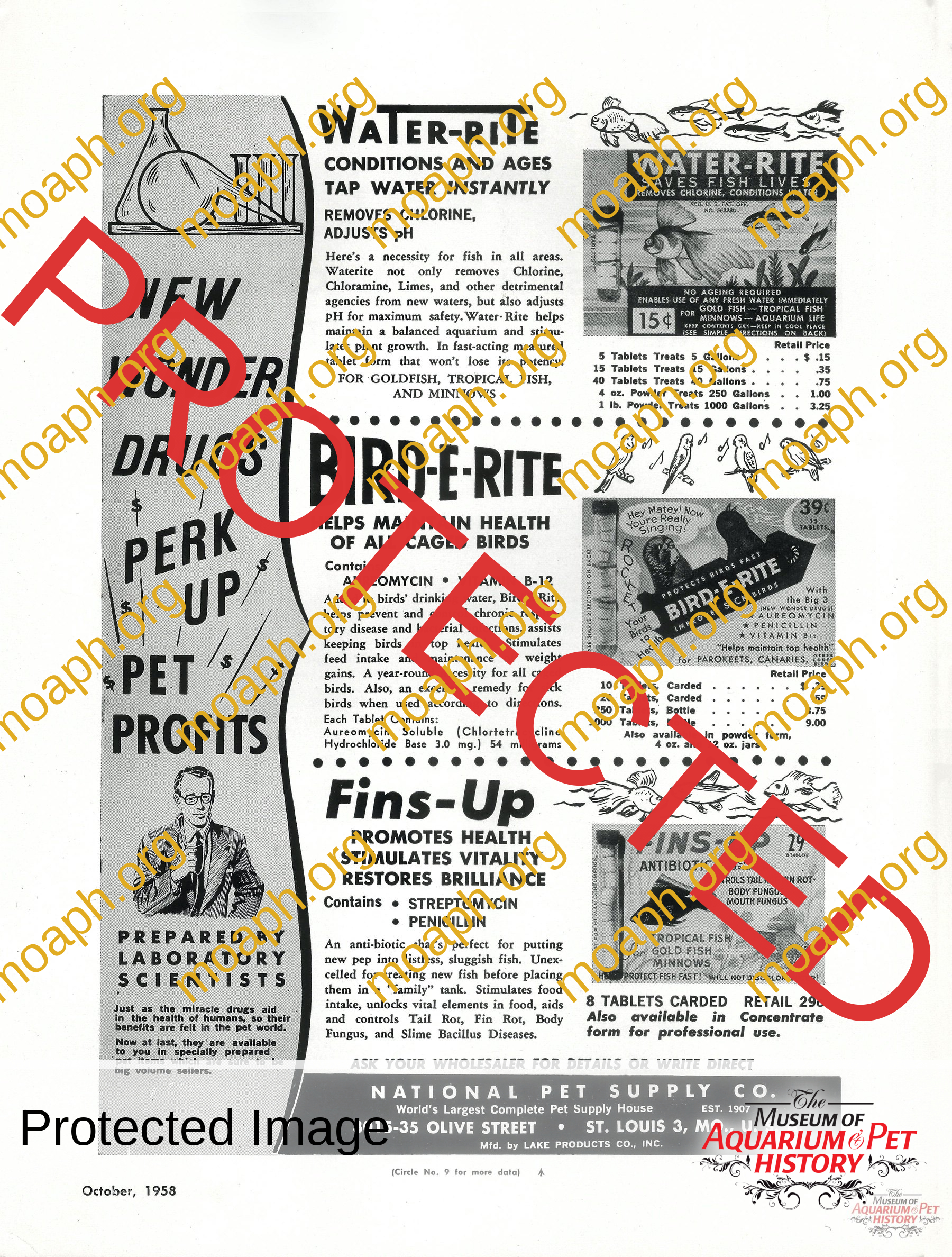 Back to Gallery National Pet Supply Ad by Pet Shop Management Magazine | Nov 4, 2022 National Pet Supply AD from October 1958 Pet Shop Management for Water-Rite, Bird-E-Rite, and Fins-Up conditioners and medications.
