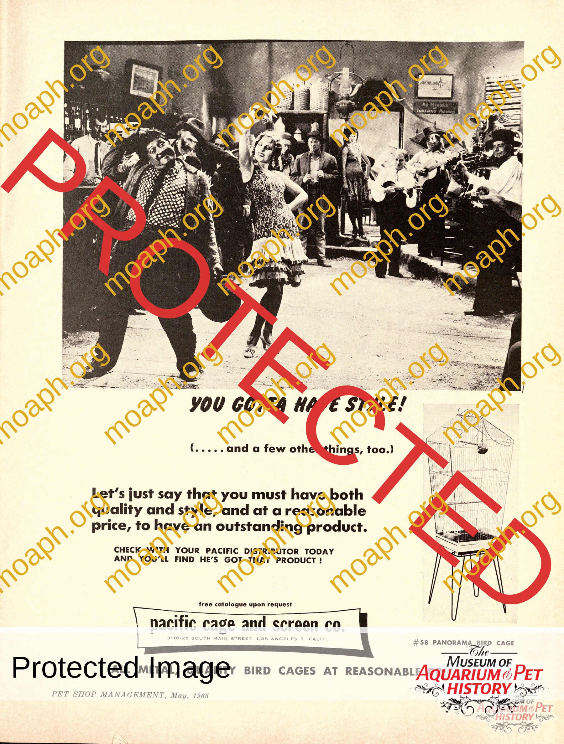 Back to Gallery Pacific Cage and Screen Co 1965 AdMay 9, 2025 A crazy bar scene ad that advertises a mid-century bird cage from Pacific Cage and Screen Co., of Los Angeles. From the May 1965 edition of Pet Shop Management.