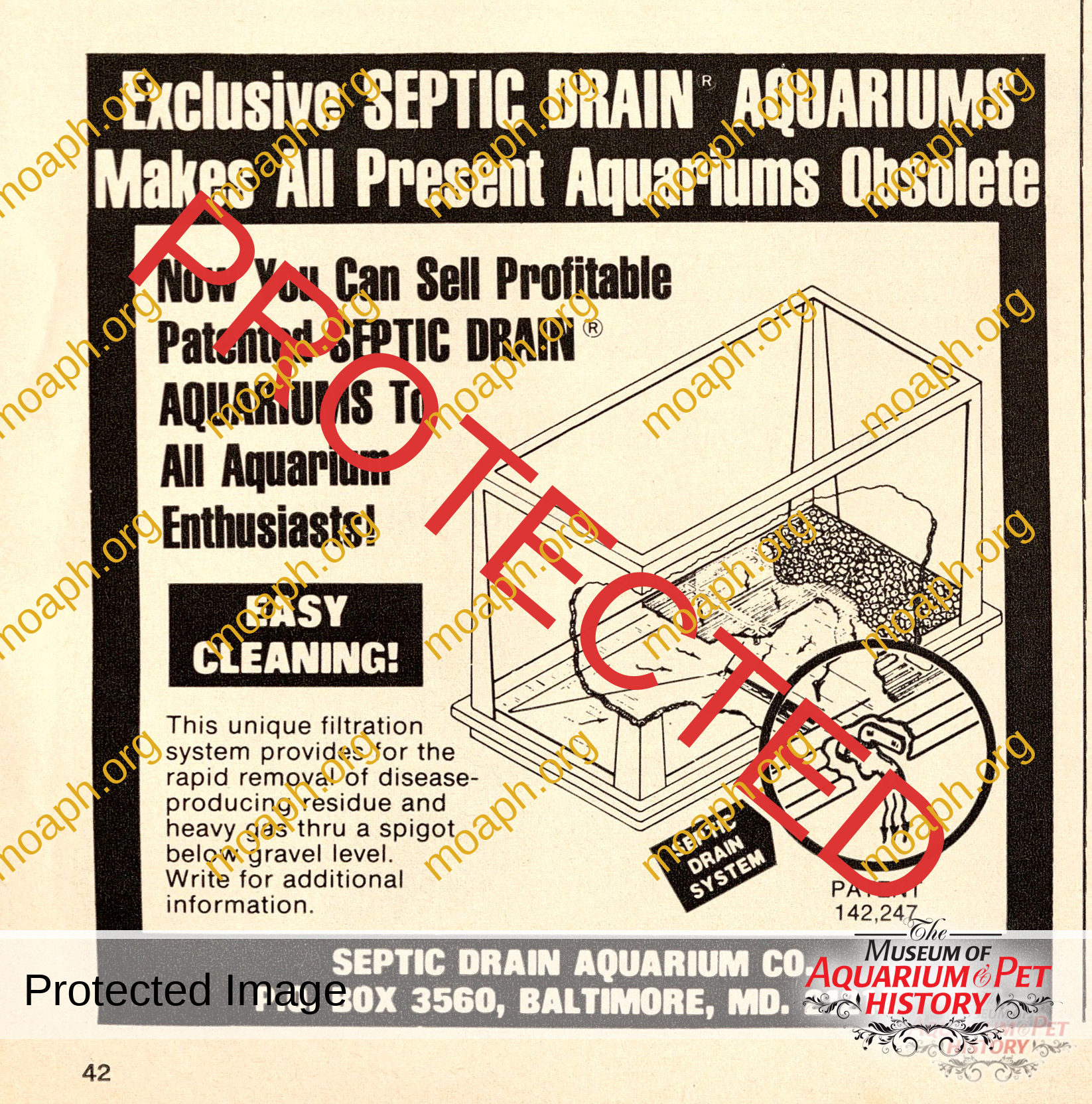 Back to Gallery Septic Drain Aquarium 1972 AdMay 9, 2025 Interesting “Septic Drain” Aquarium allowing for easy cleaning. Manufactured by Septic Drain Aquarium Co. Ever seen one? From the February 1972 edition of Pet/Supplies/Marketing.