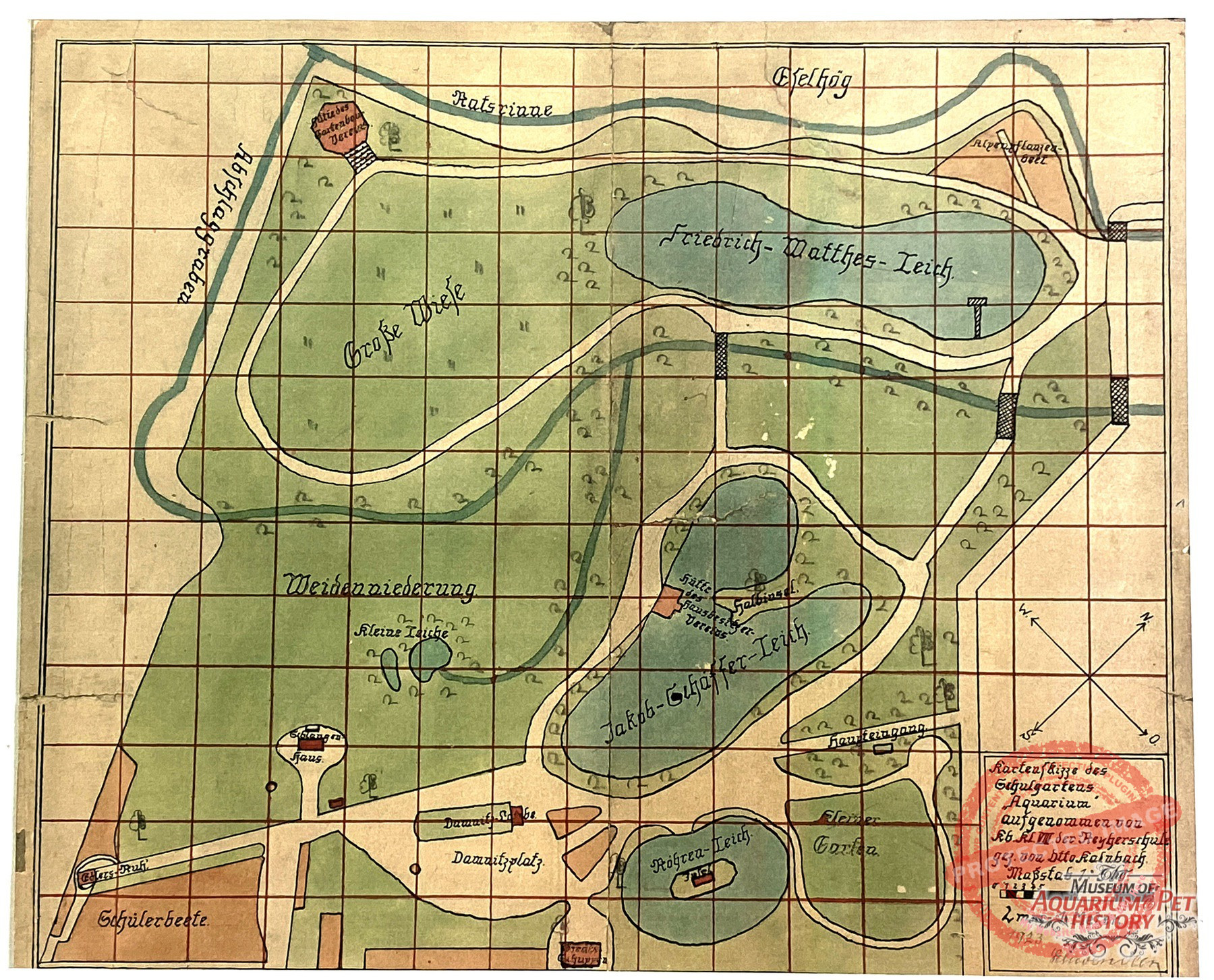 “The local society ‘Aquarium’ has taken care to transform the vicinity of the pond it has used—the Röhrenteich, formerly of poor appearance—into a pleasant place of sojourn. The many trees, shrubs, and plants that have been set out thrive exceedingly well; the various aquatic plants within the pond extend themselves on every side. The sand paths, winding serpent-like between fresh lawns, give the whole a park-like character, and every visitor takes delight in watching the multitude of little fishes darting and frolicking in the pond.”