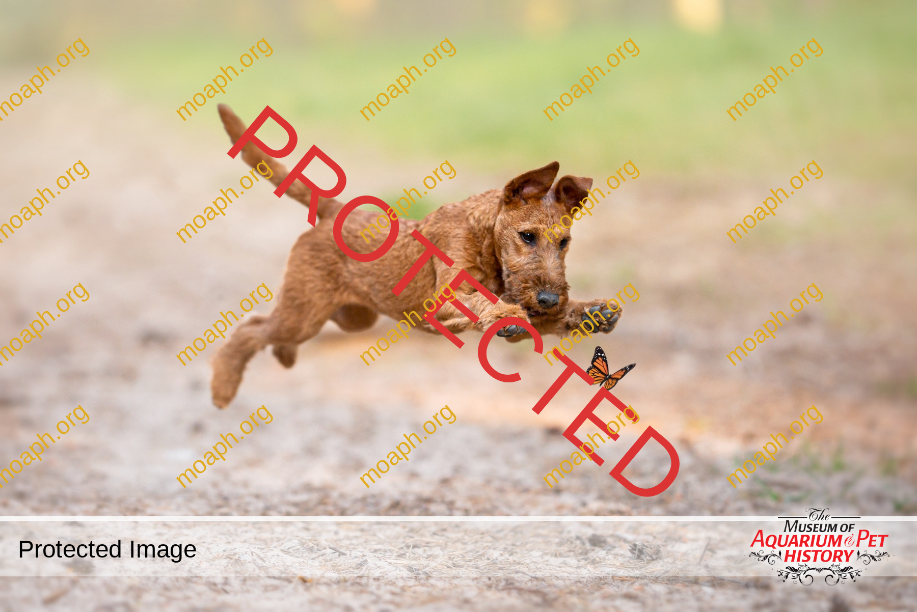 Bred in Ireland for hunting, guarding, and vermin control, the Irish terrier has been documented since the 19th century, although its exact origins are not documented. The breed has a quite distinctive fiery red and wiry-textured coat. Its lean, athletic build and fearless spirit earn it the nickname “daredevil.” and it is known in its homeland under its Gaelic name of Brocaire Rua. Loyal and affectionate, it makes a versatile companion, and by the 1880s, it ranked fourth, in the list of the most popular dog breeds of the Britain and Ireland.