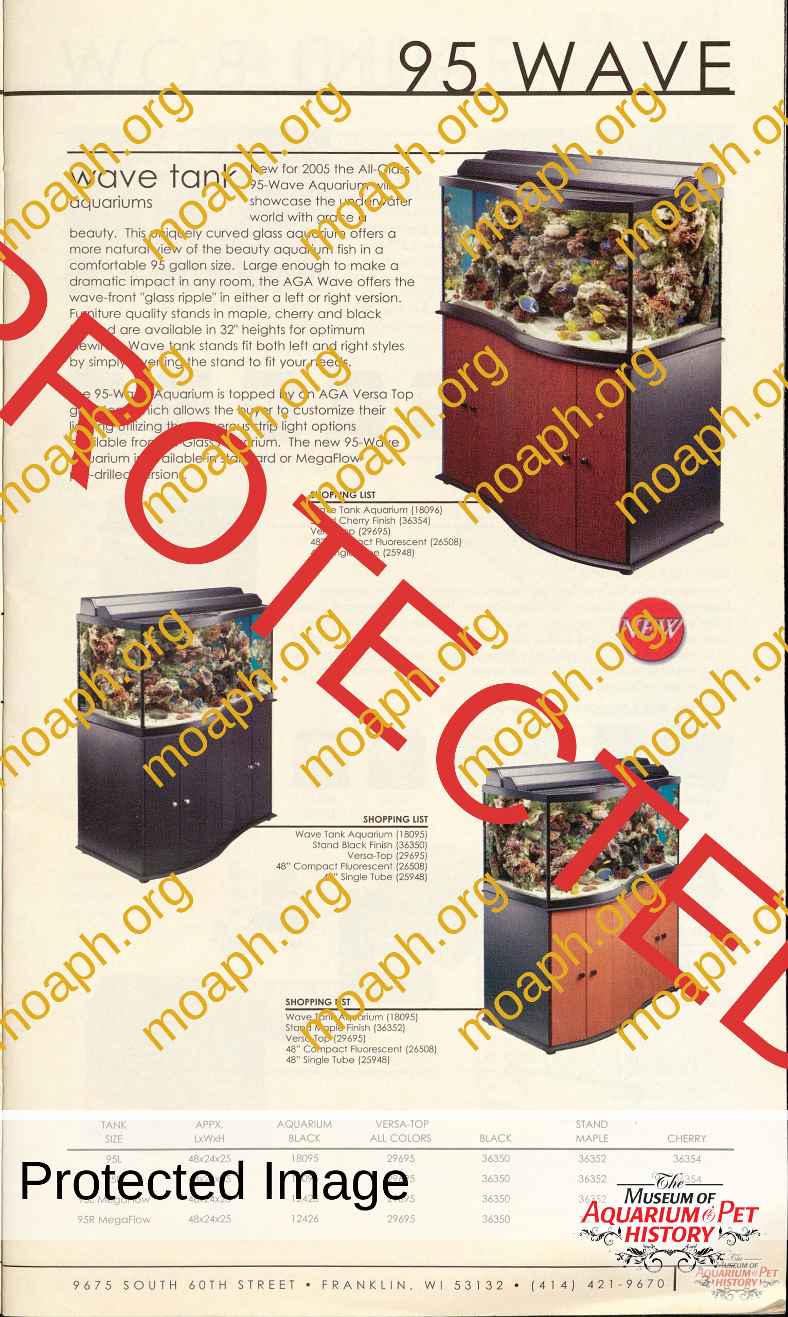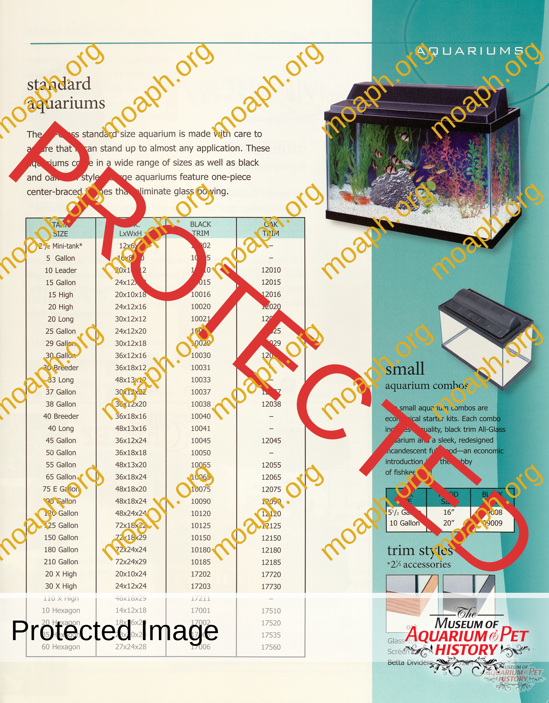 The Ritzow Bros. were brilliant engineers and marketers because they had a vision and developed many innovations that turned the fish aquarium into a piece of furniture that you would be proud to have in your living room instead of the garage. Their innovations included one piece plastic frames in sizes up to 220 gallon, state of the art full hoods with incandescent and fluorescent lighting, knock down wood aquarium stands, solid wood cabinets and canopies, bow front aquariums and stands in many sizes and mini-bow desktop aquariums. They started out with black frames only, then walnut wood grain finishes and ultimately introduced the revolution into oak trimmed aquariums.