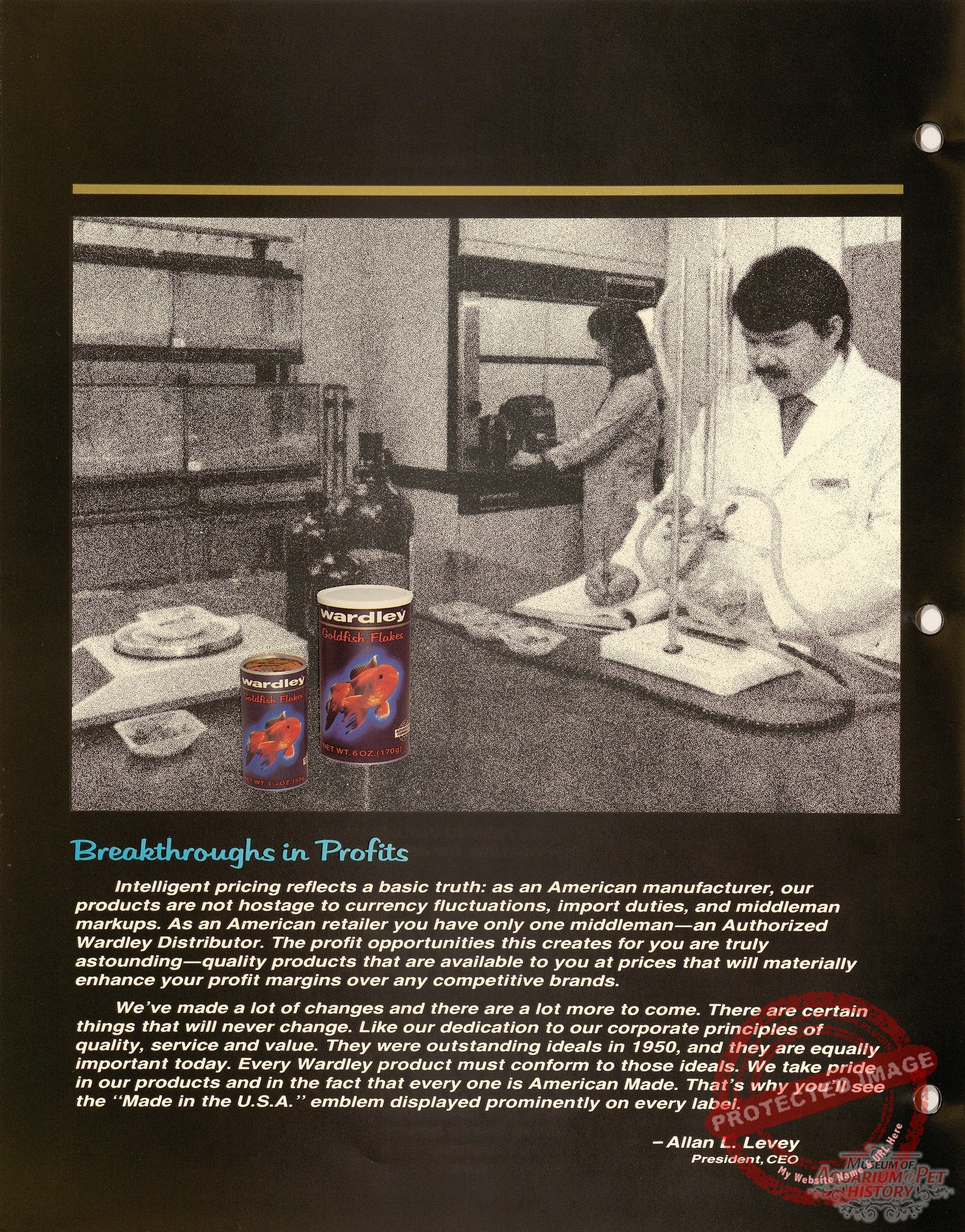 The Wardley Corporation was established in 1950, as a family business and started as a distributor of Wil-Nes aquarium pumps and filters, Happiness bird cages, Stutzman aquariums and Long Life fish foods. The name Wardleys came from Allan’s father, Edward (the Ward), and (the ley) from their last name Levey. Allan’s father Edward and Allan were the sole employees in the beginning. Edward Levey was no beginner to our industry as he worked for Harold Pet Supply Company, which became Eight in One and was owned by his sister Frances. At the age of 60, Allan’s father decided his future was as a manufacturer of fish foods.