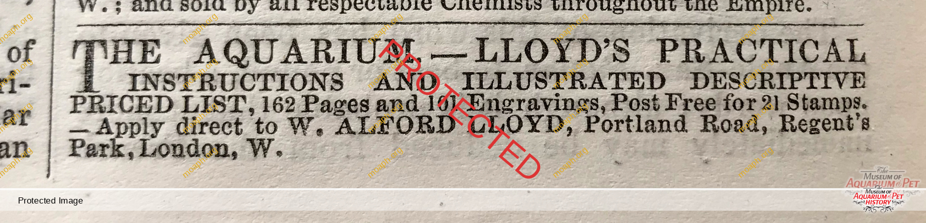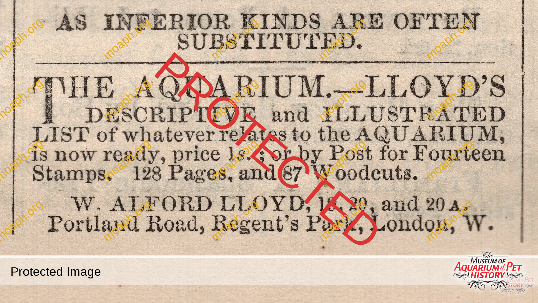 In order to increase sales and reputation, in 1856 Lloyd assembled a basic price list for his customers, followed by a second list a year later. The true masterpiece arrived though in August 1858, “A List, with Descriptions, Illustrations, and Prices, of whatever relates to Aquaria”, the father of all aquarium catalogs and price lists.