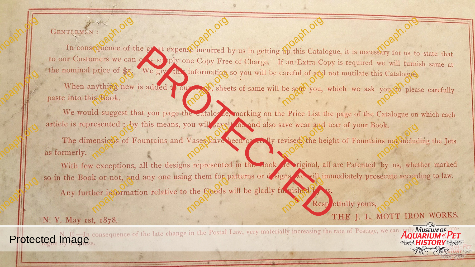Among the most important catalogs from the late years of the Victorian era, we cannot fail to mention the ones issued by the two premium companies which made aquariums (actually a small part of their huge business) in the United States, the J. W. Fiske Company and the J.L. Mott Iron Works. The early editions contain stunning illustrations of fountain aquariums, parlor aquariums, rectangular fish tanks and stands making these catalogs highly desirable works of art.