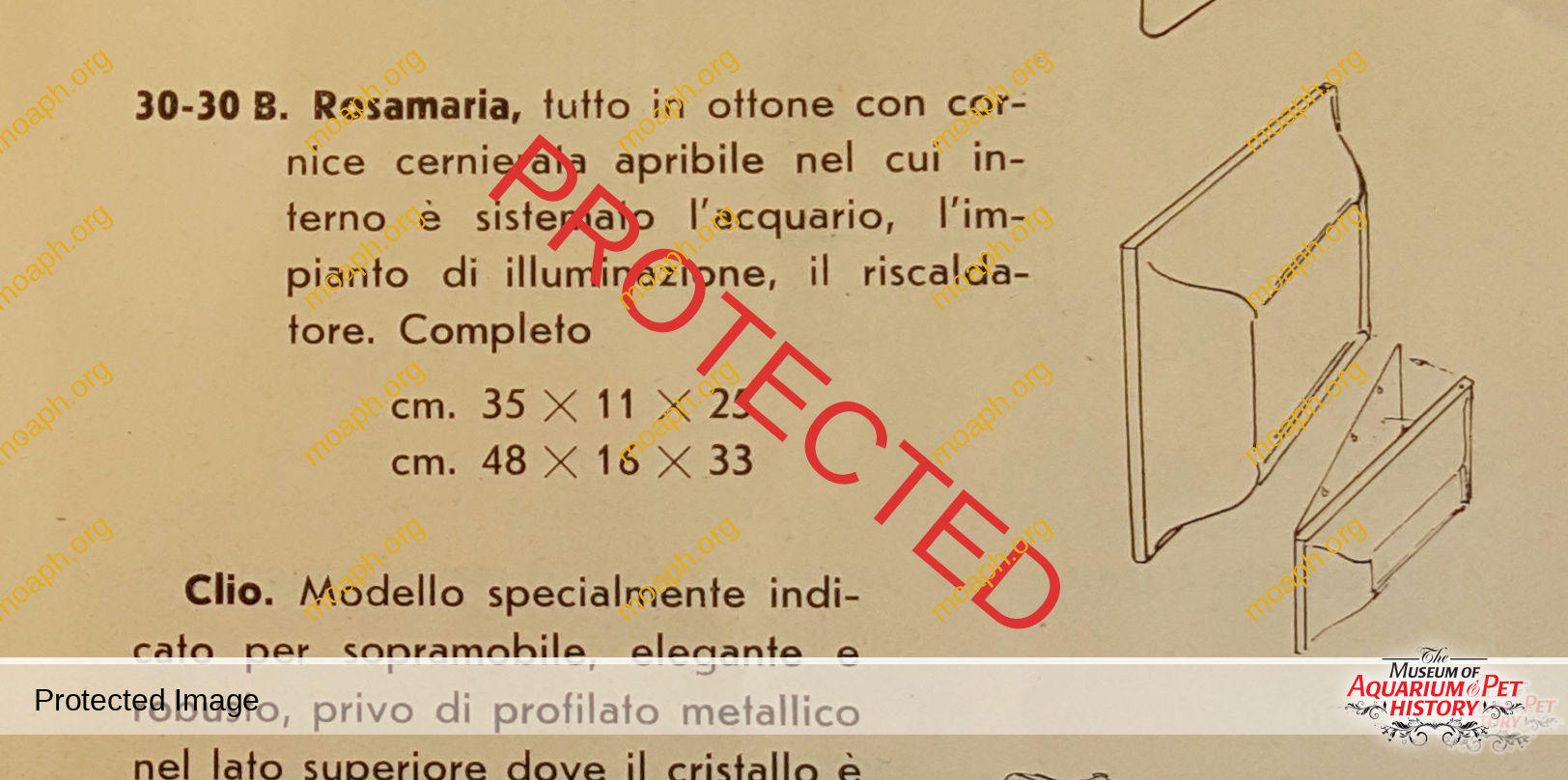 Besides standard shape fish tanks, the catalog promoted unusual lantern aquariums and picture frame aquariums including the “Rosamaria” model, a wall fish tank named after De Santis’ beloved daughter.