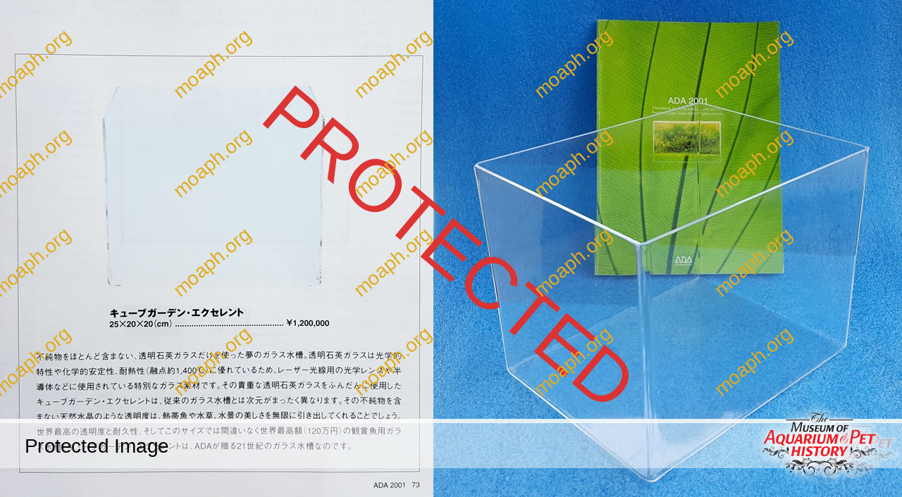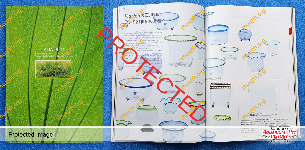 Another two valuable targets for collectors are both the ADA general catalog from 1994, popular as “the catalog with a frog on the cover,” and the ADA 2001 catalog, also known as the “leaf catalog” or “the green one”! Pages 72 and 73, notably, make the leaf catalog very special as they depict Amano’s collection of antique Japanese fishbowls, and the enigmatic “Cube Garden Excellent” (this is the translation I had from a Japanese friend of mine). The story behind this small fish tank (L25x- W20xH20 cm – L9.8”xW7.9”xH7.9”), which never went into a regular production, is almost a legend. At the end of the 1990s, Amano decided to produce the perfect aquarium using the clearest glass ever manufactured for the aquarium industry, a minimalist museum piece ready to go on the Guinness World Record book. In 2001, the publication date of the leaf catalog, the price for this small treasure averaged around $9,900 (¥ 1,200,000).