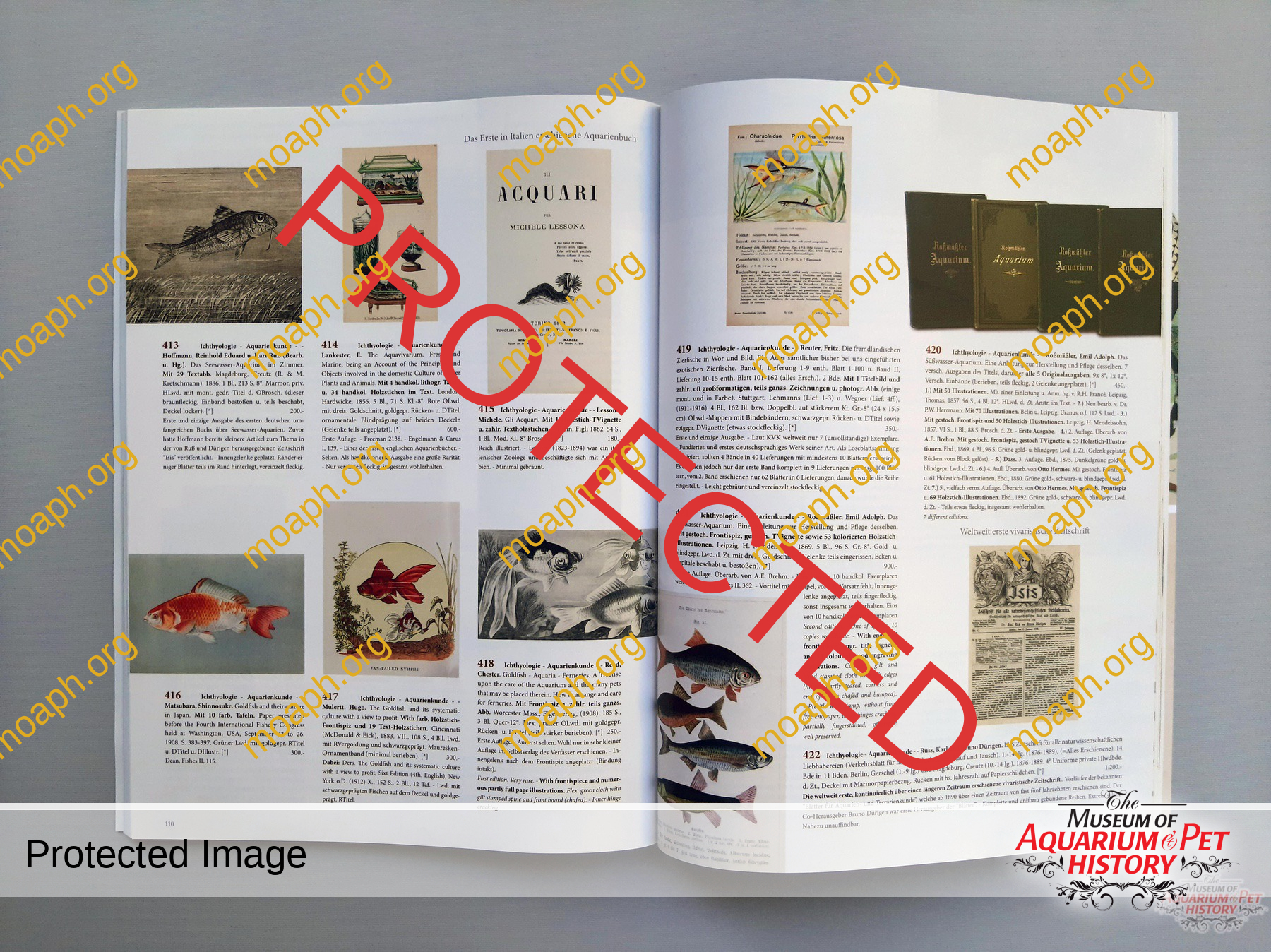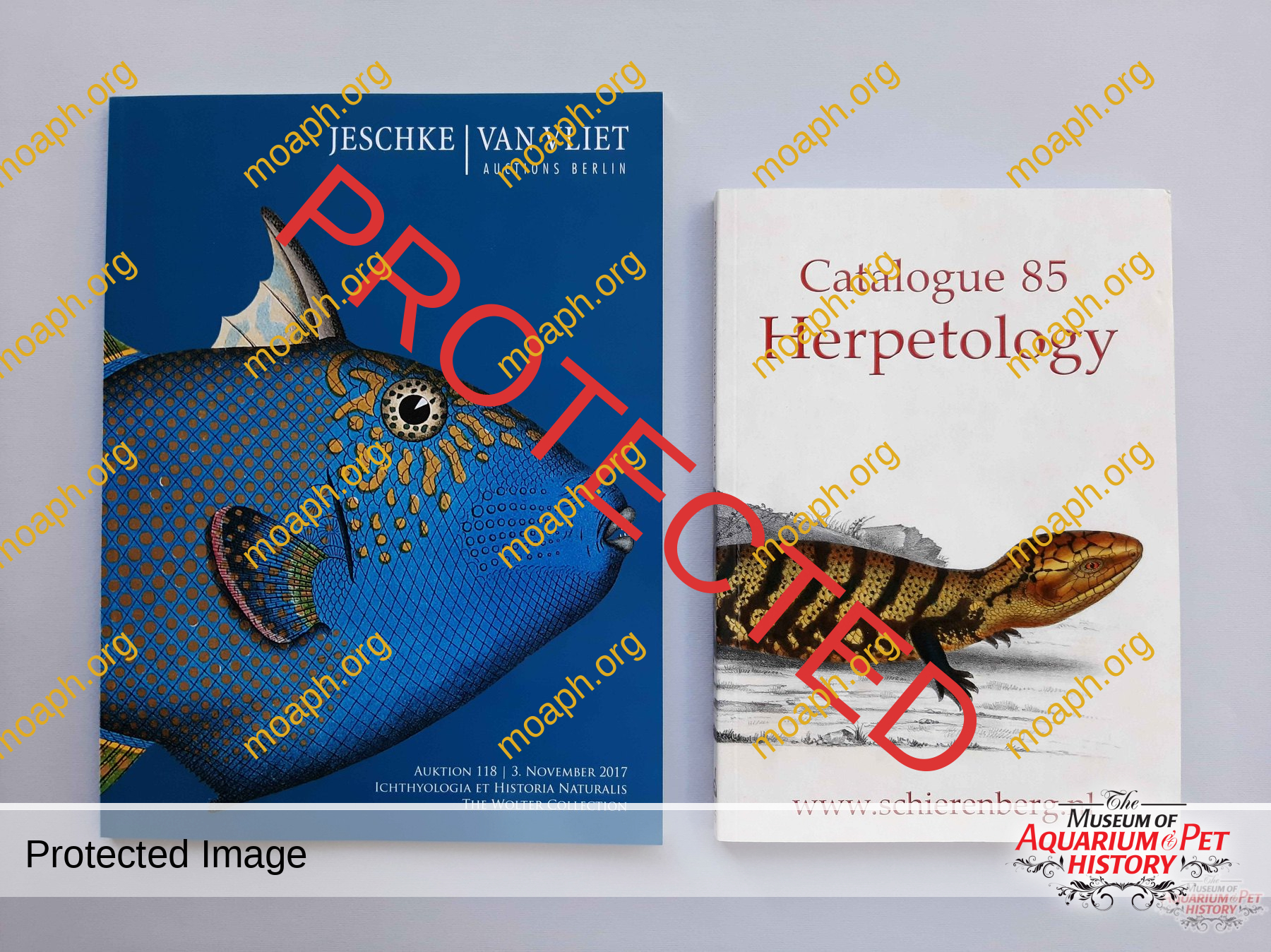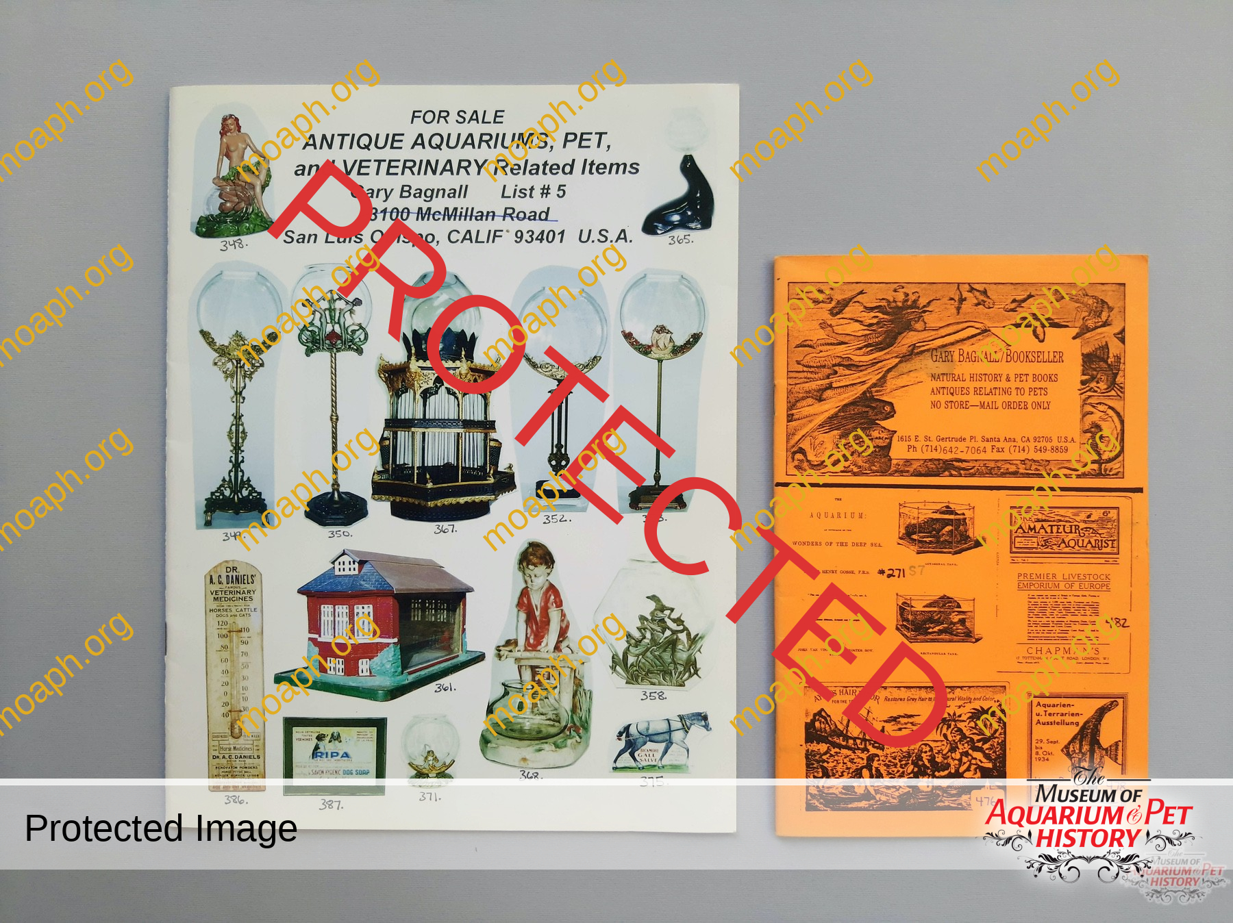 Antiquarian booksellers’ catalogs are very similar to auction catalogs and equally of great interest. Surfing on eBay I came across two special, old-school catalogs issued in the 1980s by Gary Bagnall, the founder of the MOAPH. They both contain a funny, exciting mix of books, mags and catalogs, but also aquariums, fishbowls, fish food tins and other old stuff for the pre-web collectors of that time. I have never seen other catalogs with this variety of aquarium treasures. About their graphic layout, I prefer to say “no comment Gary”!
