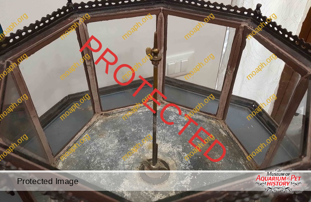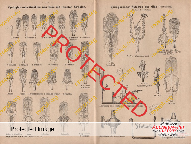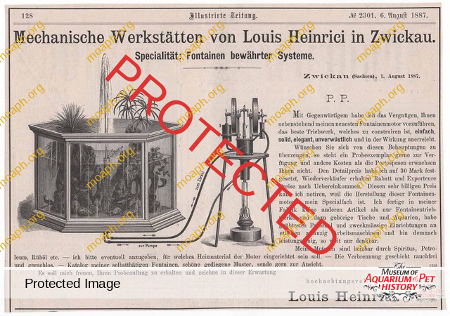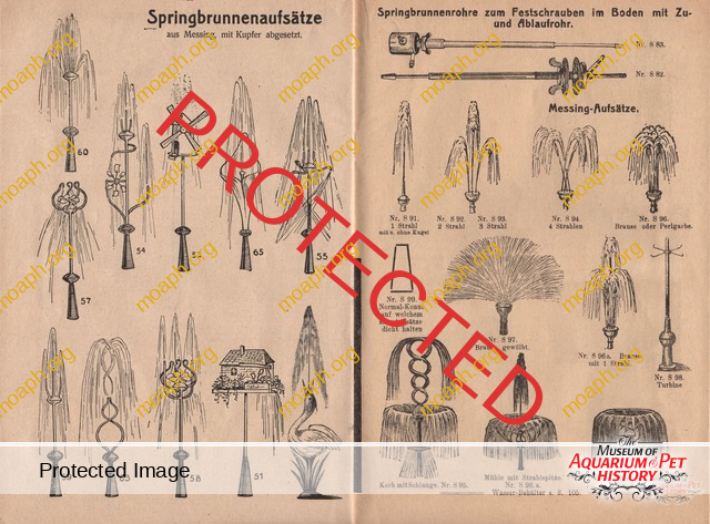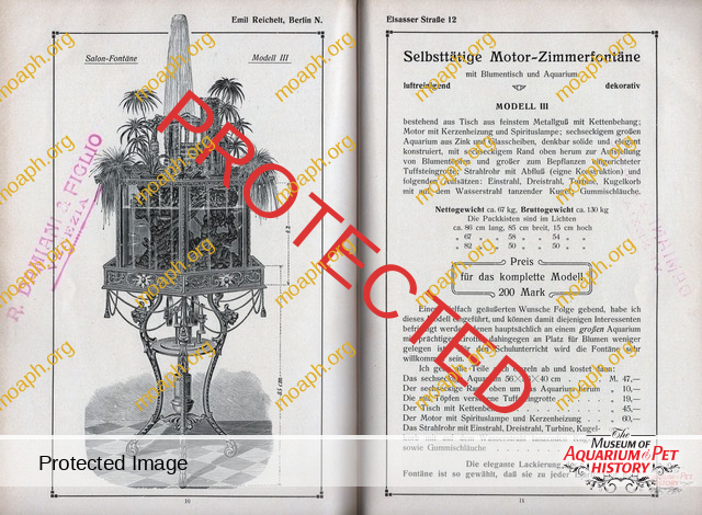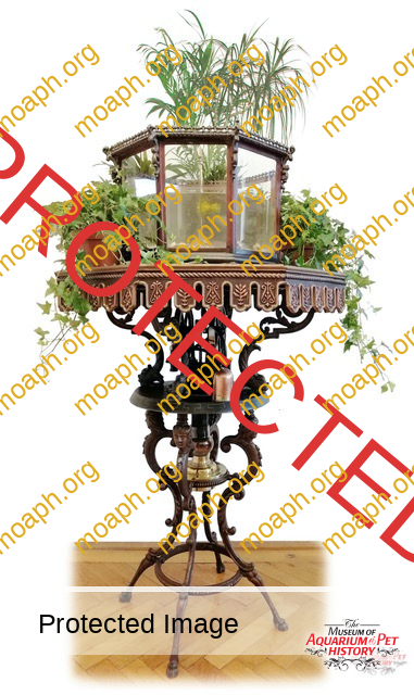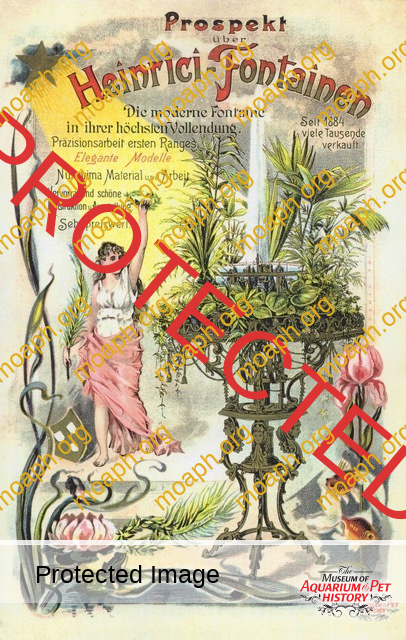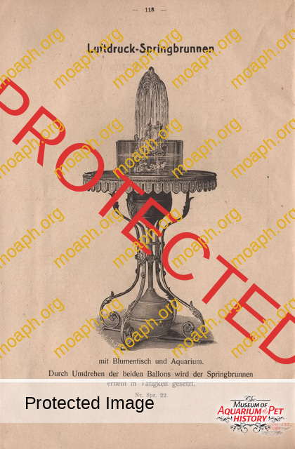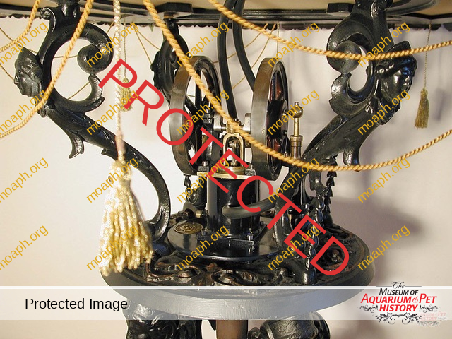 Among the most beautiful and sought aquariums from the period between the early 1880s and the beginning of the First World War, there were without a doubt the German-made parlor fountains driven by hot air engines. The first company to understand the potential of this product, which became very trendy in the upper-class living rooms of important cities such as Vienna and Berlin, was Raab of Zeitz (Saxony). Optician and precision mechanic, Hubertus Raab (1853-1922) started producing hot air engines and parlor fountains in the early 1880s, eventually reaching the pinnacle of success around 1900.
