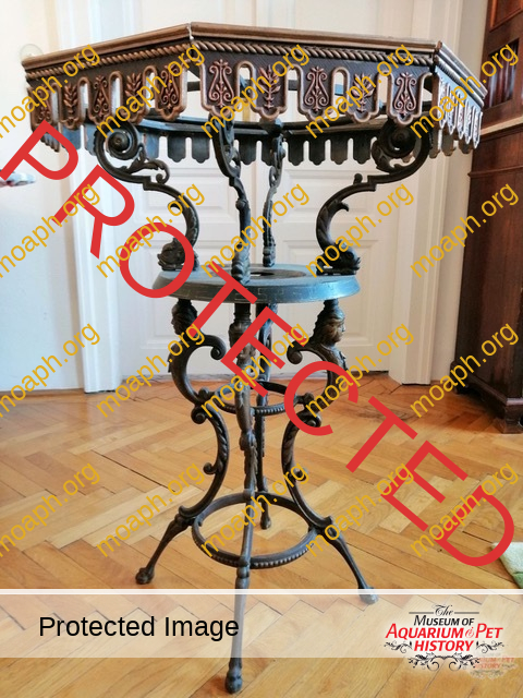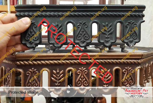 Now let’s talk about the stands. They were made of cast iron, usually with four legs and without any trademark or model number or manufacture date engraved in the metal. You can find some in original condition with the right patina and others repainted (often in the wrong way), and they are the classic starting point for a restoration project. The planters with their ornate edges are instead harder to find, and the same can be said about the metalworkers able to reproduce copies. On the subject of stands and planters, it is important to notice that Raab and Heinrici for some of their fountain models shared identical designs, keeping them unchanged for many years. In the case of these similar parlor fountains, therefore, the manufacturer’s name and model number are conventionally assigned relying on the engine manufacturer’s name and on the shape of the fish tank. Regarding the fish tanks we can state, with the inevitable exceptions, that Heinrici preferred octagonal and hexagonal tanks with zinc frame, Raab on the other hand all-glass rounded aquariums.
