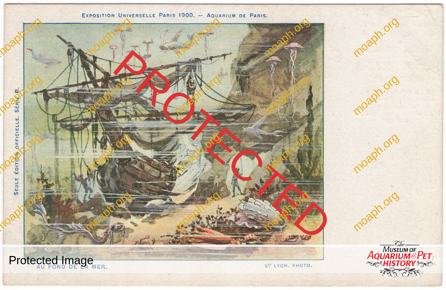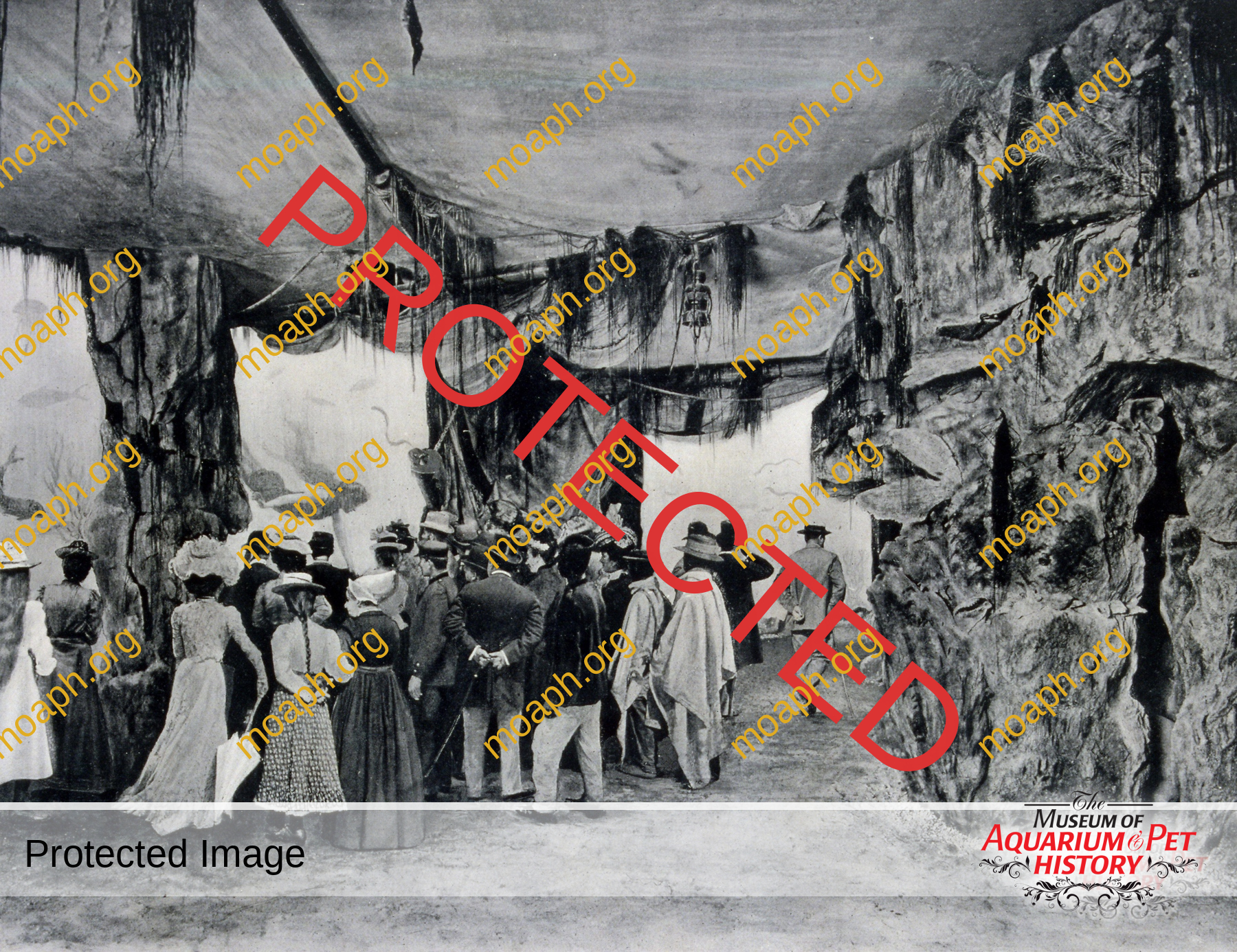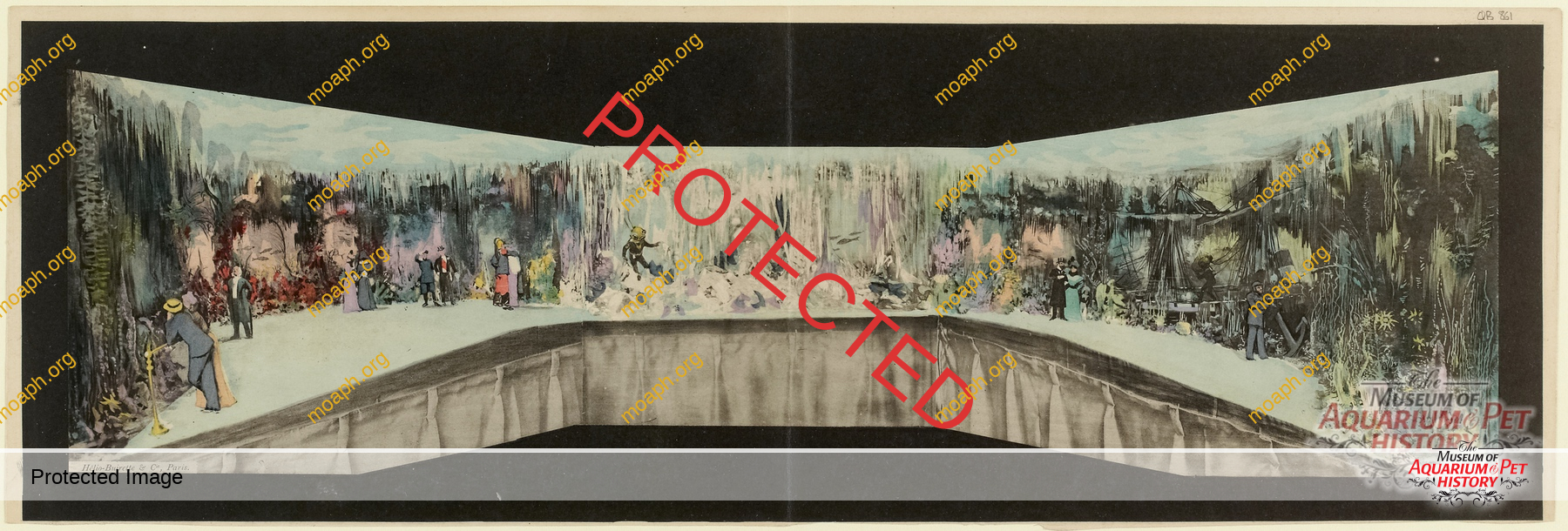 According to the safety standards of the time (almost non-existent!), the exhibition hall could welcome up to 500 visitors at once. It was lavishly decorated with rocks, seashells, gorgonians, hanging seaweed as well as many other dried marine-sourced materials. The most striking and iconic decoration, however, was a real shipwreck. The bow of the remains of this vessel greeted visitors at the start of the exhibit, while the hull extended in a continuous perspective into the tank No. II, which was one of the two largest basins of the Aquarium thanks to its 18,500 gallons (70 cubic meters) capacity.