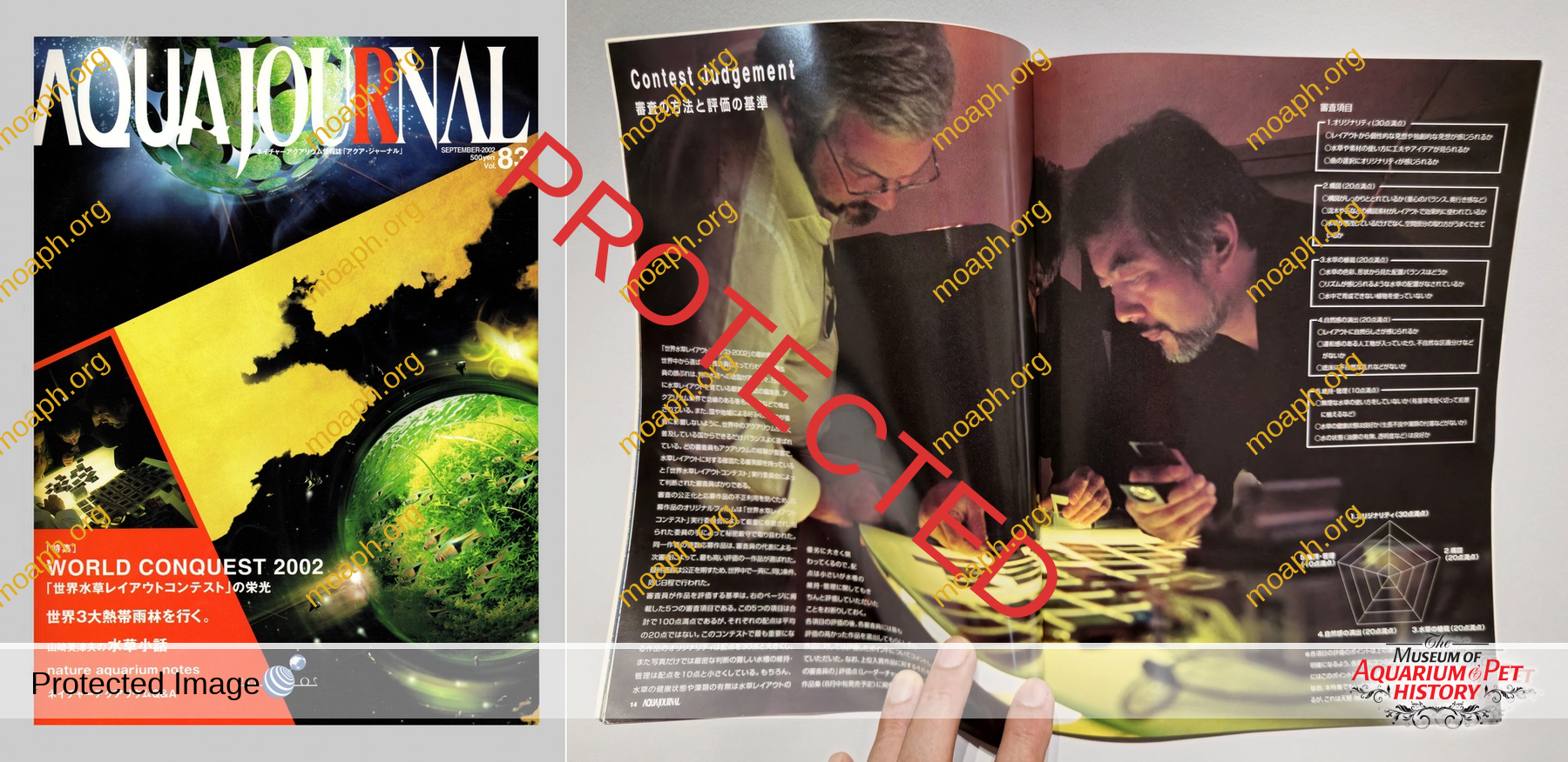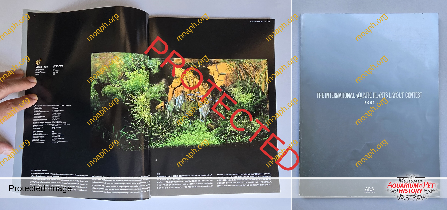 The first International Aquatic Plants Layout Contest took place in 2001. The booklet issued by ADA to commemorate that event is nowadays a rare collectible. Among 557 entries from 19 countries, the layout made by Mitsuhiro Machida (Japan) won the contest and a prize of a million yen. The Nature Aquarium Party held in conjunction with the contest became an annual event as well. Among the 17 judges (including Amano) of the event from all over the world, there were: Herbert R. Axelrod, Bernd Degen, Kaspar Horst, Francesco Nardelli, and Holger Windeløv.