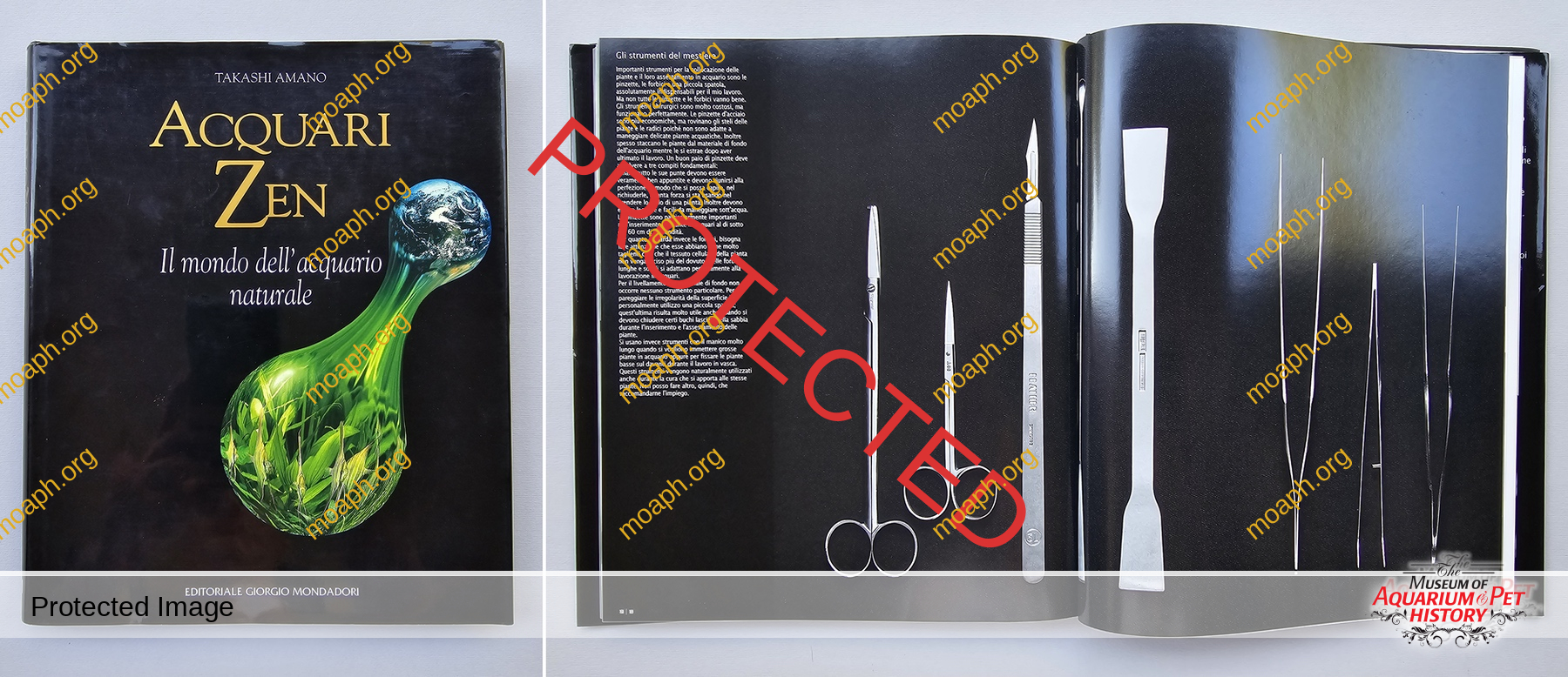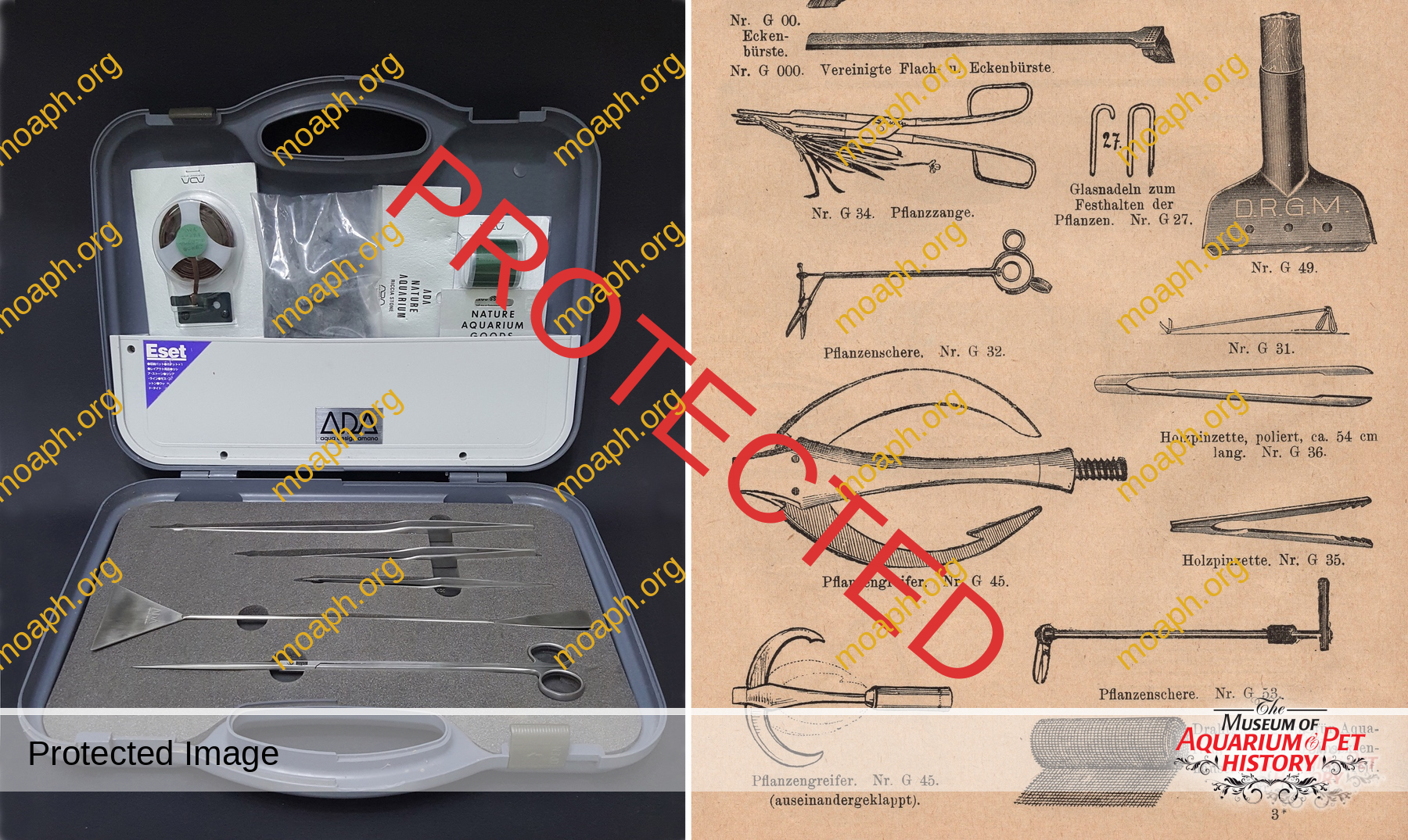 First release (old logo) of the popular ADA tool set. This vintage example from the author’s collection was used during a few workshops by Amano. On the right, an array of tools for the maintenance of aquarium plants available at the beginning of 20th century (A. Glaschker catalog, Germany).