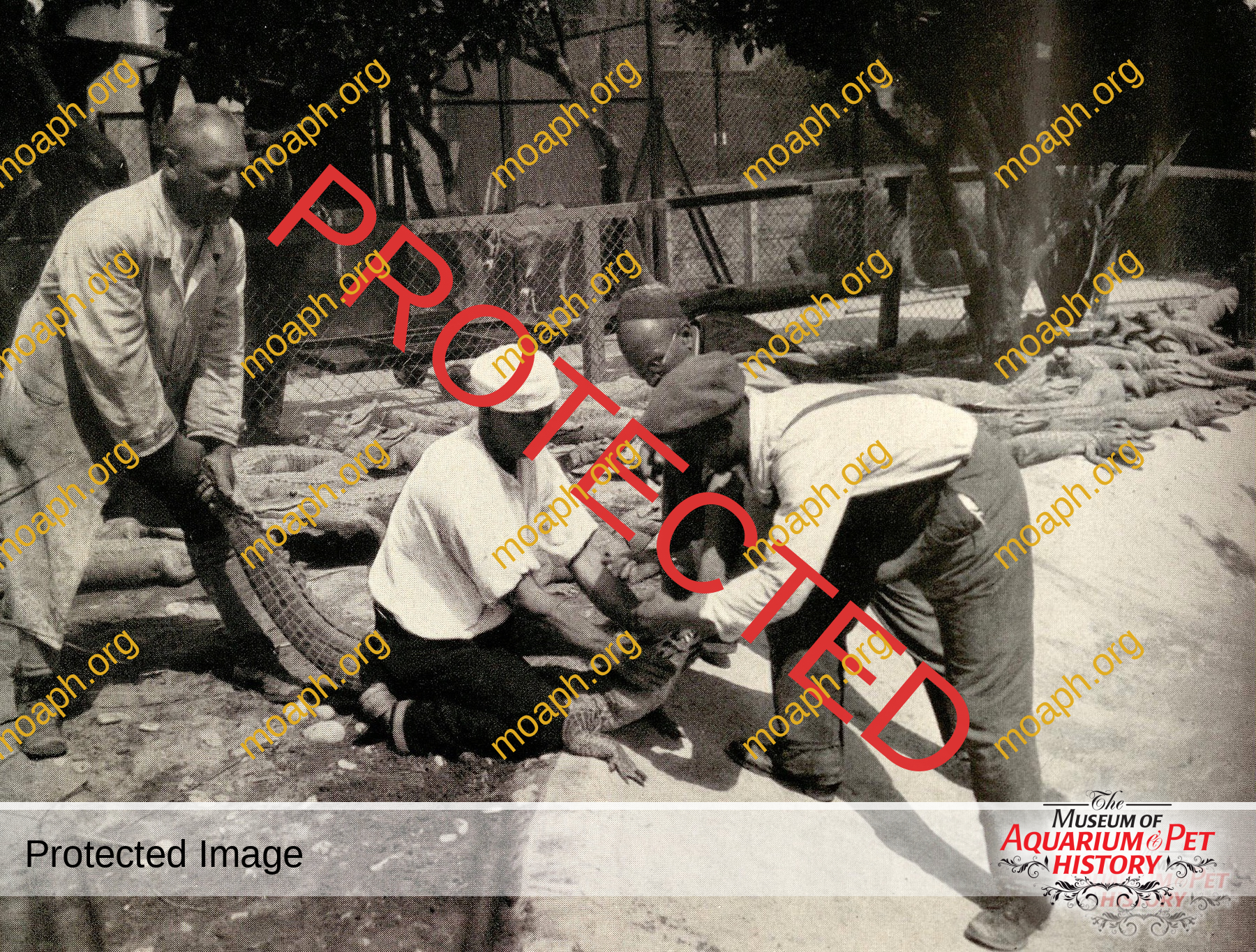 The ‘Show of 1000 Alligators’ spends the winter in Cros de Cagnes in an enclosure with a heated water pool. Walter Hennecke (left), the emigrated Russian Abacheff (with the dark cap), and keeper Knackstedt (right) have developed a special method for dealing with the biting and tail-whipping beasts.
