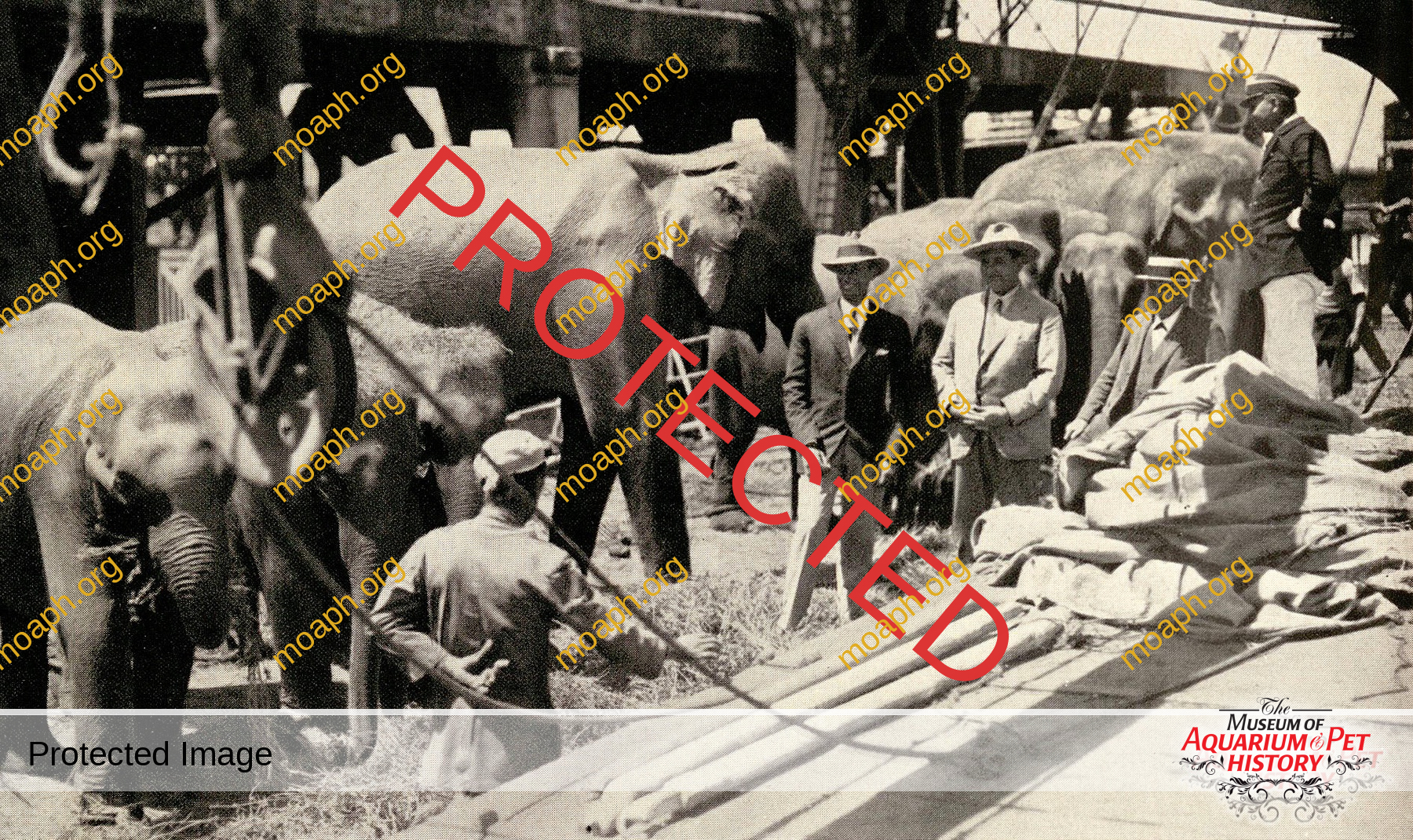A shipment of Indian elephants has arrived in Marseille. George Basilewsky, Hermann Ruhe (center), and Director Wendnagel from the Basel Zoo (on the right with a straw hat) were already inspecting the animals at the port.