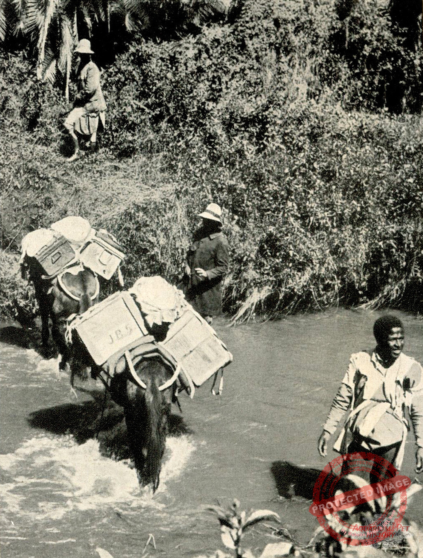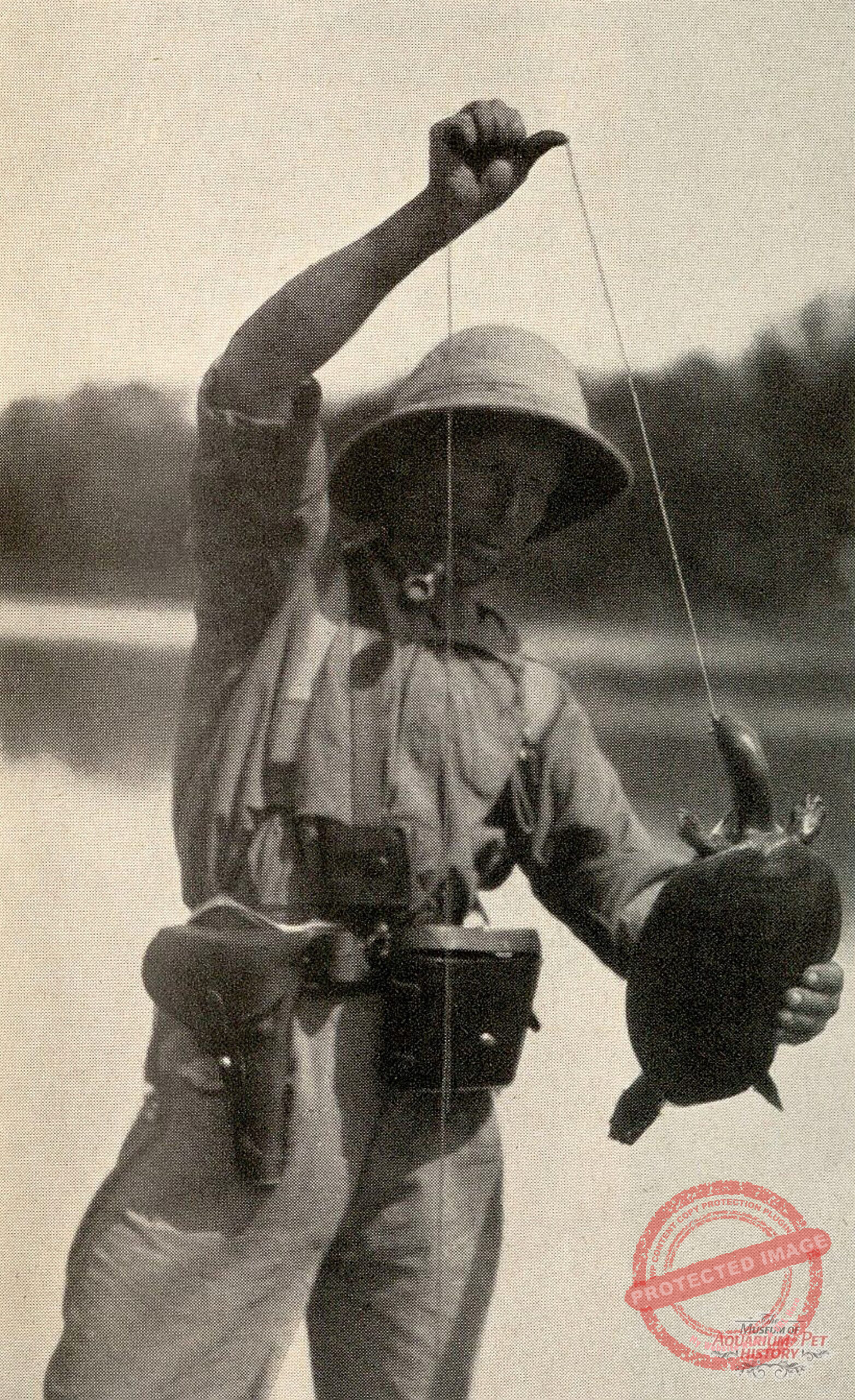 An expedition member caught an ‘African three-claw,’ an Abyssinian softshell turtle (bottom left). Members of an expedition from the Ruhe company during their crossing of the Kaffa jungle in Abyssinia.