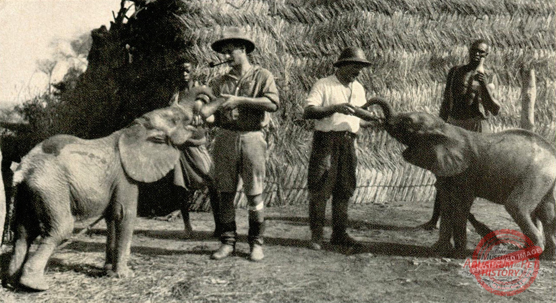 Carl Steininger and Karl Kreth in a camp of the Chad Expedition in 1930 with two young, freshly caught elephants, being fed oatmeal porridge from a bottle.