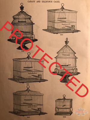 Who knew? Cages are said to have floors just like buildings. The 1st floor usually held the seed cups. Earlier cages often had the cage door on the “1st floor,” while later the door was moved up to the “2nd floor.” Of course, a few cages came with 3rd floors or more! Doors were spring loaded, guillotined, dropped down like a drawbridge, or had a simple bent wire to hold them closed Perches were made of cedar, birch, or maple. Cups were square or round, hooded or not, made of metal, milk glass, opal, lustreware, porcelain, or a combination, and some even swiveled in and out By 1910, the more expensive cages could be ordered with trays that pulled out for easier cleaning!