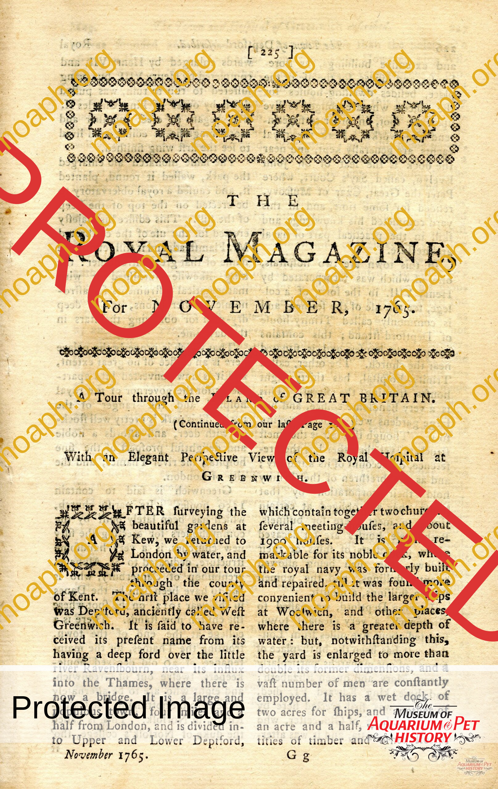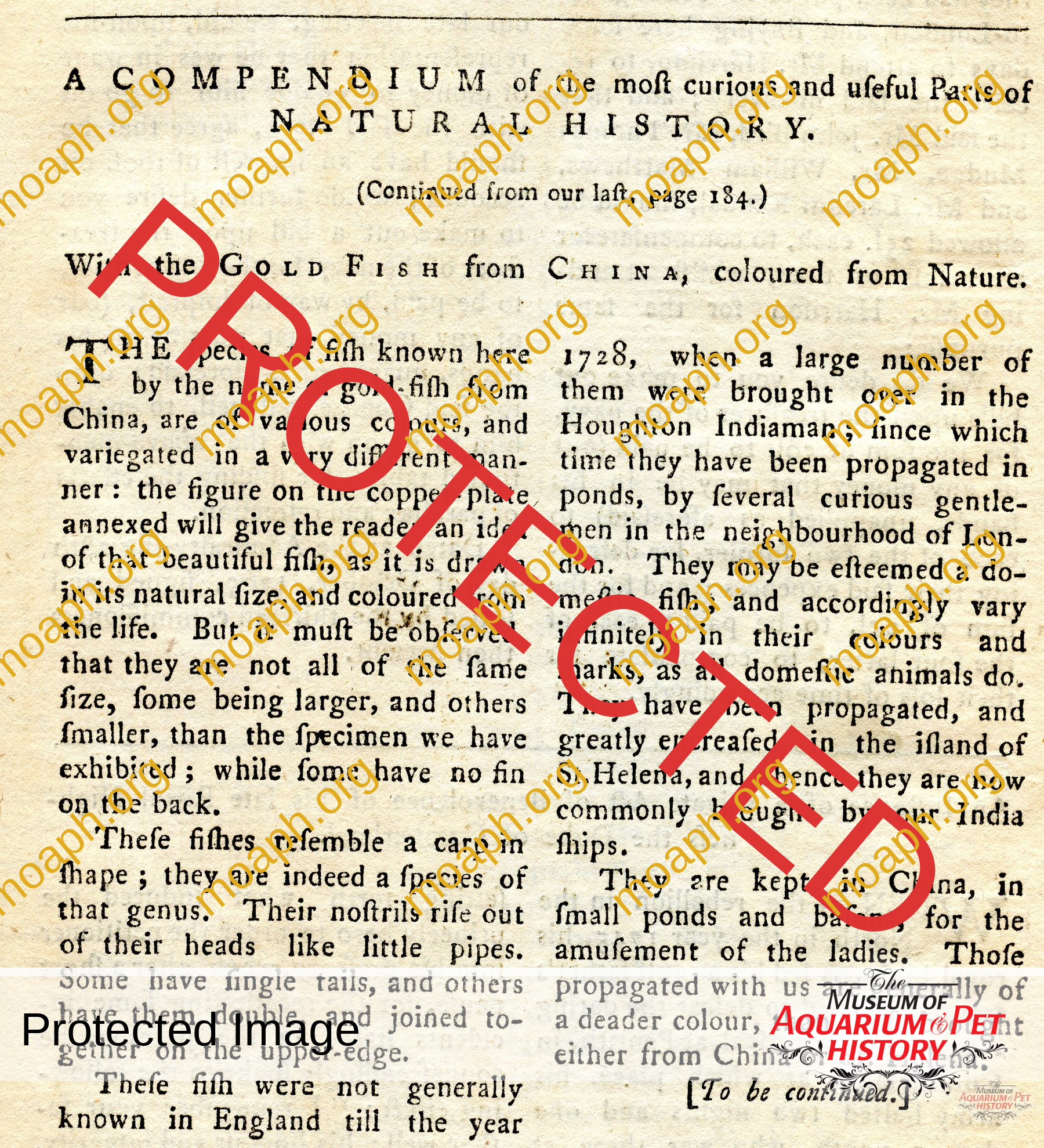 These fish were not, generally, known in England till the year 1728, when a large number of them were brought over in the Houghton Indiaman; since which time, they have been propagated in ponds in the neighbourhood of London. They may be esteemed a domestic fish; they vary infinitely in their colours and marks, as all domestic animals do. They have been propagated, and greatly increased, in the island of St. Helena, from whence they are now brought by all our India ships that touch there. In China, they keep them in small ponds and basons for the amusement of the Ladies and other curious persons. Those propagated with us are, generally, of a deader colour than what are brought from China or St. Helena.”