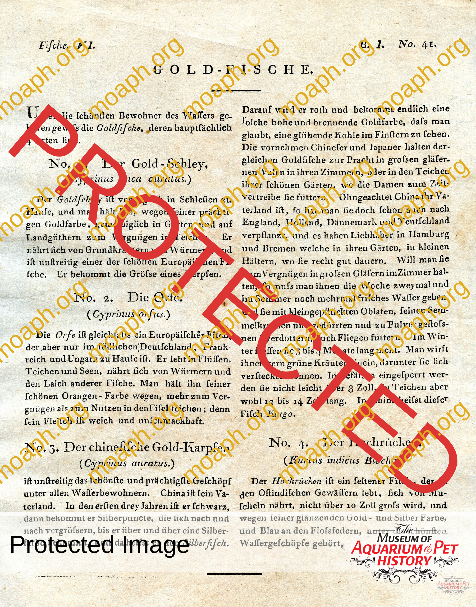 Although my primary interests lie with the 19th Century history of aquariums, I also am very interested in early goldfish history, which greatly pre-dates this. Consequently, I have collected, over the years, several items, such as plates and text, dealing with the latter topic. One way of looking at this is in that these are available (and the original damage already done) why not obtain them and put them to work from a historical perspective (as opposed to just framing and hanging them on a wall). This is what I am attempting to do within this article. There is no denying that an interested party can now do similar pursuits on the internet with the utilization of many now available (and growing) sources. This, hopefully to some success, is what I have done, and now wish to provide an initial review to the MOAPH reader. In having these plates, I can present them as a gift (of sorts) free and clear to the reader without any “to whom does it belong” situations. It is obvious that many historically based articles utilize internet-based images and information who belong to (or are hosted) by someone without bothering to reference from whence they originated. So, herein I offer up some of my collection free and clear for your possible interest. And, of course, I must add that these are now a part of the great history project sponsored by MOAPH, and any reuse of them should be with the advanced permission of the Museum. I am sure that the Director, Gary, will be happy to work with people on this. Do I think that it will always be the case for people to make such requests? Of course not. The internet is the internet, and the “Wild West Attitude” will persist in certain quarters. But you can fight this and help to provide good, and referenced, use of materials whose availability is from the initially bad action of source destruction, be it yesterday or a century ago. Thanks! My apology for possibly editorializing a bit too long on this topic.