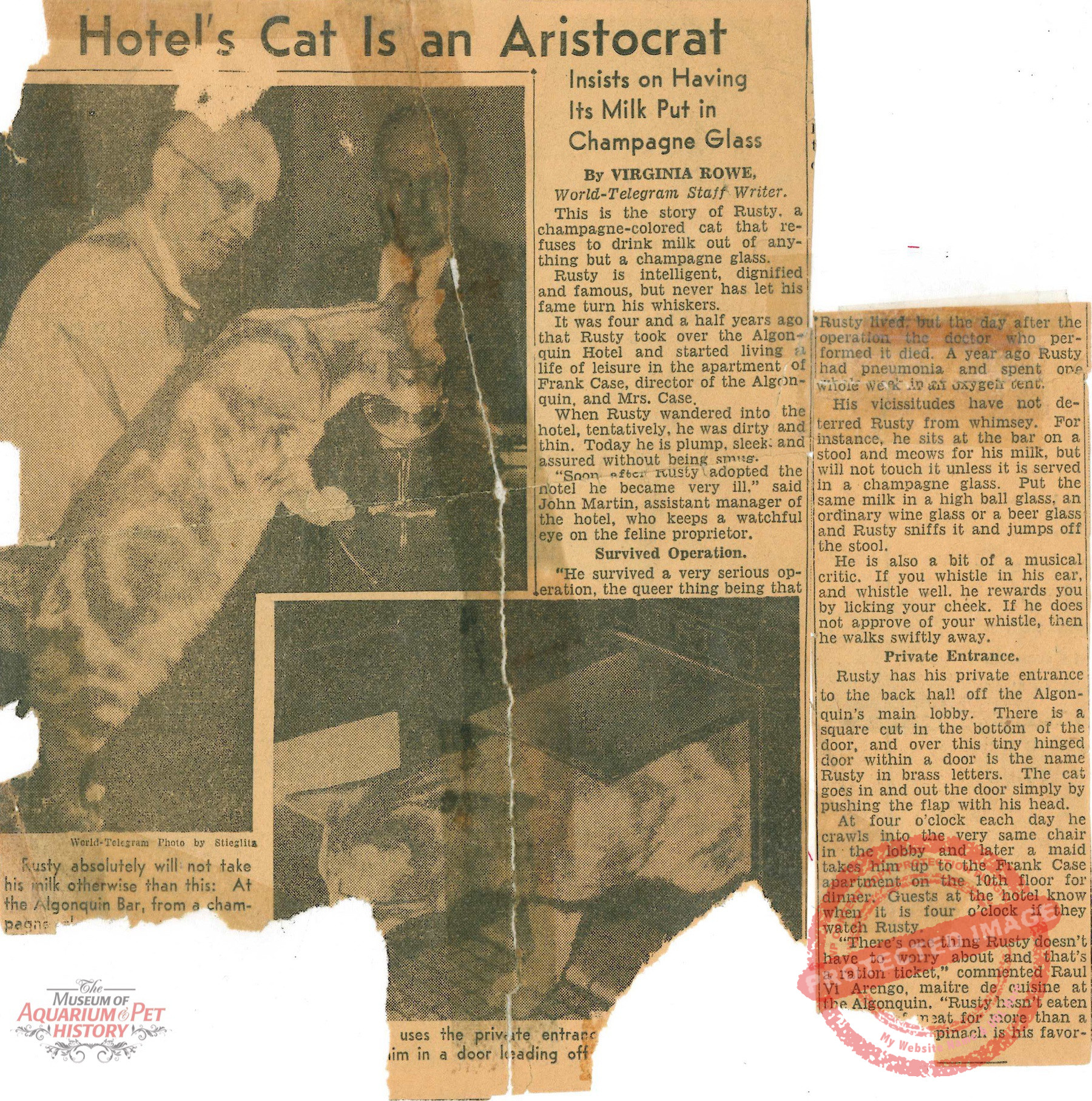 Probably the only surviving photograph of Rusty – the first feline resident of the Algonquin Hotel, from an old newspaper clipping. It was said that he would on-ly drink milk from a champagne flute! Photo courtesy Alice De Almeida/Algonquin Hotel/World-Telegram/Stieglita.