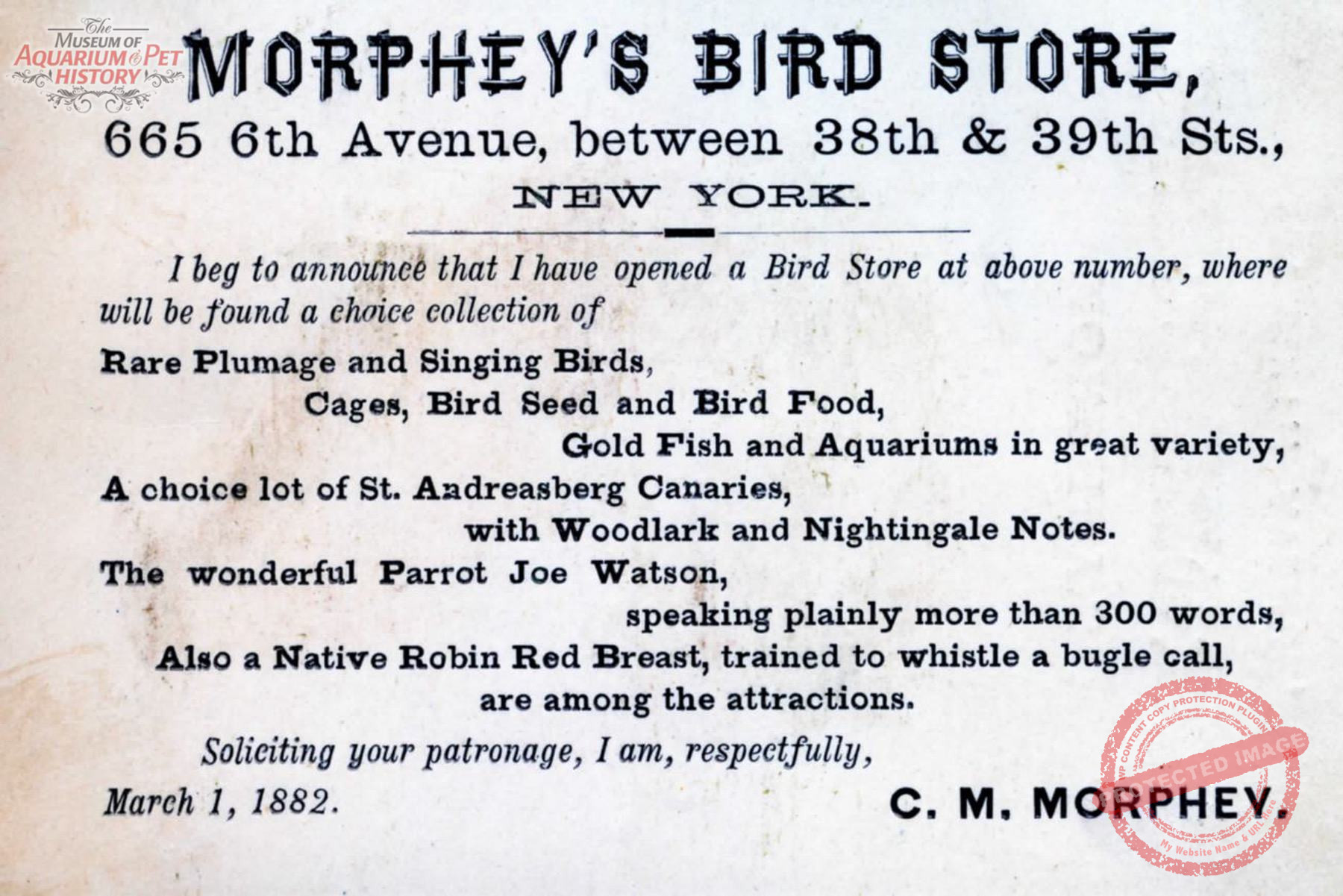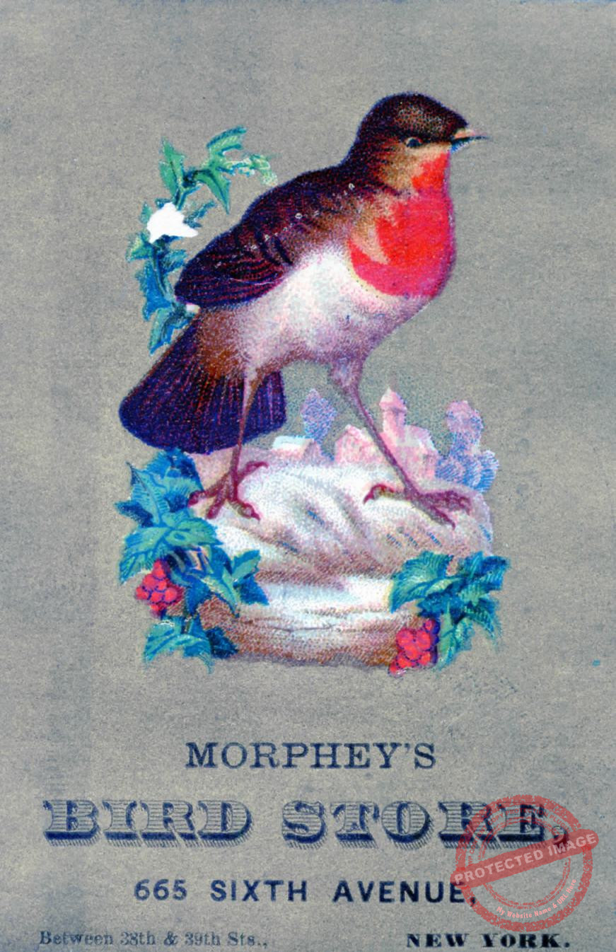 Figure 1a: The attractive obverse of Victorian trade card for a New York City dealer of pets and pet supplies. Authors collection.