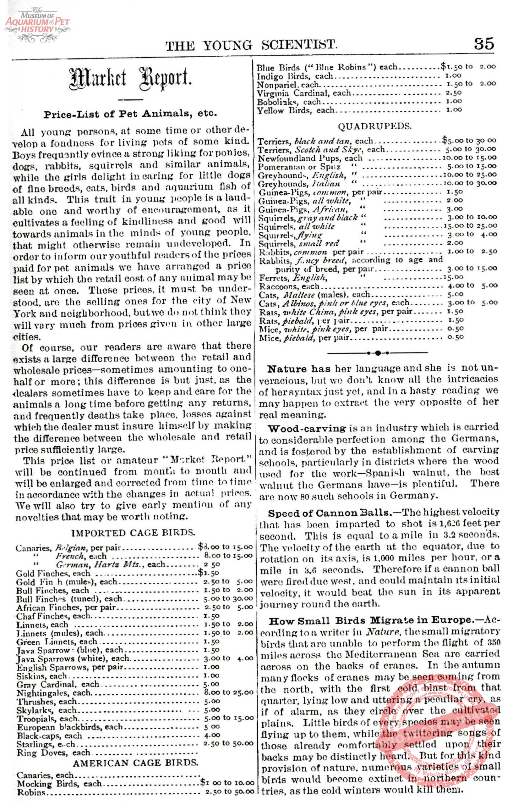 As noted above, this piece will be concerned with an aspect of Roberts’ writing. What will be covered is a series of articles that he wrote dealing with the price of various pets and some of their associated supplies. These were aimed at younger individuals, a regular audience that Roberts wrote for. This commenced in the January 17th, 1882 issue of the magazine Harper’s Young People (page 183). Either Roberts just treated this as a once only piece or the magazine wasn’t up for such a series. In any case, a year later in the January 1883 issue of the monthly magazine The Young Scientist, in which Roberts was regularly writing a wide variety of articles, he started the series again and it ran for 11 months. I must note here that in The Young Scientist series Roberts’ name is not used. But his regular writing for the publication, the sameness of format, the style and knowledge presented and especially the initial introductory text are pure Roberts. I have, to date, identified over 135 articles written by him and will be preparing a bibliography for submission to the MOAPH website.