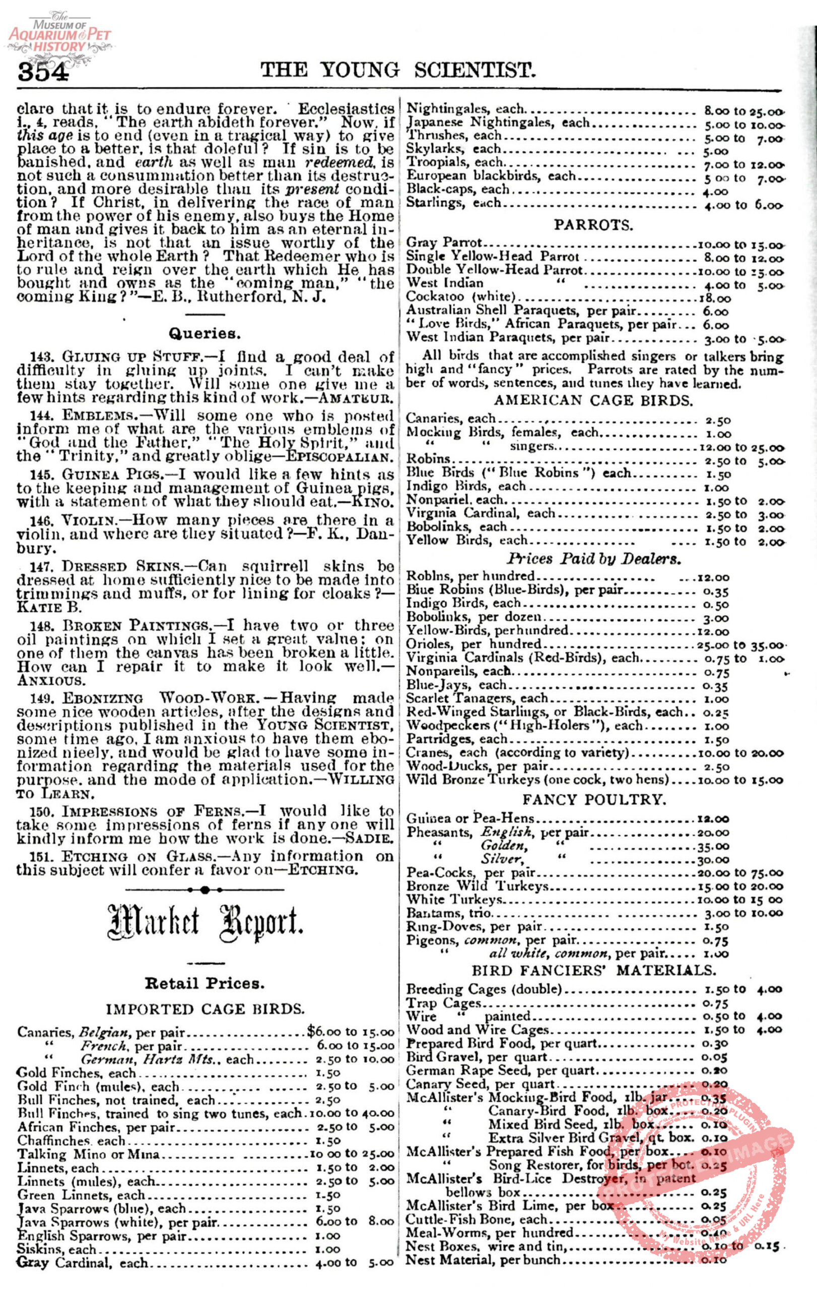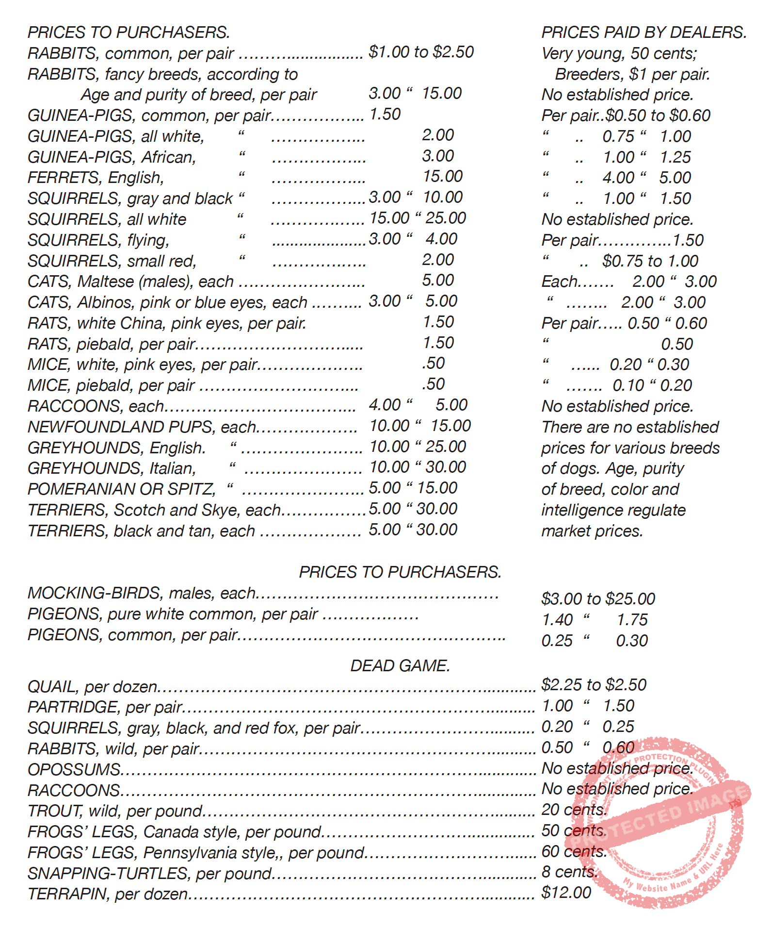 In making up this report I have avoided the very high selling prices, and often the very low prices paid by dealers, but have taken the figures of dealers who are satisfied with a fair profit. Purchasers of pet stock will do well to bear in mind that prices vary greatly according to the season of the year, as, for instance, a month previous to the holidays the prices range the highest. During the hot midsummer months, when the young folks are in the country, the demand falls off greatly, so that dealers are forced to reduce the amount of stock on hand and the prices to the lowest figures.