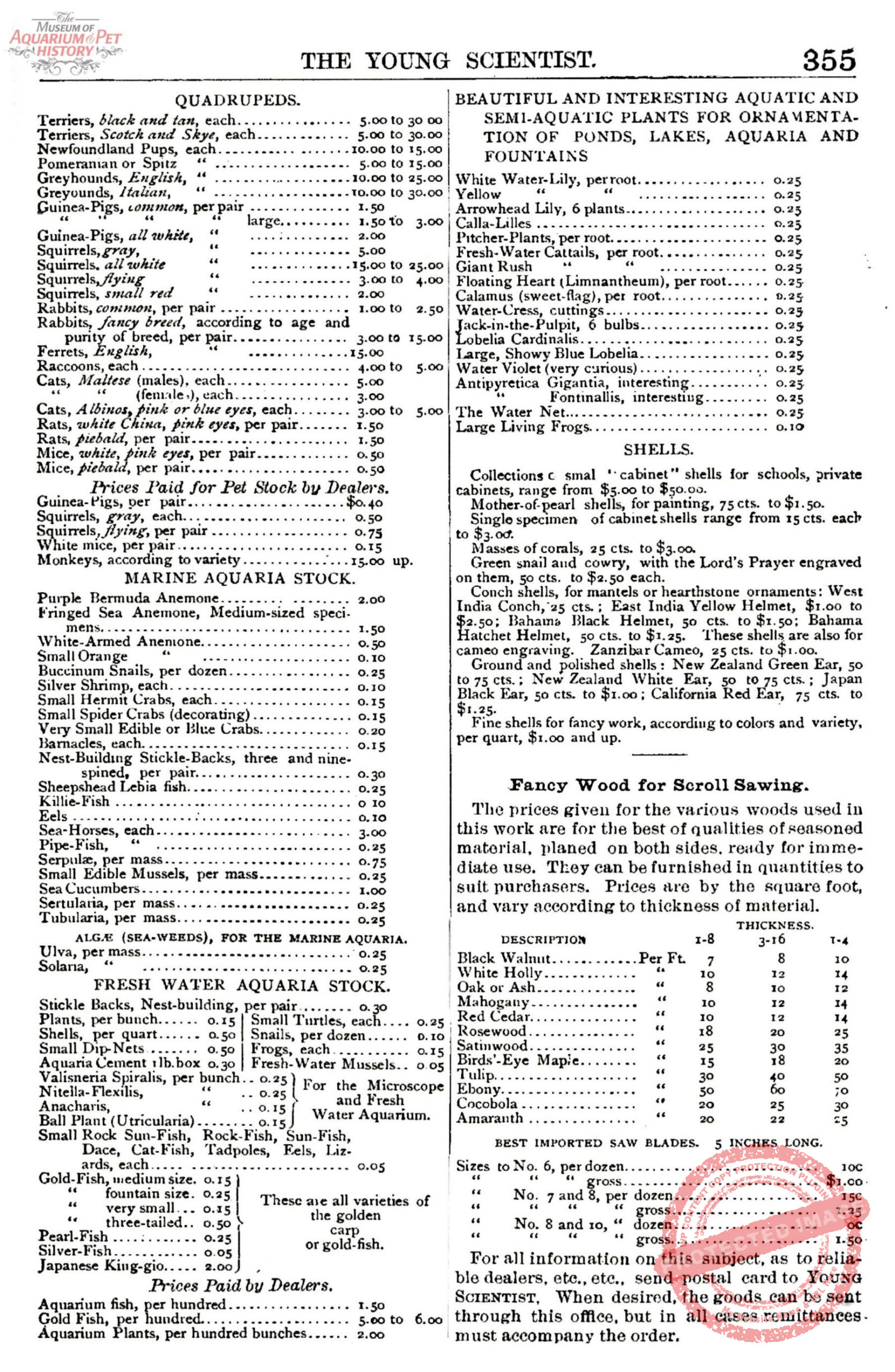 As noted, this series starts off slowly. But it picks up as it goes along. In the February column Roberts has two short articles at the beginning. These are on “The German Carp” and “The Golden Ide.” Other similar pieces would have been welcomed in future columns. Aquarium stock and supplies are added in the March issue. In the May issue additional expansion covers Fancy Fowl, Parrots and supplies for bird fanciers (cages, foods, gravel, etc.). Prices for those wishing to sell stock to pet dealers are noted to be down for the Summer and they tend to stay mostly that way throughout the series. And a species of Anemone from Bermuda is added to the list of Aquarium Stock.