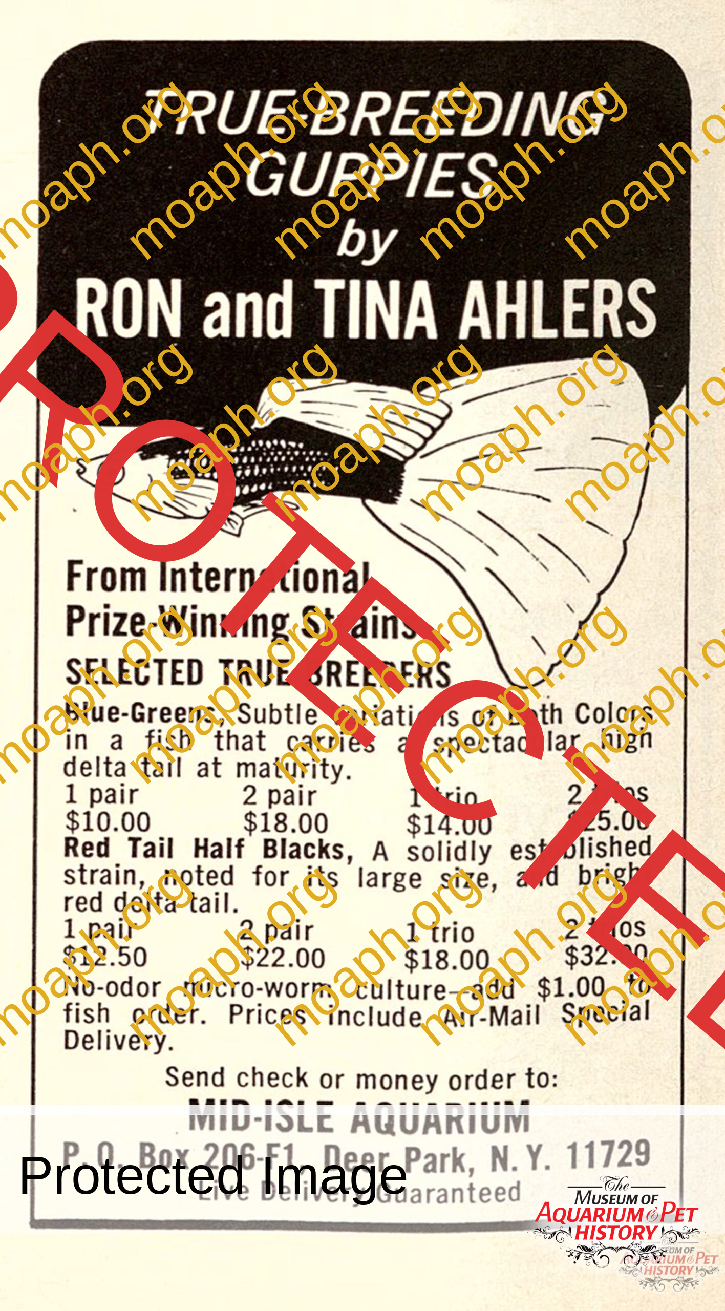 One day, in one of my tropical fish magazines, I saw a small add for mail order, Show quality guppies. The address and phone number were located in Deer Park, the next town over. The gentleman’s name was Ron Ahlers. His wife’s name is Tina. I called the number and Tina answered the phone. I told her I was a big hobbyist and maybe I could come buy some fish.