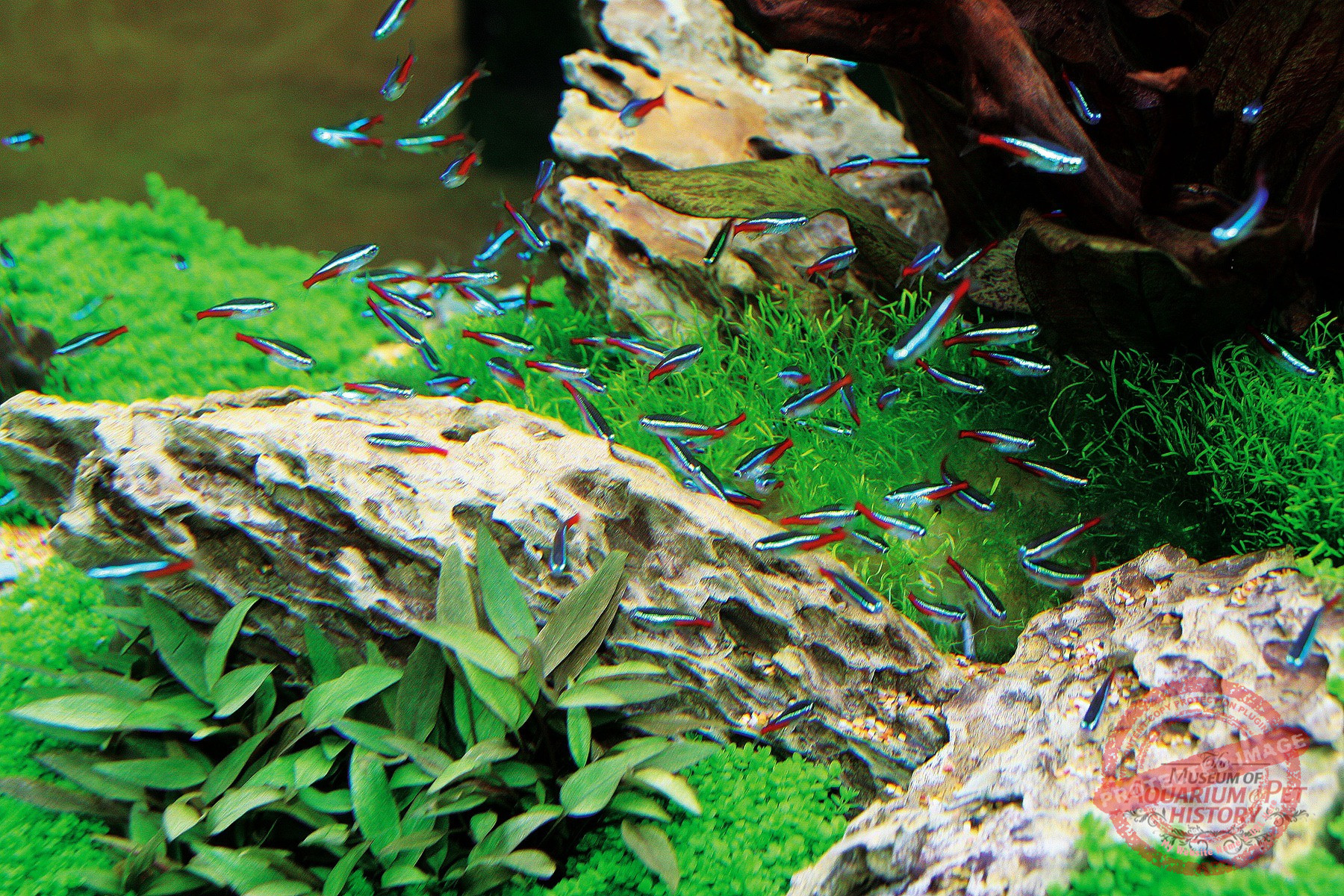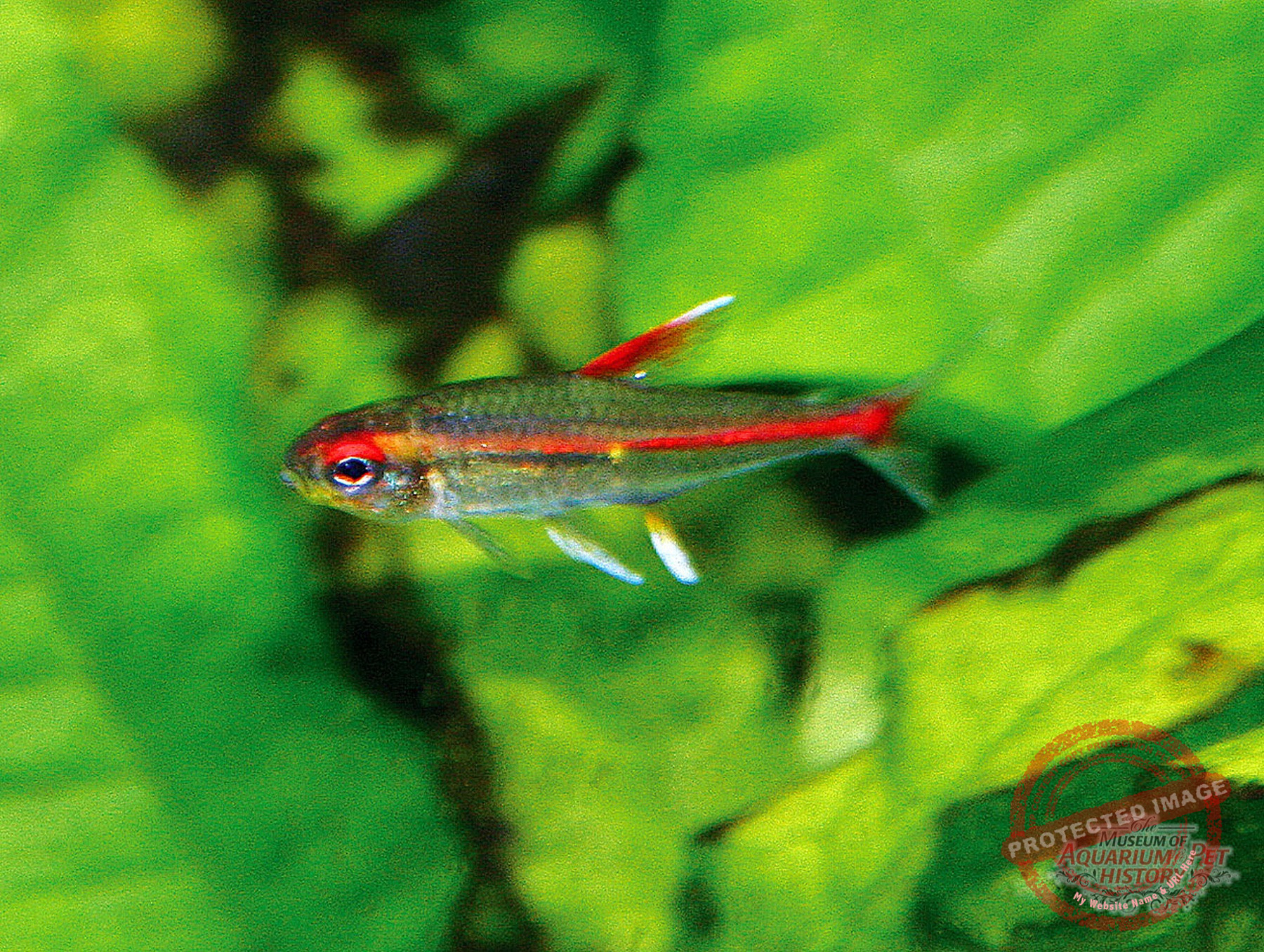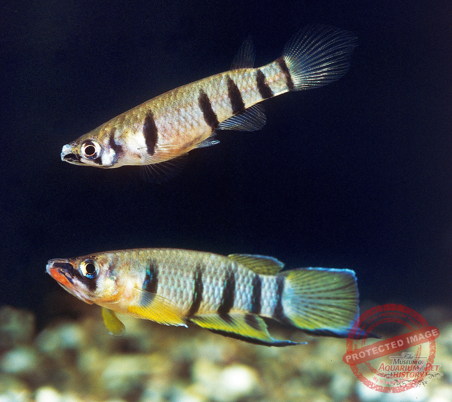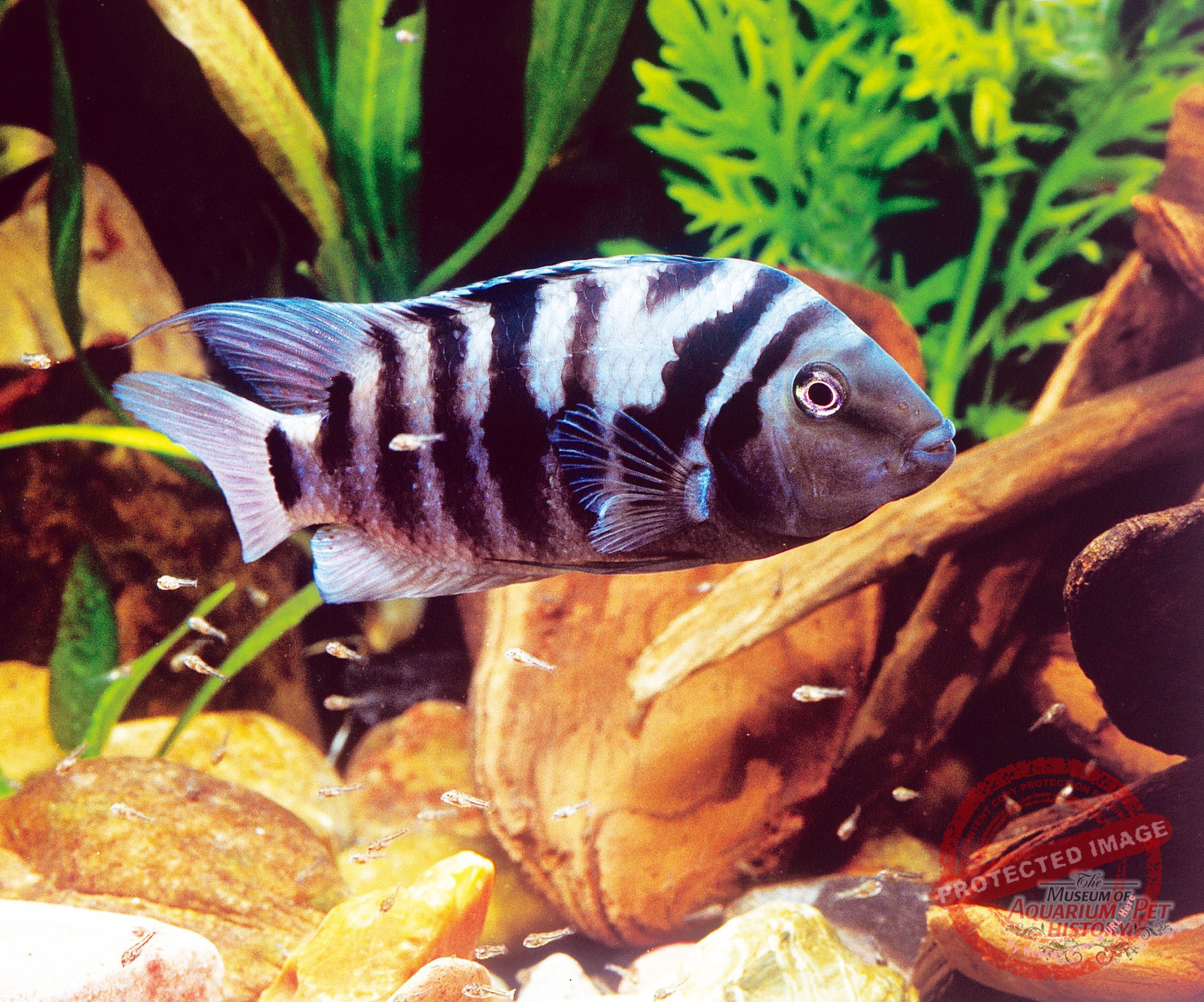 Which fish were these? Alongside numerous livebearing toothcarps and their cultivated forms, and classics such as Macropodus opercularis and Australoheros facetos, there were species still commonly found in aquarium shops today. Among characins, for example, Hyphessobrycon flammeus, Pristella maxillaris, Moenkhausia sanctaefilomenae, Hemigrammus erythrozonus, Paracheirodon innesi, and Gymnocorymbus ternetzi. Among cichlids, species such as Pelvicachromis pulcher, Heros severus, and Amatitlania nigrofasciata survived the war. From the latter—the zebra cichlids—I received a pair as a schoolboy from Kurt Koch’s breeding facility; they were the first fish I successfully bred in my own aquariums. Carp-like fishes such as Danio rerio, Pethia conchonius, Puntigrus tetrazona, and Tanichthys albonubes were likewise maintained, as were killifishes including Aphyosemion gardneri, Epiplatys dageti, and Fundulopanchax gardneri, to name but a few.
