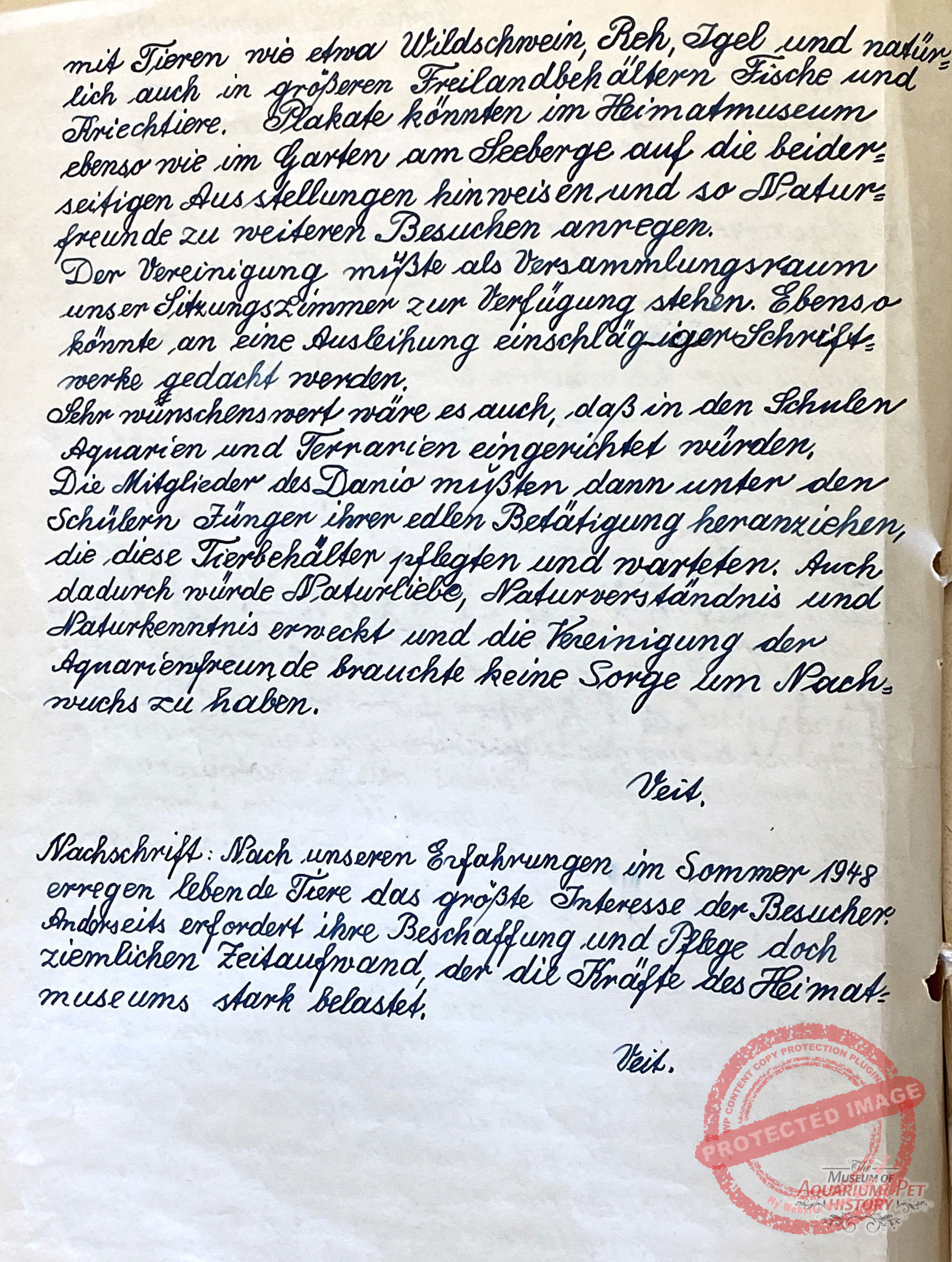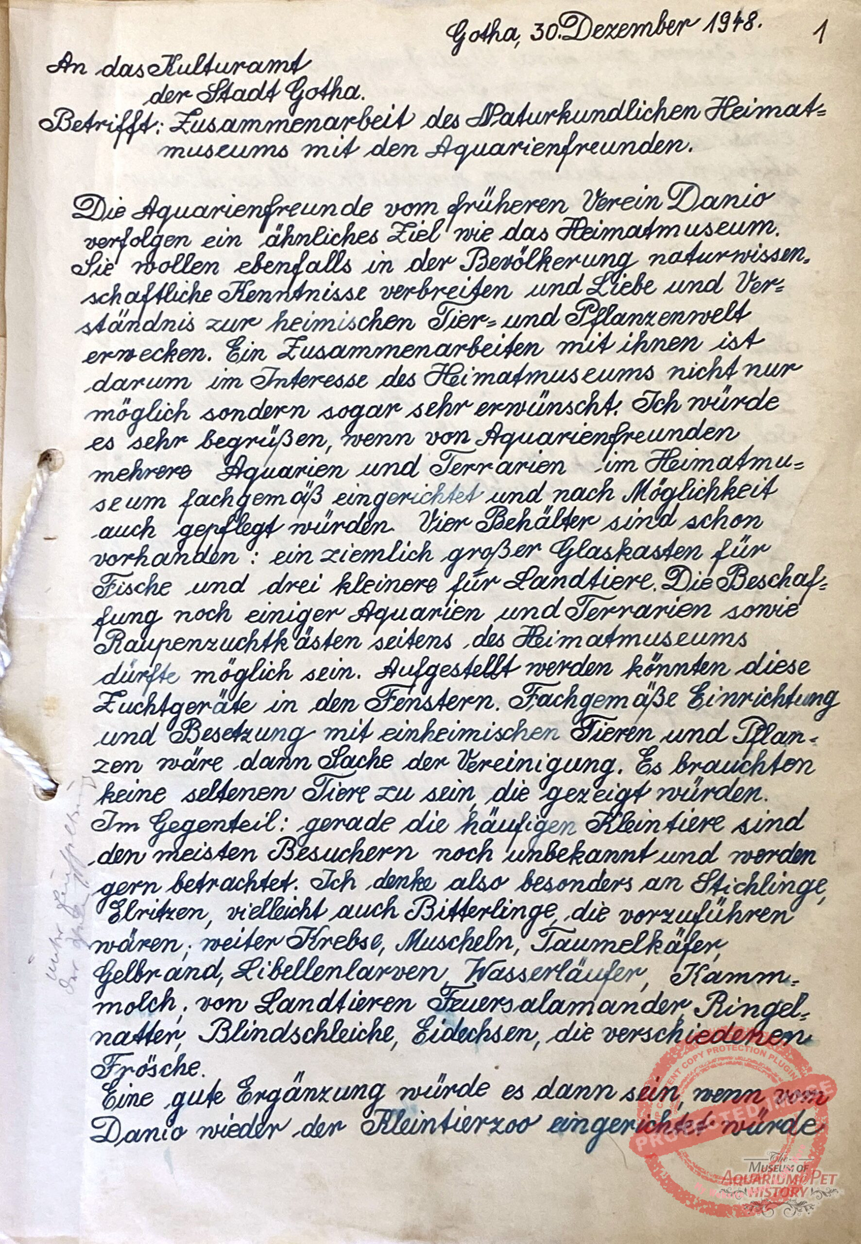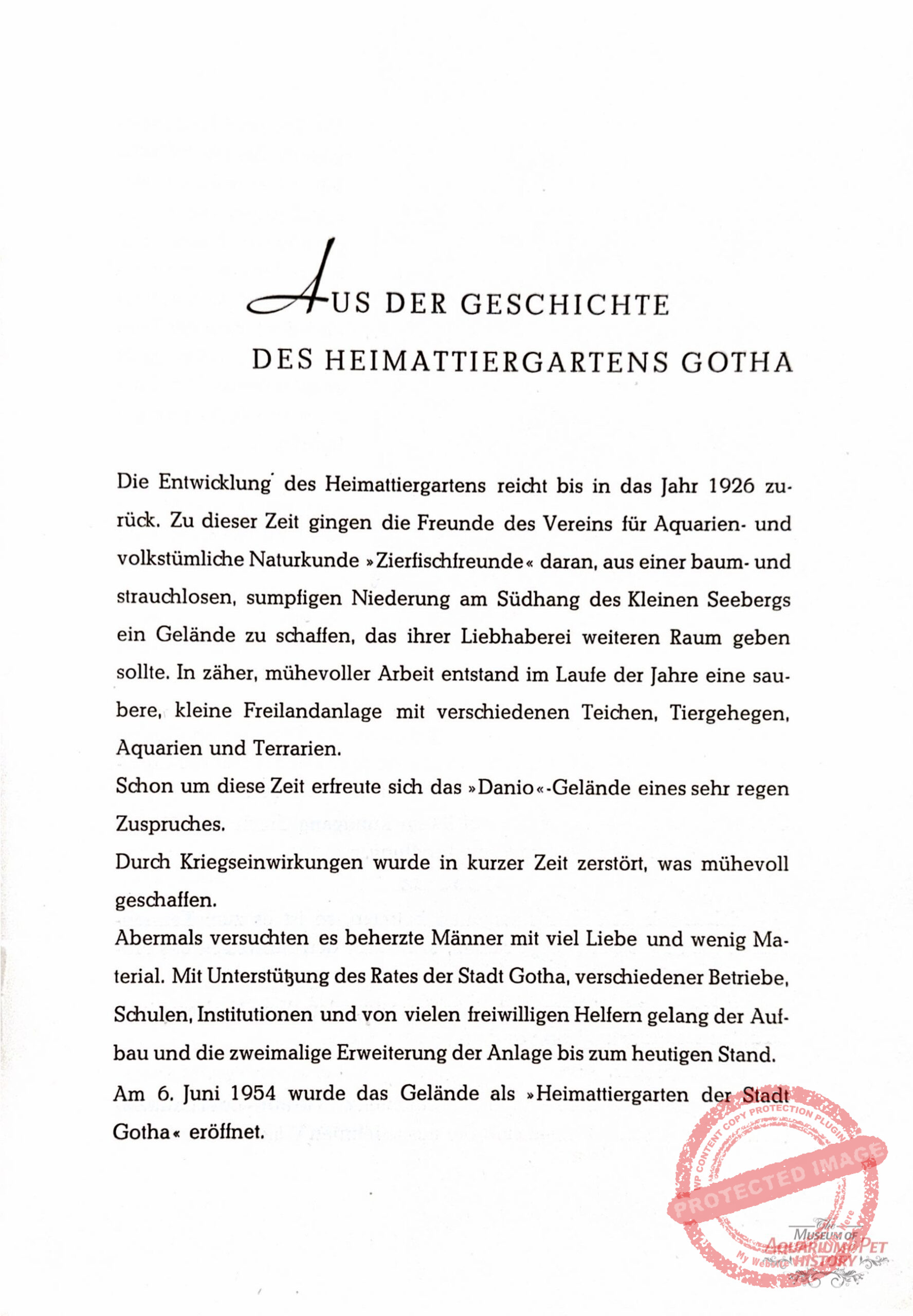 Some members of the Danio Club sought cooperation with Gotha’s scientific institutions to consolidate remaining resources. On 30 December 1948, the active member Erich Veit wrote to the city’s cultural office proposing collaboration with the local natural history museum. He suggested installing aquariums and terrariums for native small animals, to be maintained by club members, and even proposed the establishment of a small zoological garden on the bombed-out Danio site. Unfortunately, no documents survive regarding the city’s response.