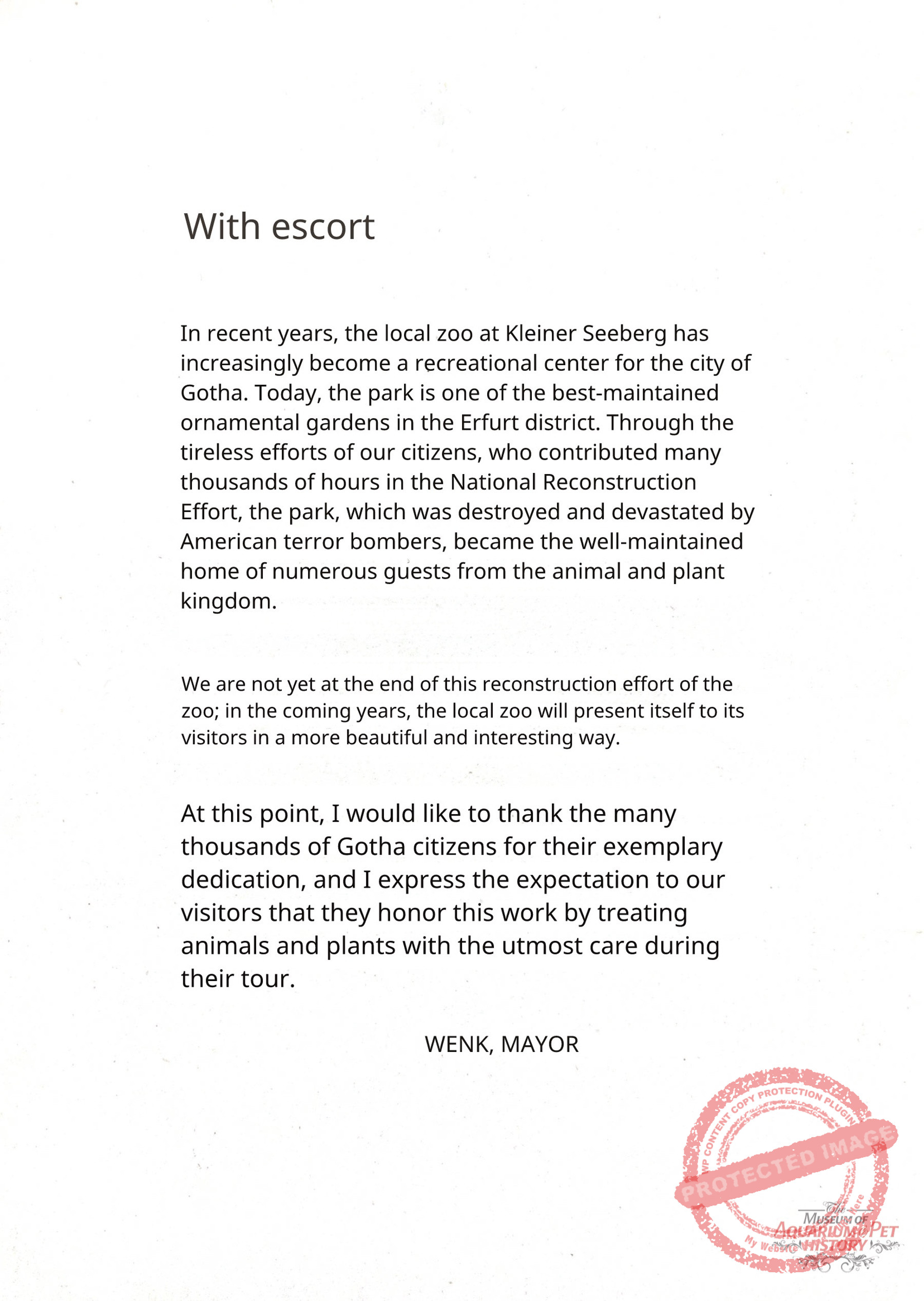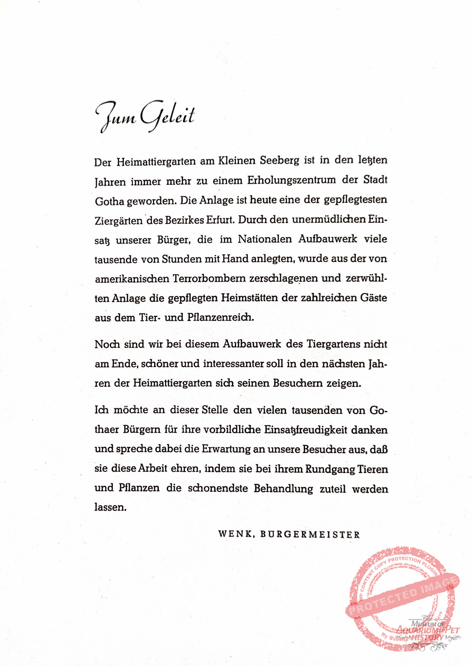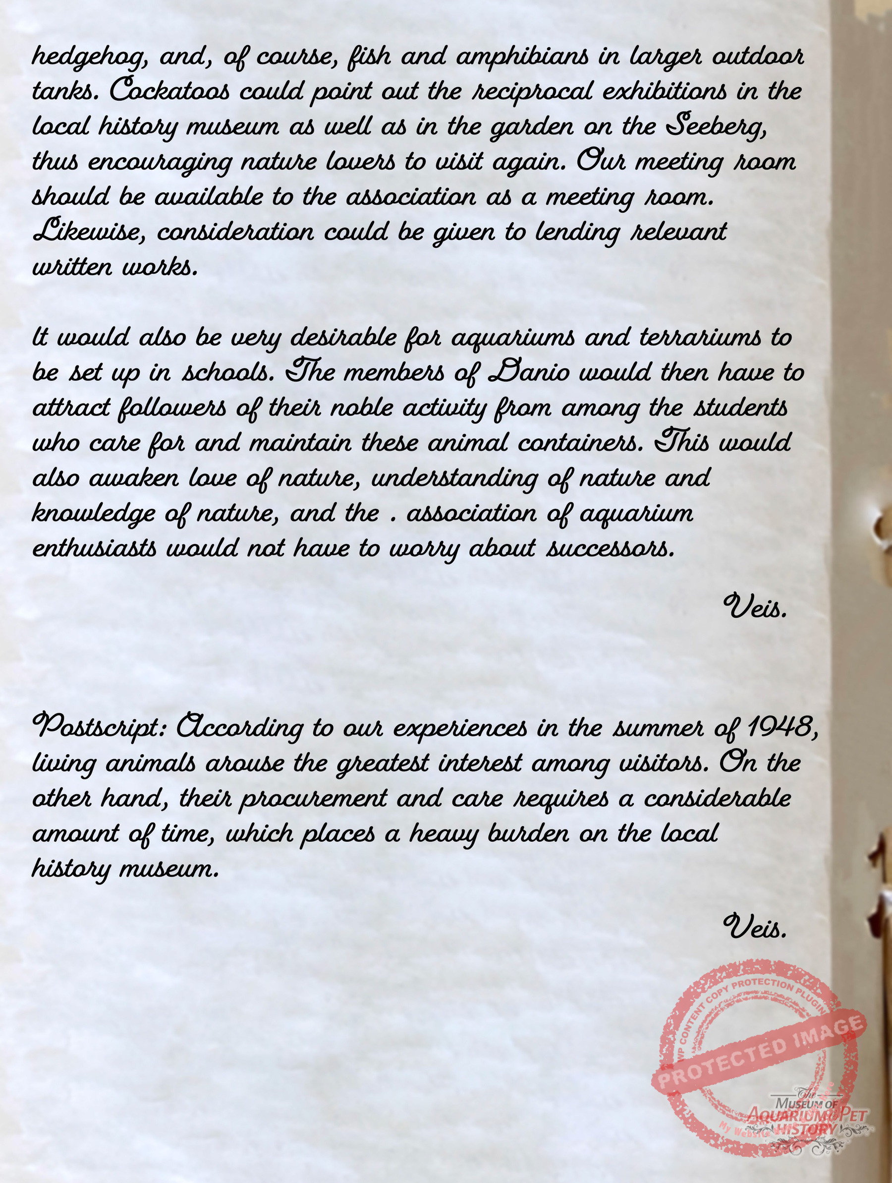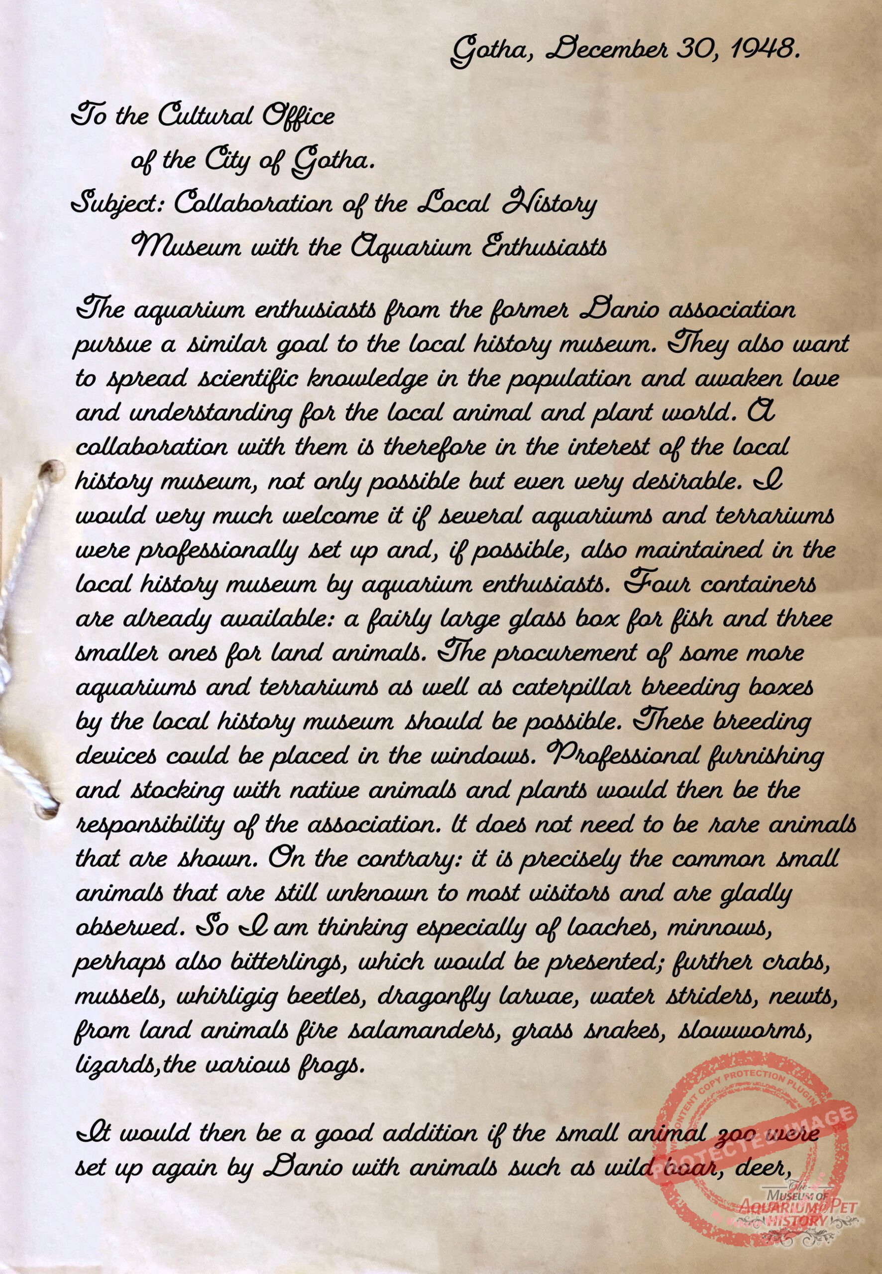 Some members of the Danio Club sought cooperation with Gotha’s scientific institutions to consolidate remaining resources. On 30 December 1948, the active member Erich Veit wrote to the city’s cultural office proposing collaboration with the local natural history museum. He suggested installing aquariums and terrariums for native small animals, to be maintained by club members, and even proposed the establishment of a small zoological garden on the bombed-out Danio site. Unfortunately, no documents survive regarding the city’s response.