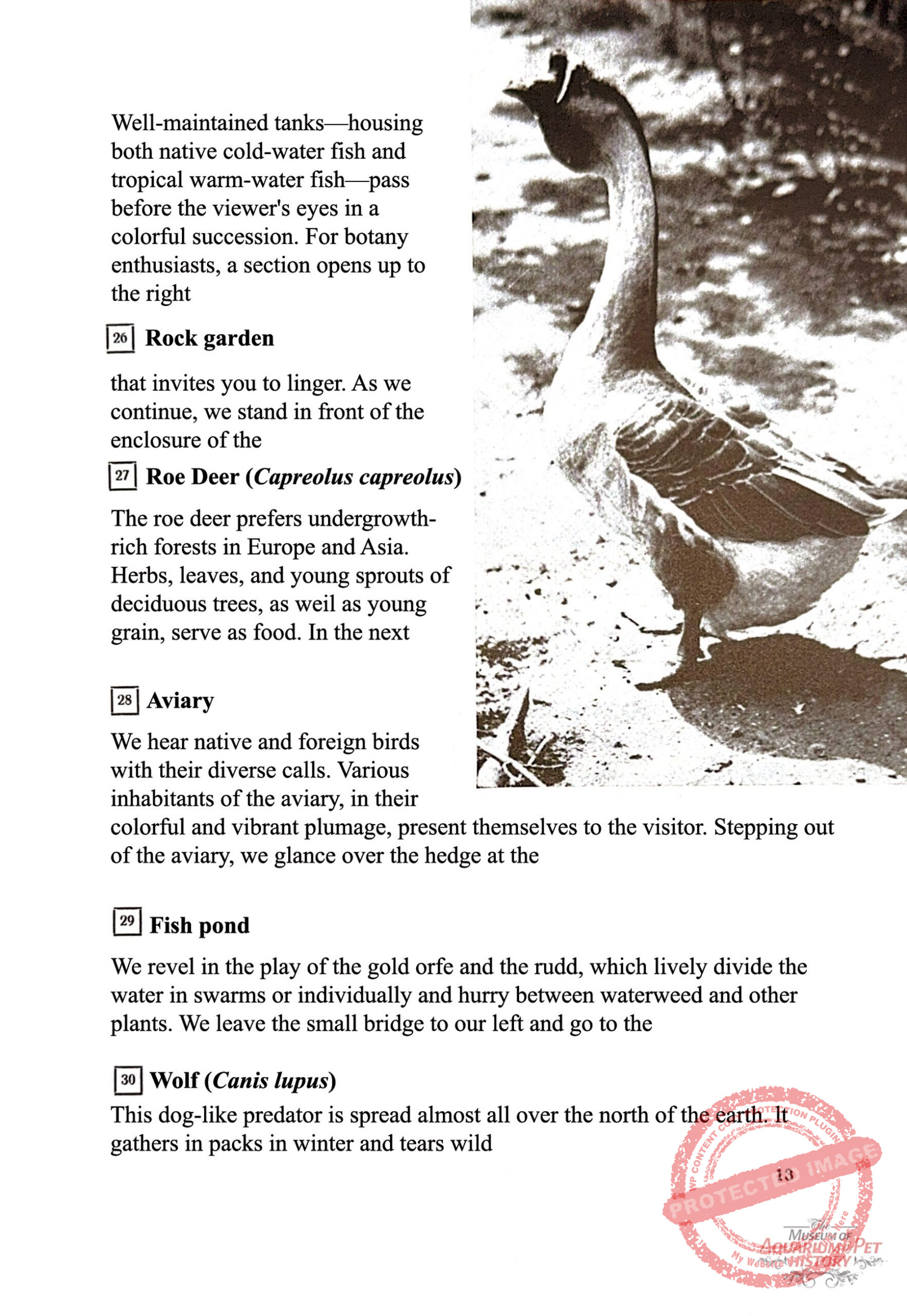 In modest enclosures built with postwar means, visitors could observe native wildlife, domestic animals, and a few exotic species—birds of prey, mustelids, waterfowl, gallinaceous birds, and ungulates. Particularly popular was the enclosure for rhesus macaques, Macaca mulatta, where young were regularly seen. Water installations for nutria and ponds for fish and waterfowl were also noteworthy. The former club building, hastily rebuilt and unheated, housed aviaries for budgerigars, Melopsittacus undulatus, and cockatiels, Nymphicus hollandicus. There was also a small aquarium house—a corridor lined with tanks and, at its end, a large terrarium for European tortoises. Heated by steam pipes from a coal stove that had to burn continuously in winter, it exuded a damp, slightly musty atmosphere that I loved dearly.