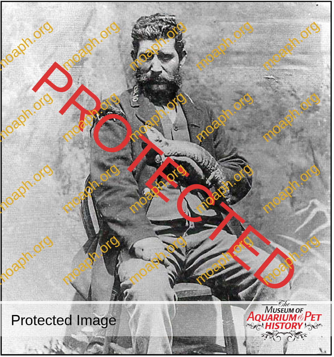 Figure 17. London Zoo keeper with chameleon on shoulder and blue- tongued skink (Tiliqua gigas) ca. 1872. Photograph by Frederick York, provided by John Edwards.