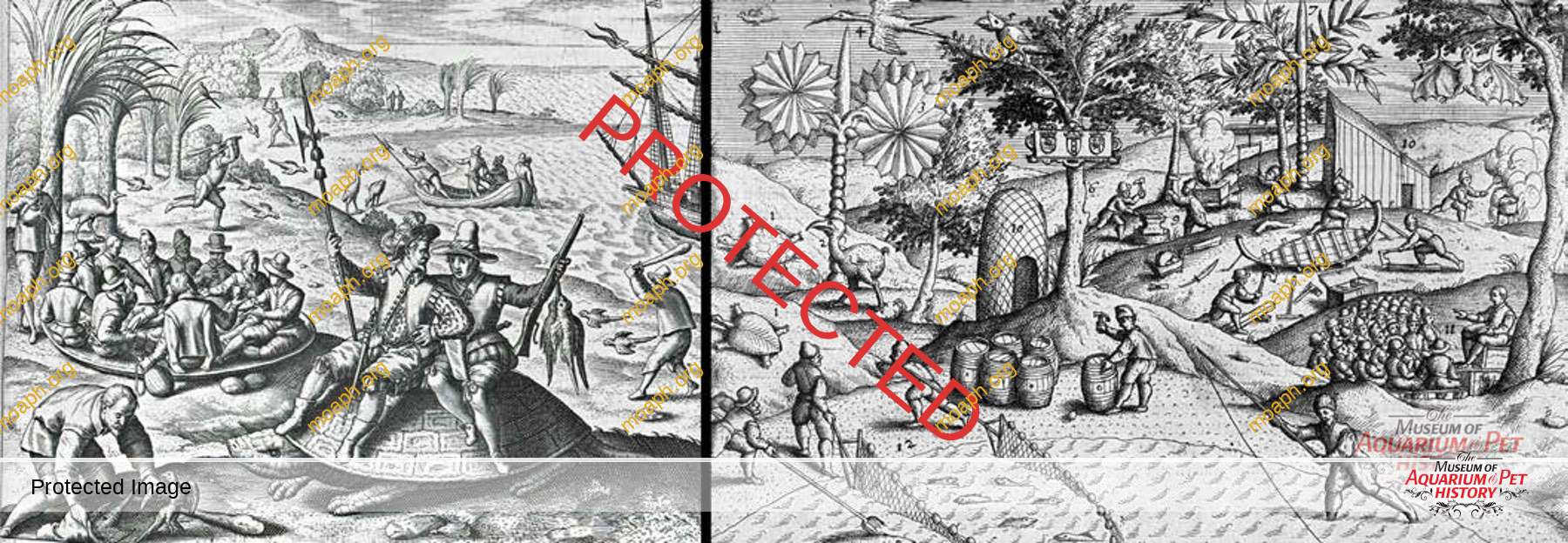Figure 2. Woe to the poor turtle. Etchings by Johann Theodor & Johann Israel de Bry depicting the plight of giant tortoises, dodos, parrots and other creatures at a Dutch colony on the shore of the island of Mauritius in the Indian Ocean, circa 1595.