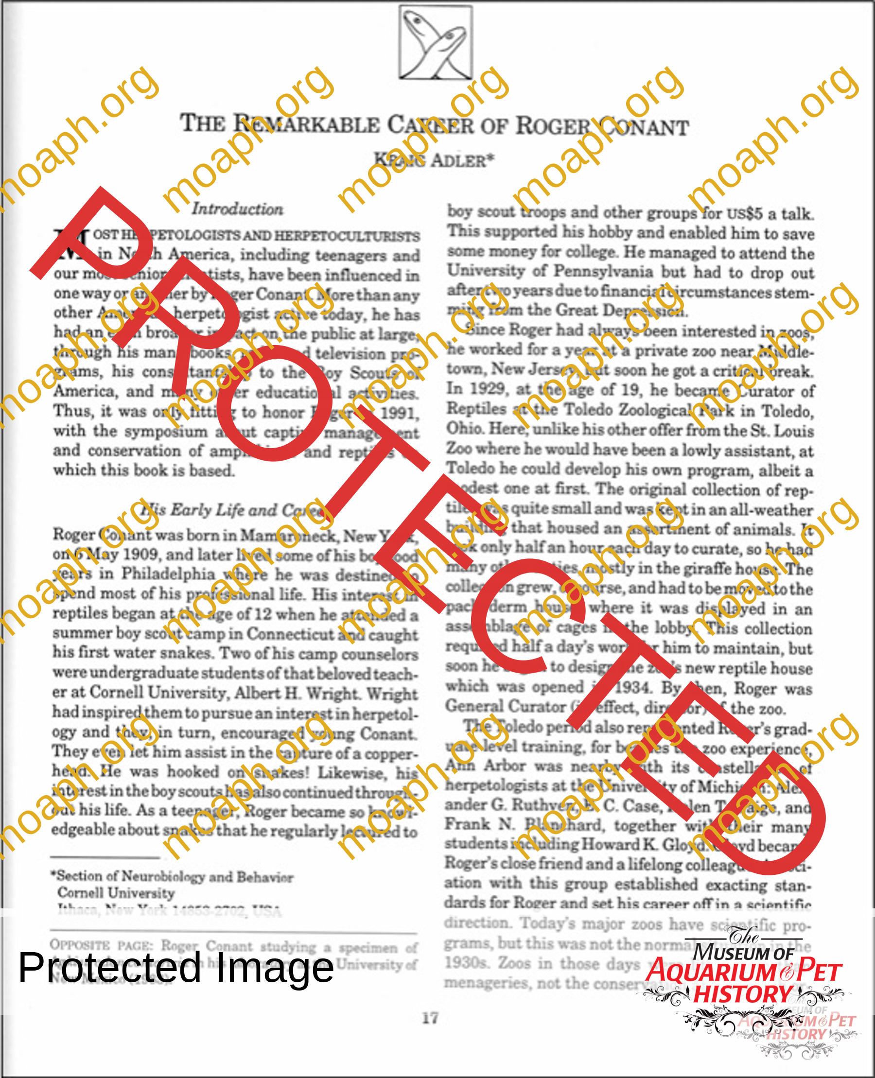 “Most herpetologists and herpetoculturists in North America, including teenagers and our most senior scientists, have been influenced in one way or another by Roger Conant. More than any other American herpetologist active today, he has had an even broader impact on the public at large, through his many books, radio and television programs, his consultantship to the Boy Scouts of America, and many other educational activities.”