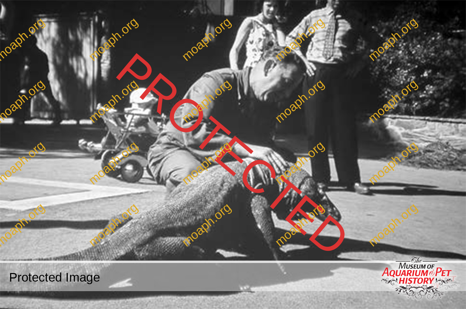 An adult Komodo dragon was allowed to walk the zoo with keeper Albert Schick at the Frankfurt Zoo while visitors were around. The lizard arrived at the zoo in 1958.
