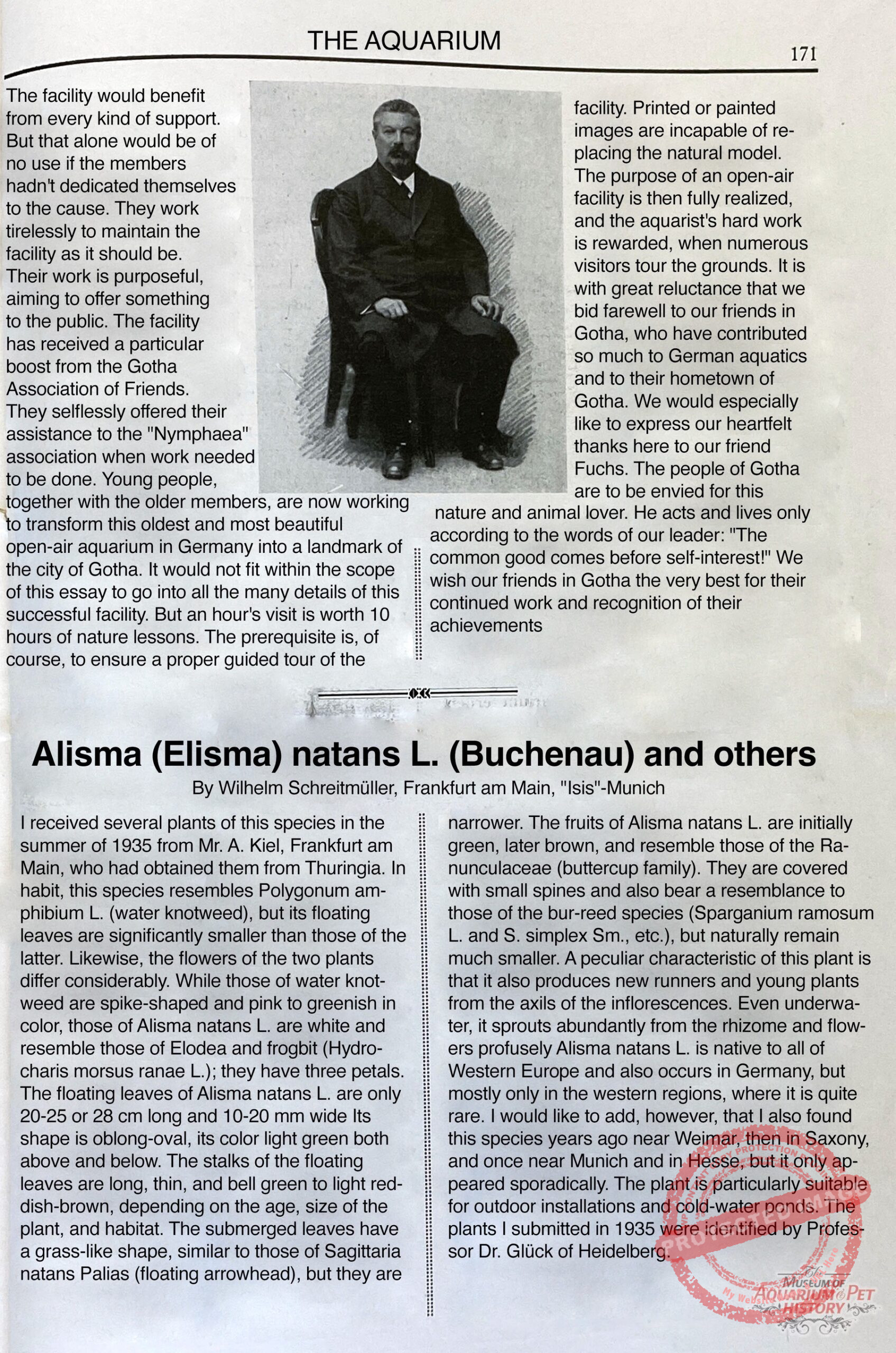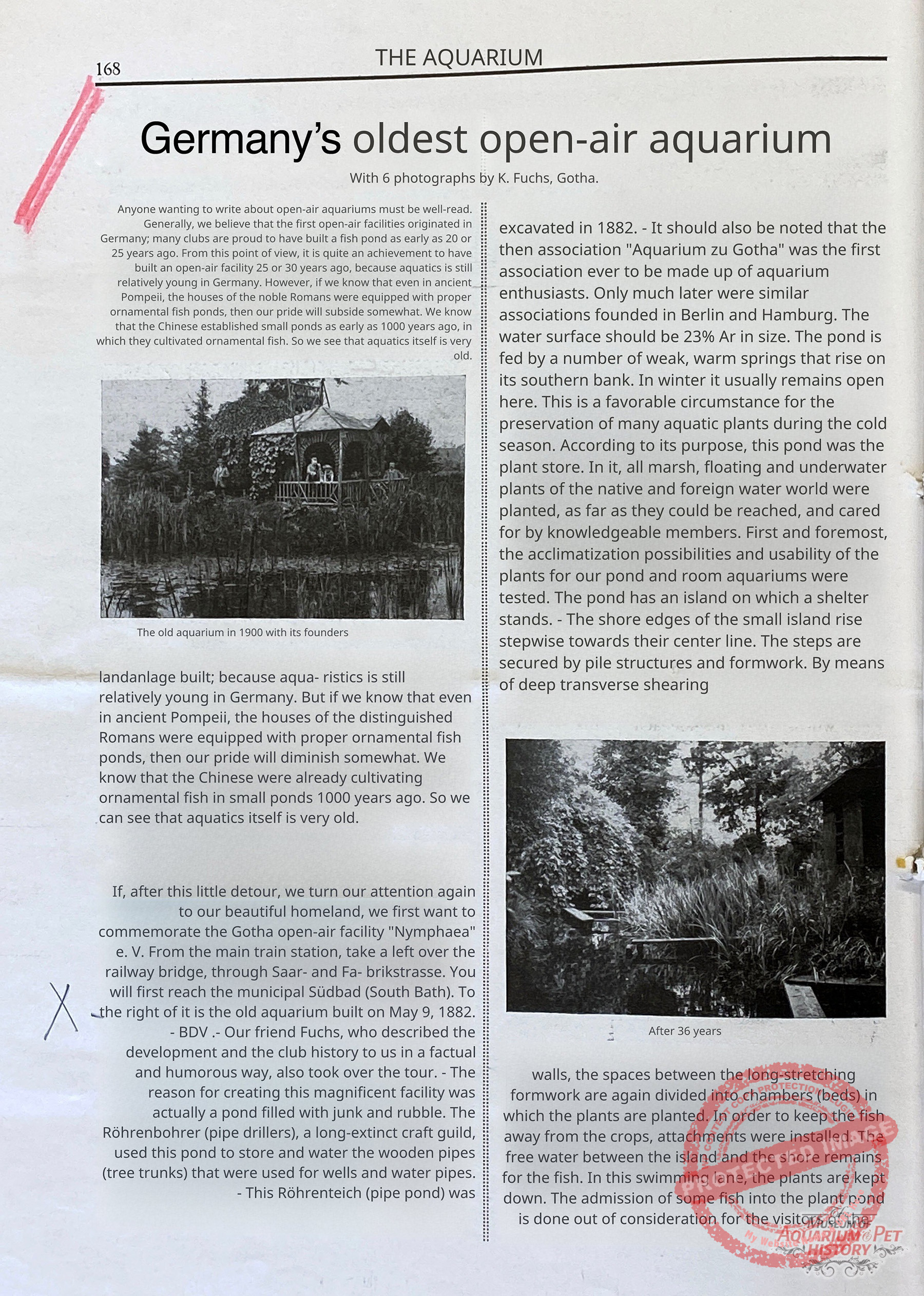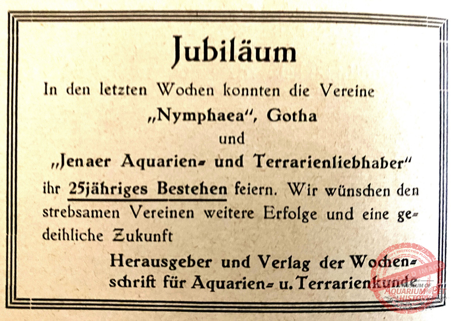 In 1938, the Wochenschrift likewise published its congratulations to the Gotha Nymphaea club on its twenty-fifth anniversary — without acknowledging the far longer and more complex history of Gotha aquaristics.