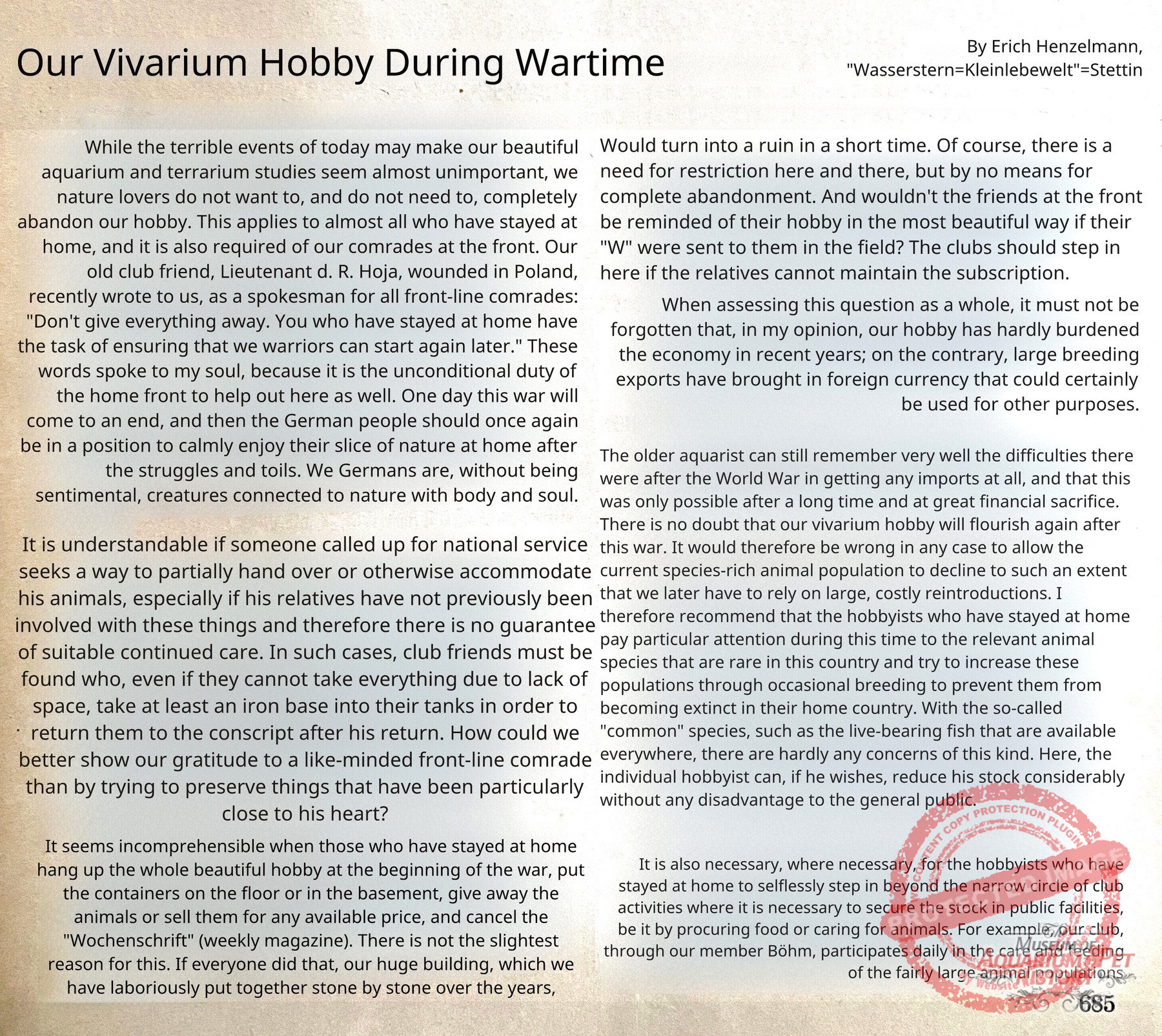 Particularly striking is the Wochenschrift article “Unsere Vivarienliebhaberei in der Kriegszeit” (“Our Vivaristic Hobby in Wartime”) by Erich Henzelmann at the end of 1939, which, in a form adapted to Nazi language, reflects how people in hobby clubs felt and thought (my comments and interpretations in parentheses): “Even though, given the magnitude of current events, our fine study of aquariums and terrariums may seem almost (but not entirely) insignificant, we nature lovers (a well-chosen word, borrowed from Göring’s homeland cult) still want and need not entirely to give up our hobby. This applies to almost all those left at home (Jews and prisoners could no longer participate), and this is also demanded of our comrades fighting at the front. Recently, our old club friend, Reserve Lieutenant Hoja, wounded in Poland, wrote to us, as if speaking for all front comrades, the following: ‘Do not give everything away. You at home have the task of ensuring that we warriors can start again later.’ These words spoke to my soul, for it is the absolute duty of the homeland (here meaning citizens who cultishly identify with the homeland) to step in and help. One day this war will also end, and then the German person shall again be able, after the battles and hardships, to peacefully enjoy his own slice of nature at home (again, home and nature in Göring’s sense). We Germans are, without being sentimental, creatures connected to nature in body and soul (as if this were a unique characteristic of Germans).” Using ideologically adjusted language (so the article could be published and not fall victim to censorship), the author urges that everything should be done to maintain the species in aquariums through breeding, and to ensure that despite shortages, not all aquariums are shut down or sold. In fact, many older aquarists, who were not drafted, made sure of this. Several species of aquarium fish survived through multiple generations even after the war.
