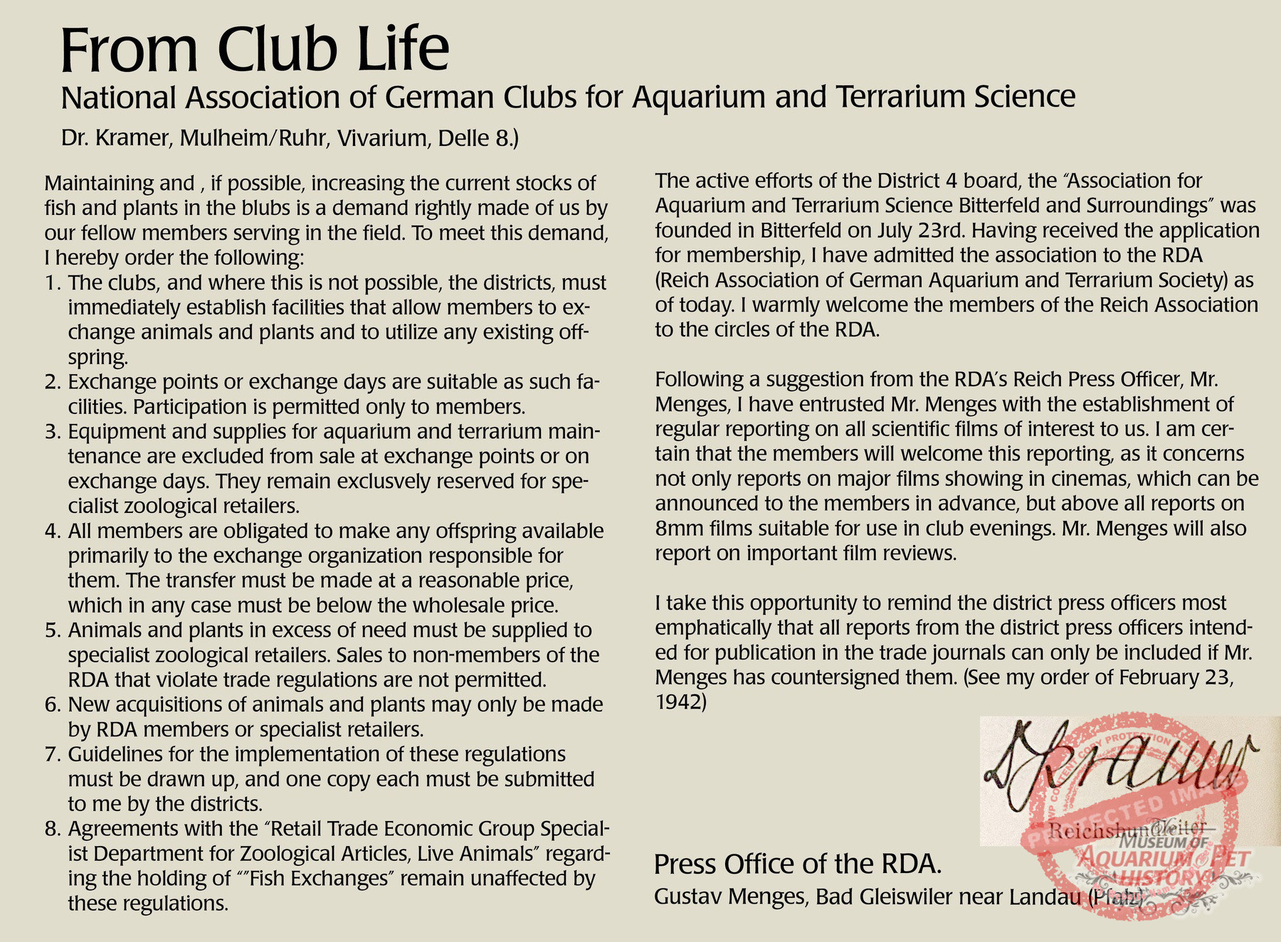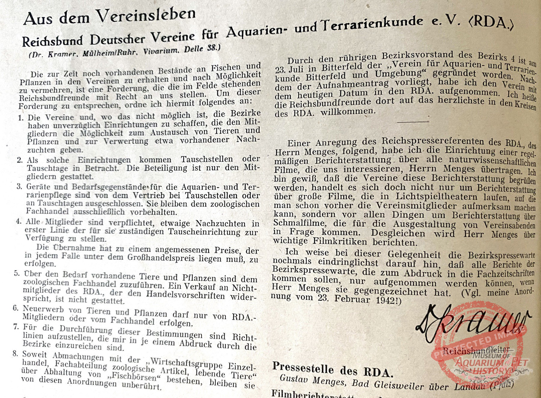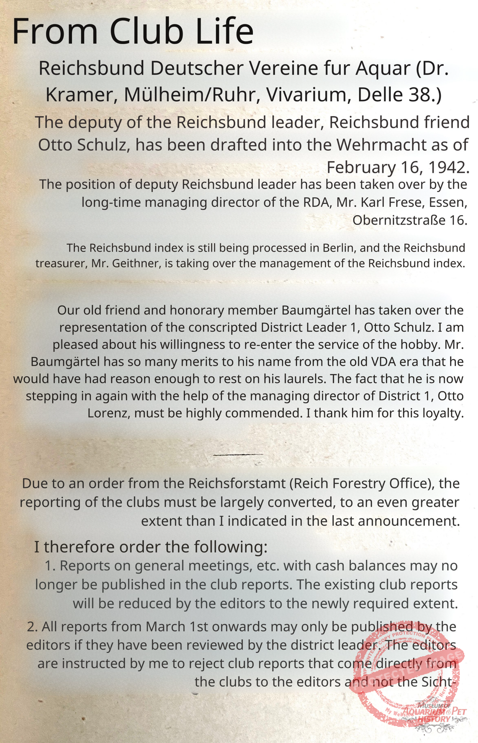 The leadership ranks of the Reichsbund of aquarists and terrarists grow visibly thinner as more members are drafted to the front; this is announced here, followed by Kramer’s directive to regional heads that he will henceforth serve as censor for all publications and that every manuscript must be submitted to him.
