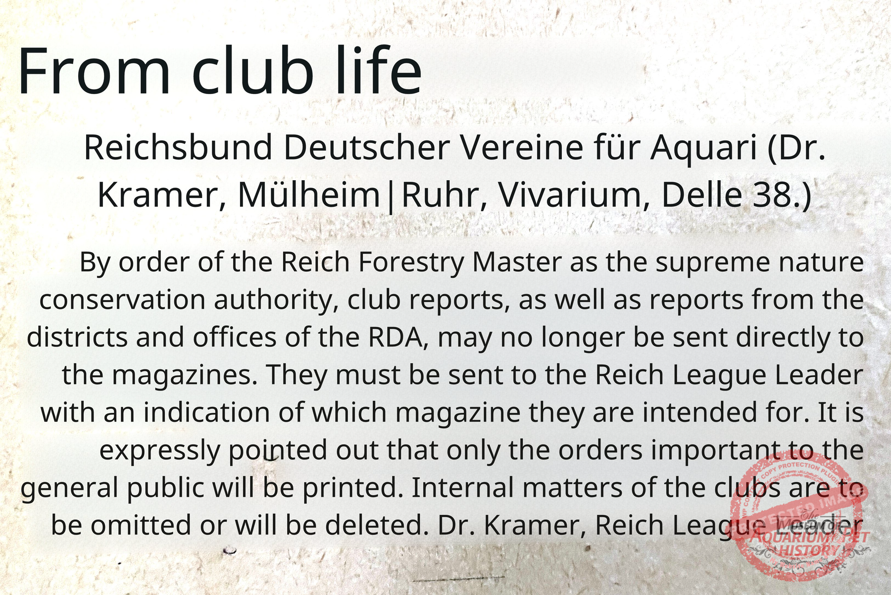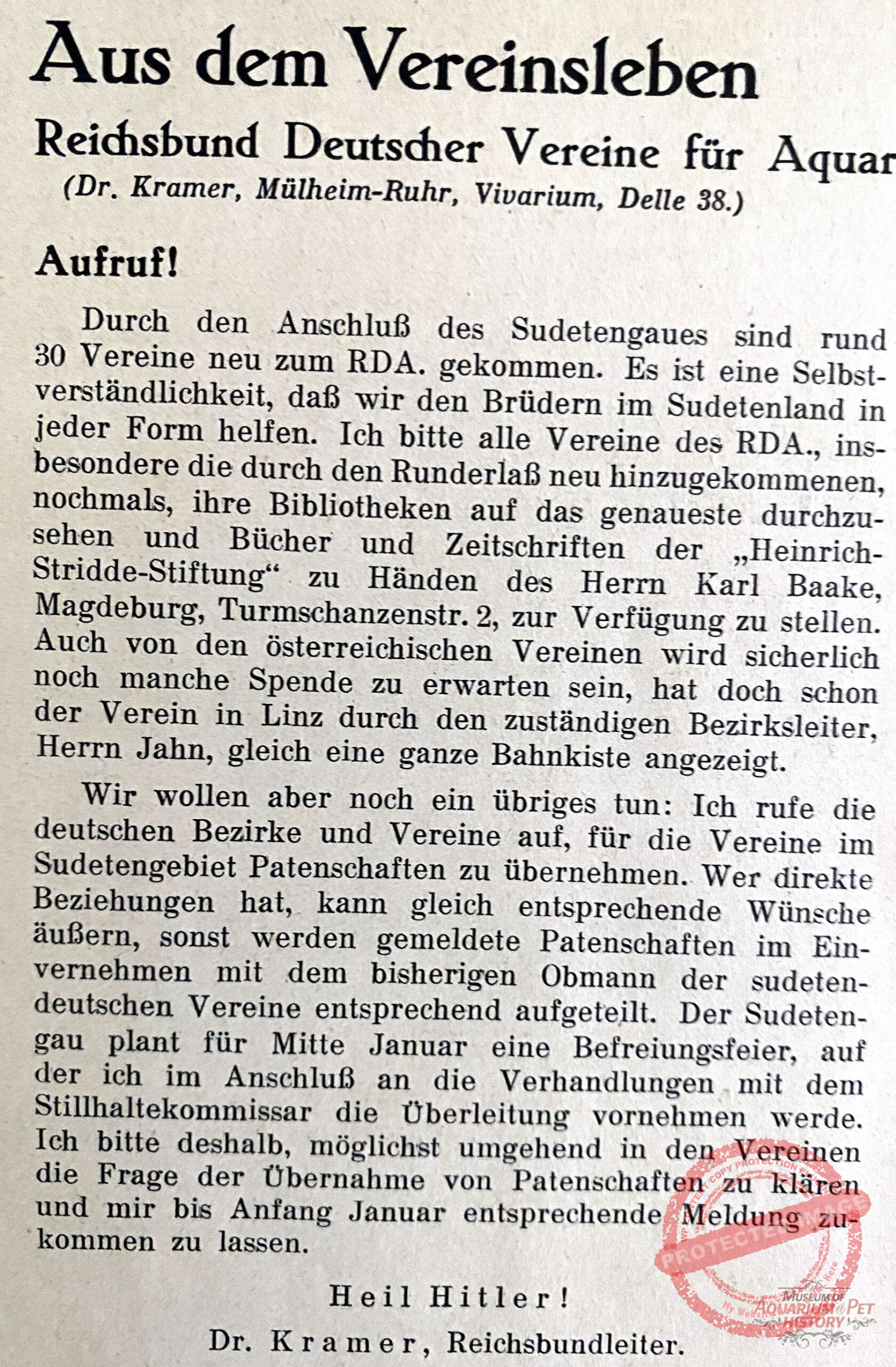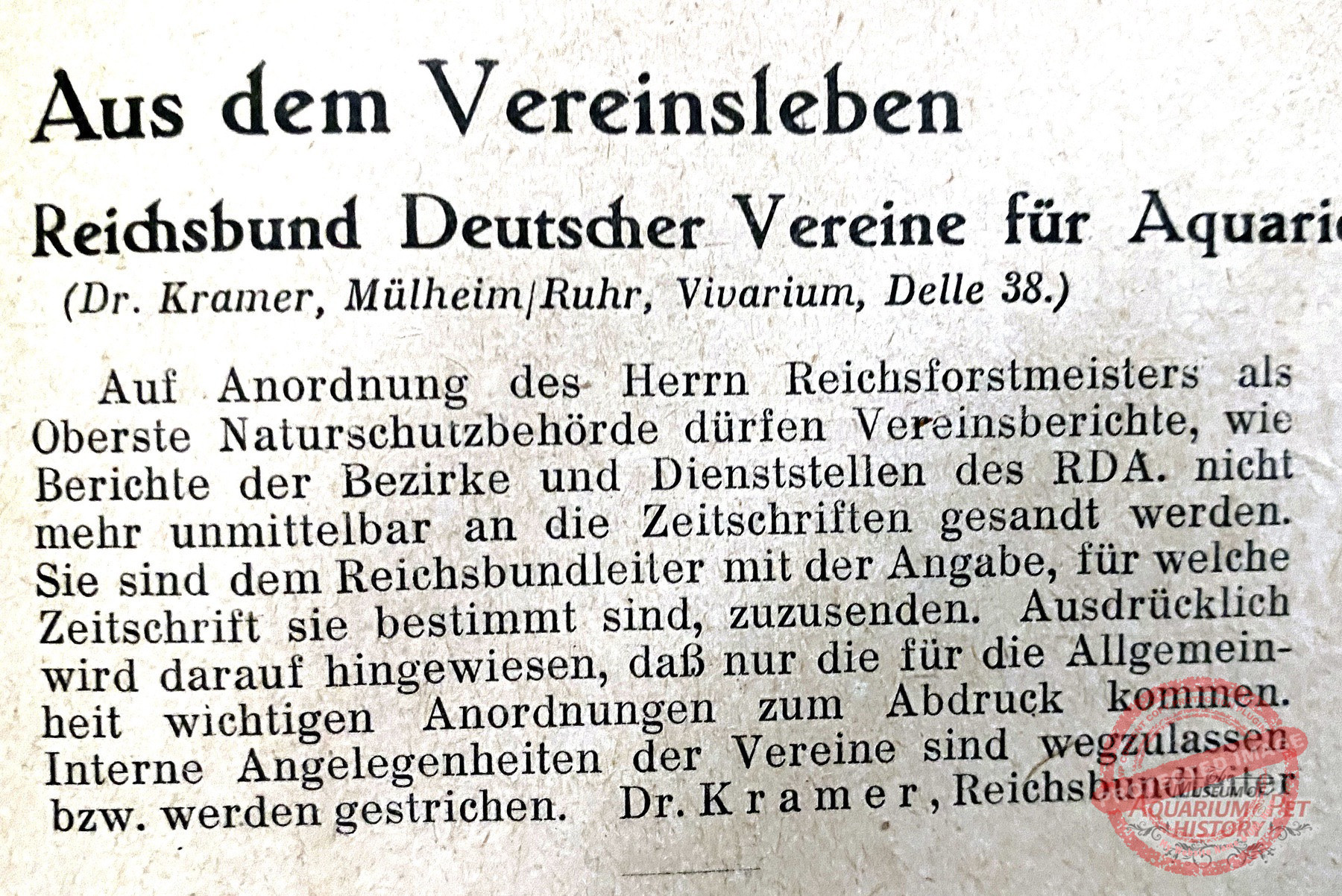 During the first year (1933) under NSDAP leadership, it became evident that a gradual “cleansing” of leadership positions within the associations took place — not only with the consent, but with the very practical support of the umbrella organization V.D.A., which at that time still bore (as it does again today) the name Verband deutscher Vereine für Aquarien- und Terrarienkunde. In the final December 1933 issue of the Wochenschrift, it still appeared under that name. At the same time, new so-called Gauführer were appointed to chair the regional groups (formerly and again today VDA-Bezirke), while the previous leaders were removed under explanations such as “he had to resign his office due to professional overwork.” Many of the dismissed chairmen were of Jewish descent or critical of the regime. Simultaneously, the sale of captive-bred aquarium fish was examined from a tax-law perspective and finely regulated — which naturally brought restrictions for hobby breeders. Already in the first January issue of the Wochenschrift, the umbrella organization appeared under the new name “Reichsverband.” The unification of language, even down to nomenclature, progressed steadily. In 1938, all remaining umbrella organizations in Germany were integrated into the “Reichsbund Deutscher Vereine für Aquarien- und Terrarienkunde” and thus brought into Gleichschaltung. Membership numbers grew through the territories annexed to the German Reich by means of threat and coercion — Austria and Czechoslovakia. The staunchly party-conforming chairman (from 1938 onward, the term “Führer” was avoided again, since one did not wish to equate such a mundane occupation with household animals ideologically with SS leaders or “the” Führer himself) of the Reichsbund announced in the Wochenschrift in 1938, following the annexation, the “Anschluss des Sudetengaues,” thereby using for hobbyists the same terminology employed by the Nazi leadership for entire territories. He concluded with a hearty: “Heil Hitler! Dr. Kramer, Reichsbundleiter.”