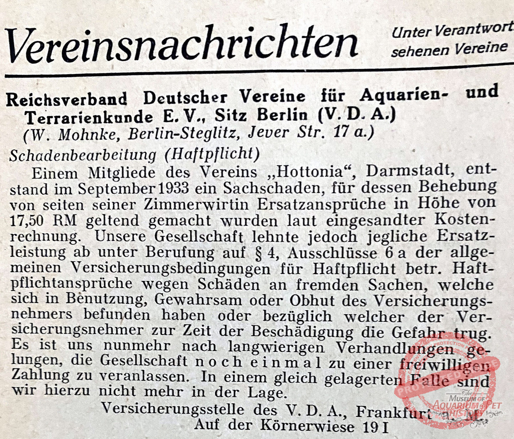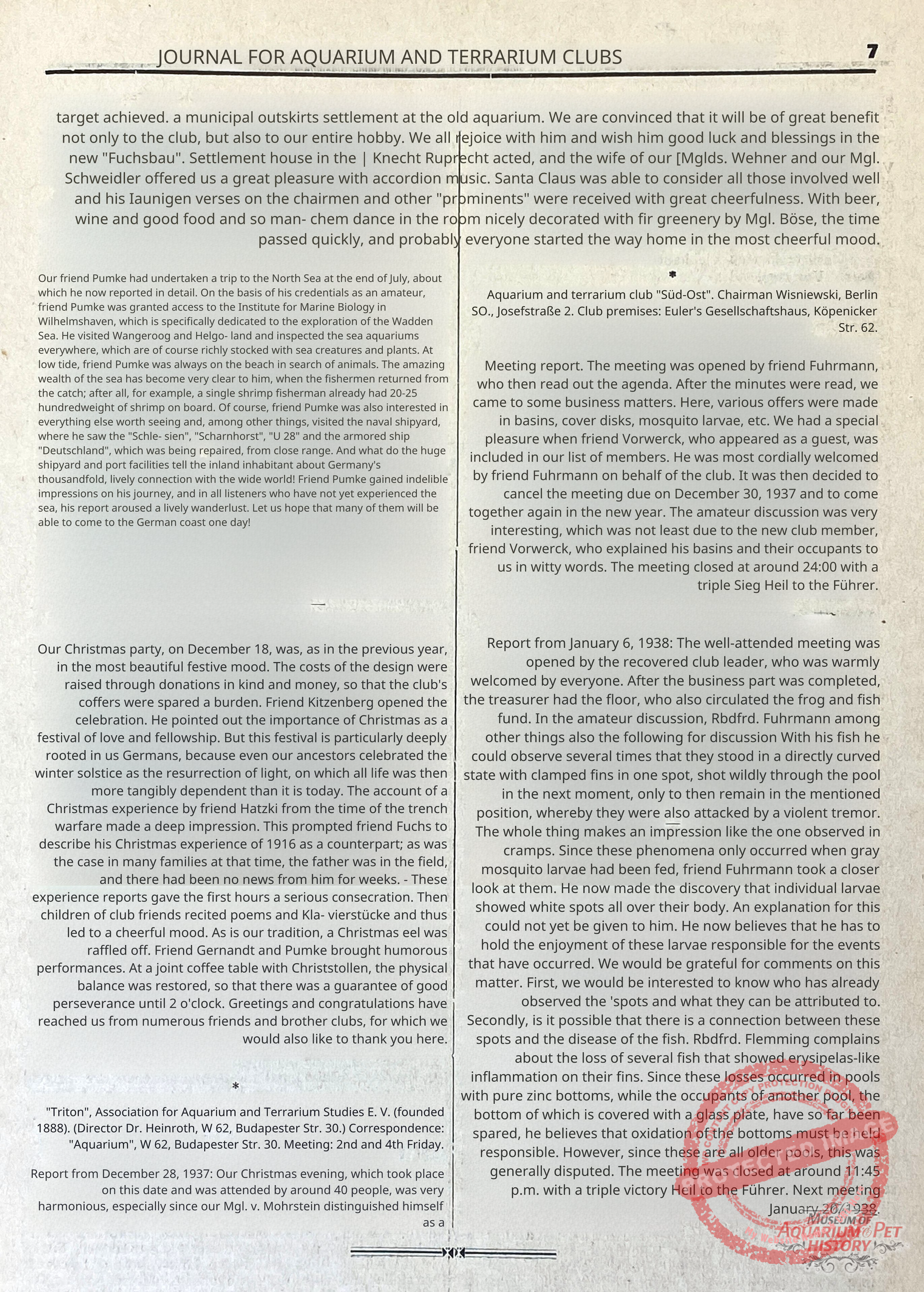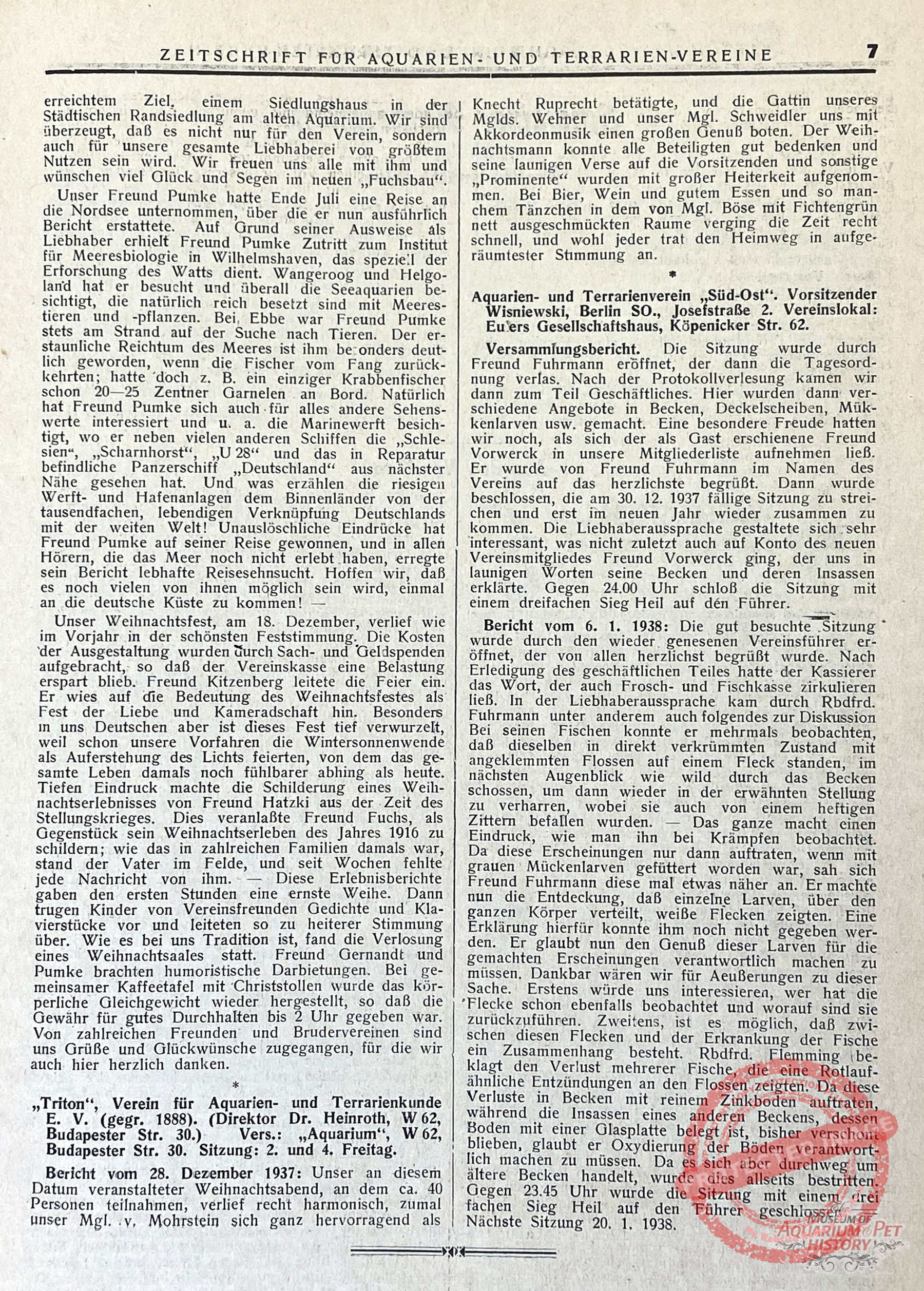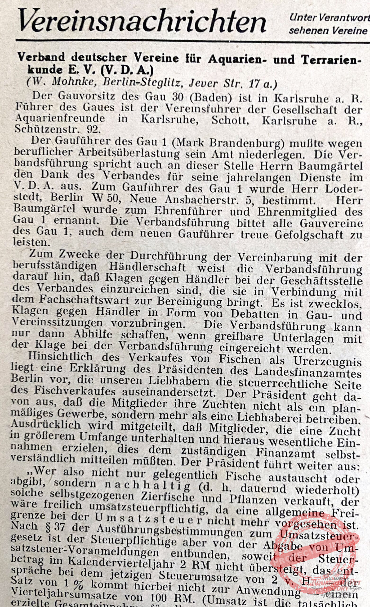 During the first year (1933) under NSDAP leadership, it became evident that a gradual “cleansing” of leadership positions within the associations took place — not only with the consent, but with the very practical support of the umbrella organization V.D.A., which at that time still bore (as it does again today) the name Verband deutscher Vereine für Aquarien- und Terrarienkunde. In the final December 1933 issue of the Wochenschrift, it still appeared under that name. At the same time, new so-called Gauführer were appointed to chair the regional groups (formerly and again today VDA-Bezirke), while the previous leaders were removed under explanations such as “he had to resign his office due to professional overwork.” Many of the dismissed chairmen were of Jewish descent or critical of the regime. Simultaneously, the sale of captive-bred aquarium fish was examined from a tax-law perspective and finely regulated — which naturally brought restrictions for hobby breeders. Already in the first January issue of the Wochenschrift, the umbrella organization appeared under the new name “Reichsverband.” The unification of language, even down to nomenclature, progressed steadily. In 1938, all remaining umbrella organizations in Germany were integrated into the “Reichsbund Deutscher Vereine für Aquarien- und Terrarienkunde” and thus brought into Gleichschaltung. Membership numbers grew through the territories annexed to the German Reich by means of threat and coercion — Austria and Czechoslovakia. The staunchly party-conforming chairman (from 1938 onward, the term “Führer” was avoided again, since one did not wish to equate such a mundane occupation with household animals ideologically with SS leaders or “the” Führer himself) of the Reichsbund announced in the Wochenschrift in 1938, following the annexation, the “Anschluss des Sudetengaues,” thereby using for hobbyists the same terminology employed by the Nazi leadership for entire territories. He concluded with a hearty: “Heil Hitler! Dr. Kramer, Reichsbundleiter.”
