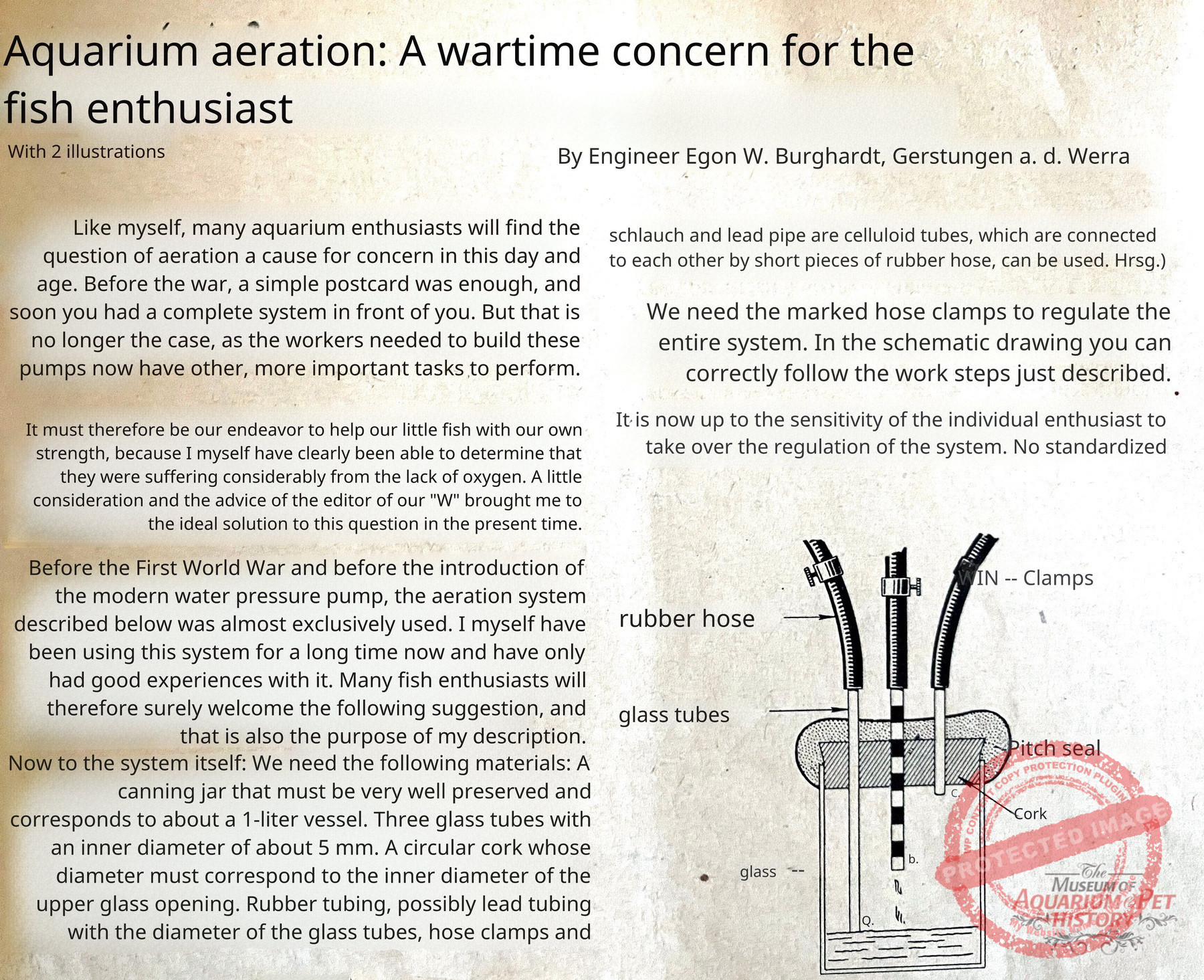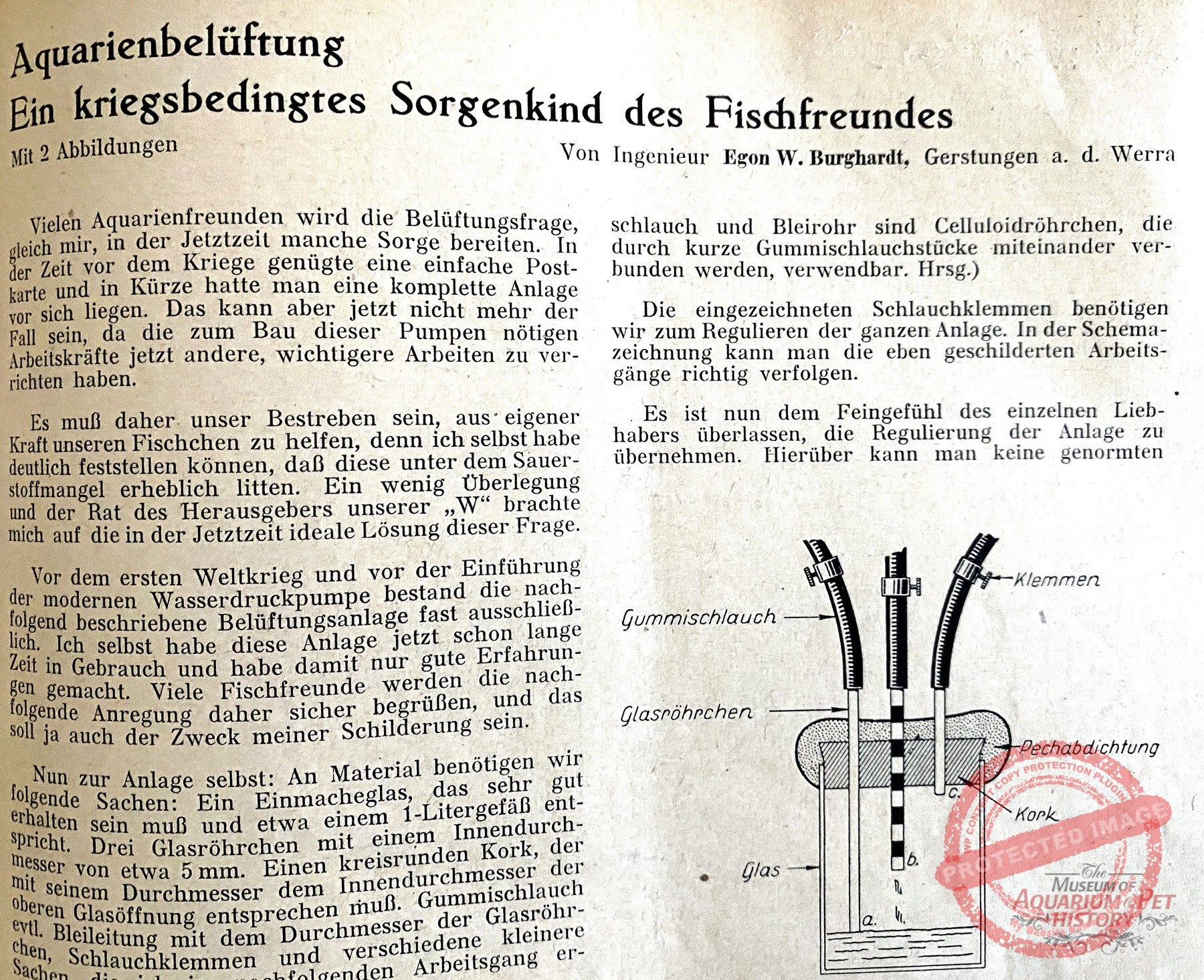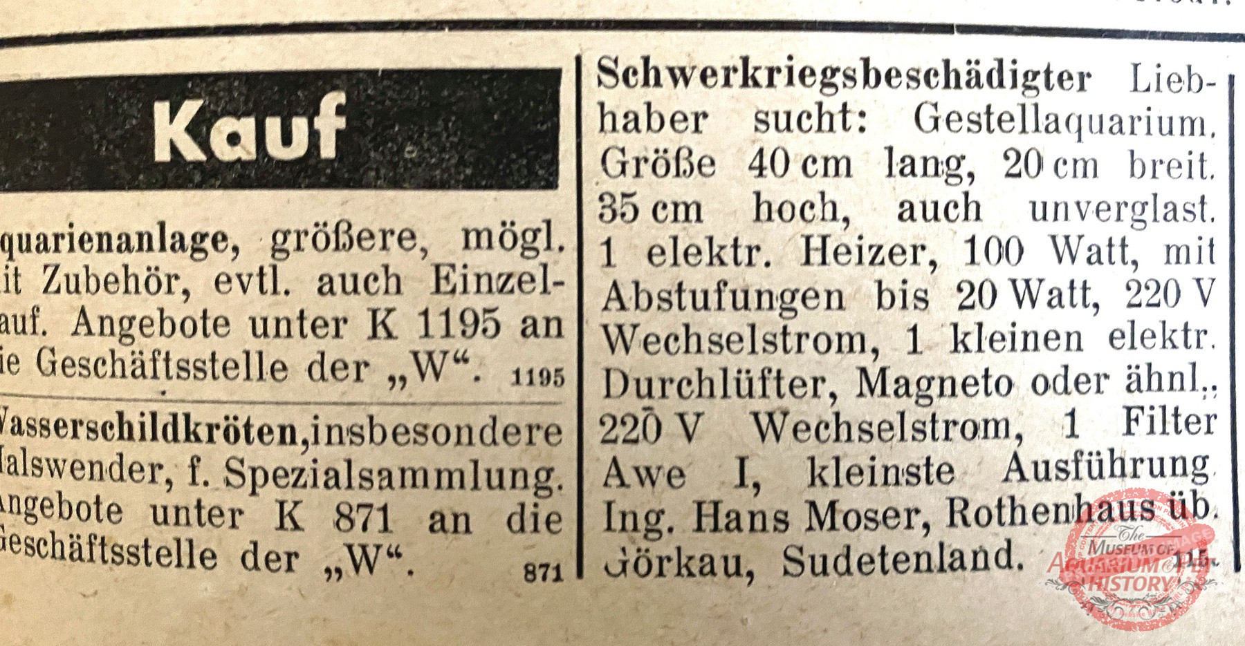 In 1944, some severely wounded soldiers had returned and attempted to resume aquaristics. An advertisement in the Wochenschrift from Hans Moser of the Sudetenland (today again part of the Czech Republic) reads: “Severely war-disabled enthusiast seeks: framed aquarium, 40cm long (16 inches), 20 cm wide (8 inches), 35 cm high (14 cm), even without glass; one electric heater, 100 watts…”