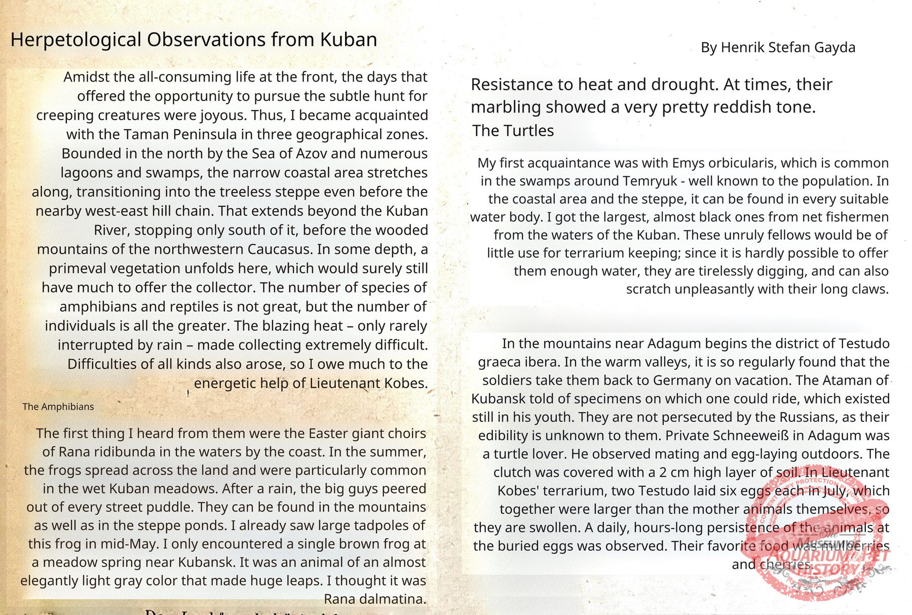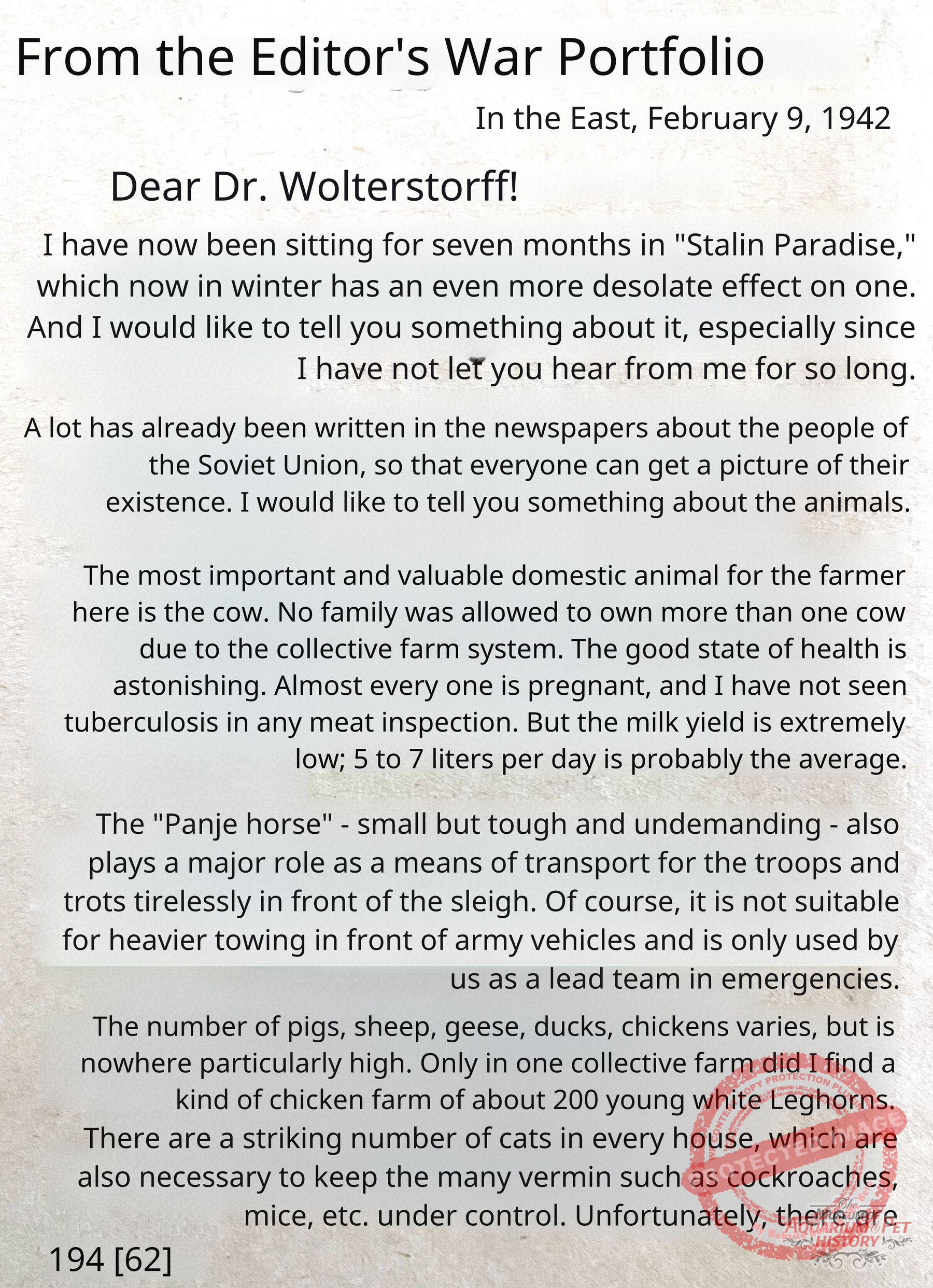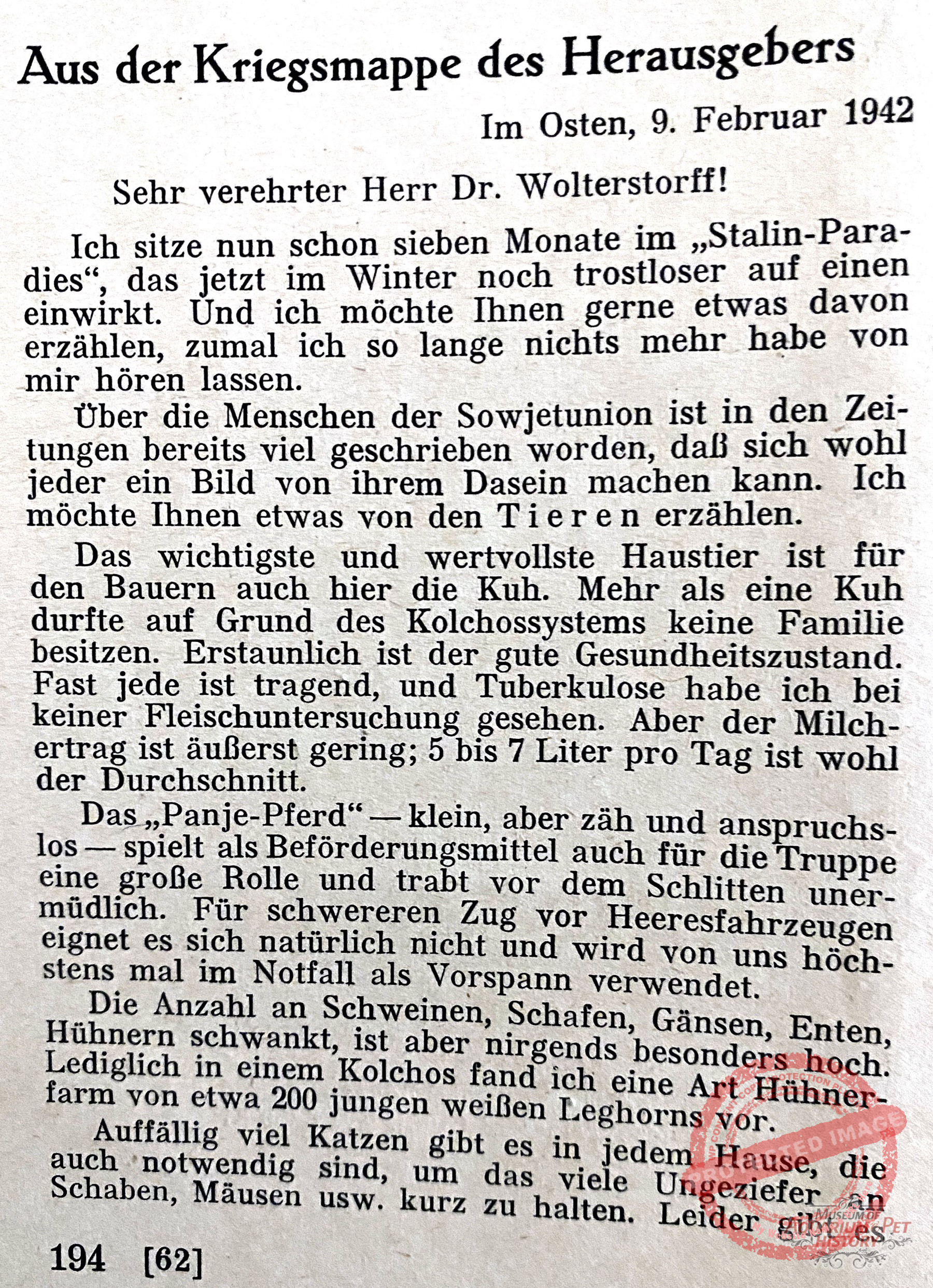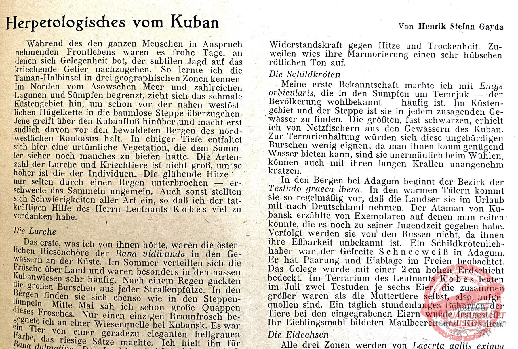 “Even 1000 kilometers deep into Russia. In our beautiful Germany we have experienced quite cold winters, but not down to 52° below zero. Snow meters high, lakes and rivers frozen meters thick. And yet spring must also come here!” For many, it never did. The Russian winter of 1942/43 was the death blow to German aggression in the East and claimed the lives of many German soldiers. A letter to Dr. Willy Wolterstorff titled “From the War File of the Editor” reads: “In the East, February 1942… I have now been in ‘Stalin’s Paradise’ for seven months, which in winter is even more desolate. … Much has already been written in newspapers about the people of the Soviet Union, so everyone can form an impression of their existence. I would like to tell you something about the animals.” It sounds bitter, partly sarcastic, and the writer, against better knowledge, lacks the courage to tell the truth about the people. Reading the aquarium and terrarium journals of those years, one can, despite censorship, learn about the mental state, the difficult situation, and the hardships of people, often about matters far beyond the hobby. In times of crisis, niche media like the Wochenschrift became relatively lightly censored outlets for nonconformists.