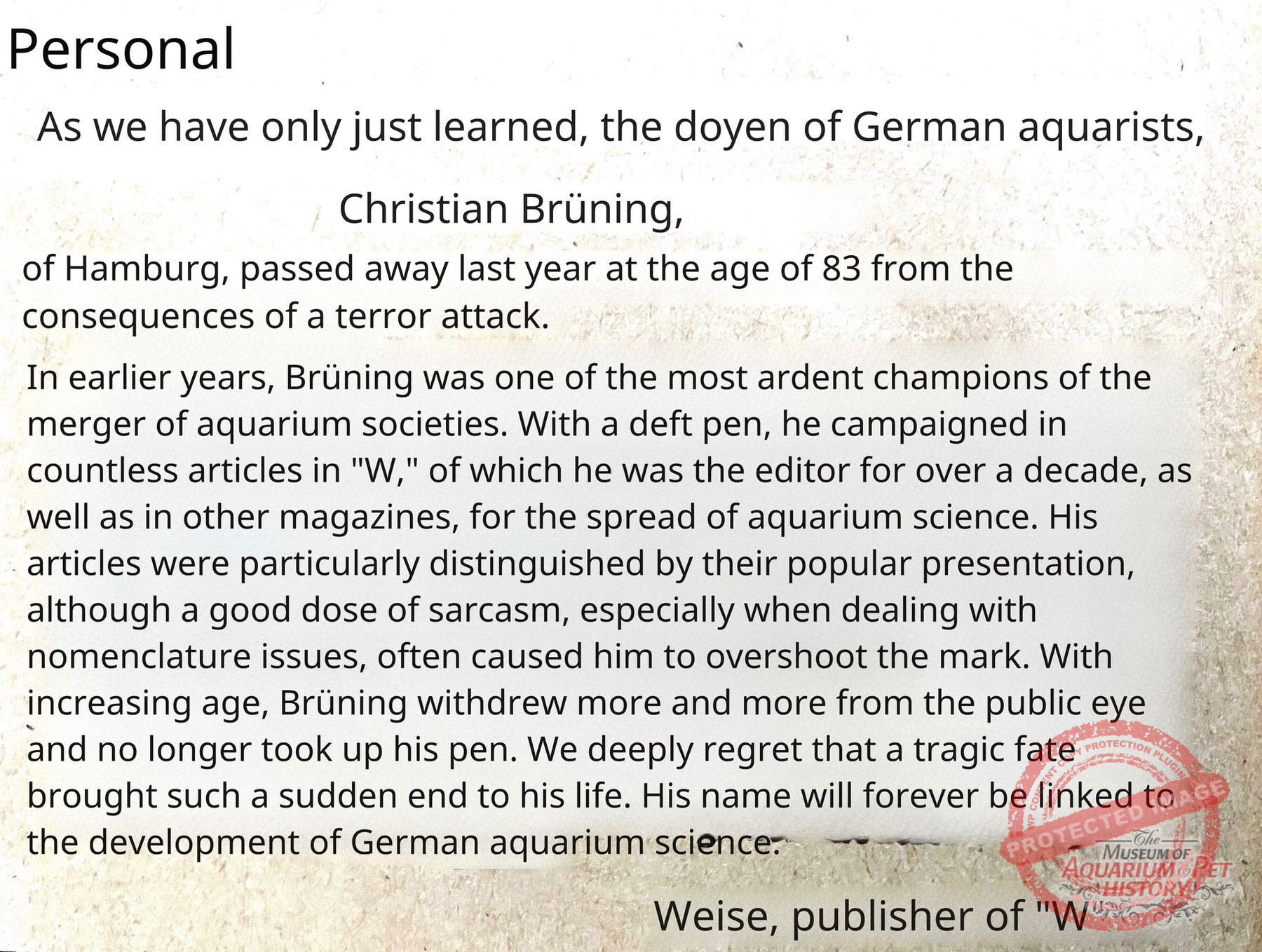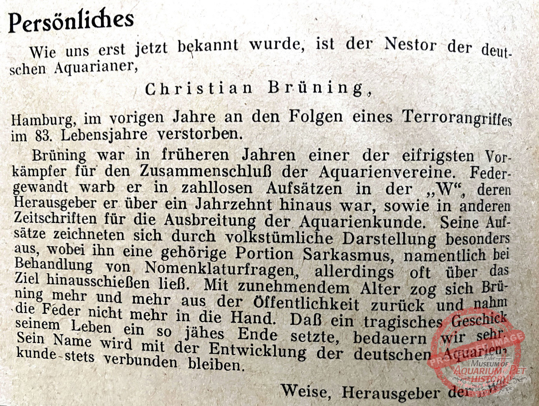 By 1943, death notices appear ever more frequently in the Wochenschrift; among them that of the doyen of German aquarists and former editor of the journal, Christian Brüning, who perished in Hamburg during a bombing raid at the age of eighty-three.